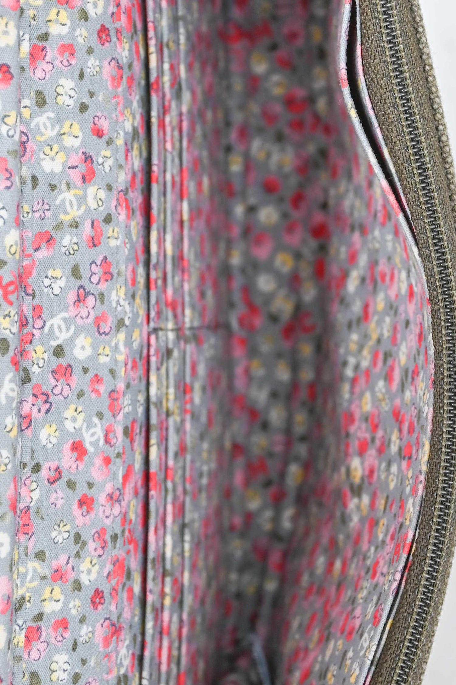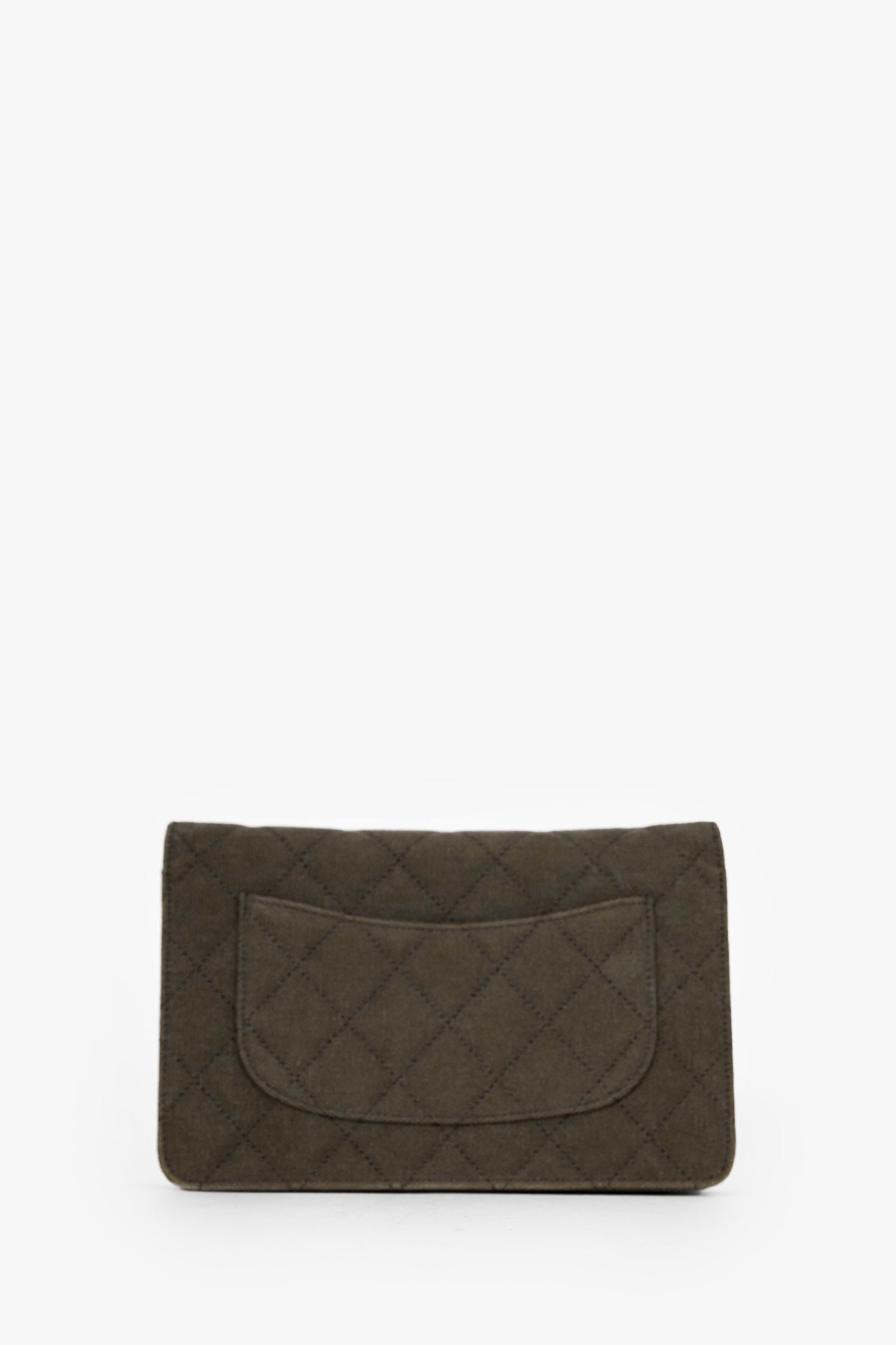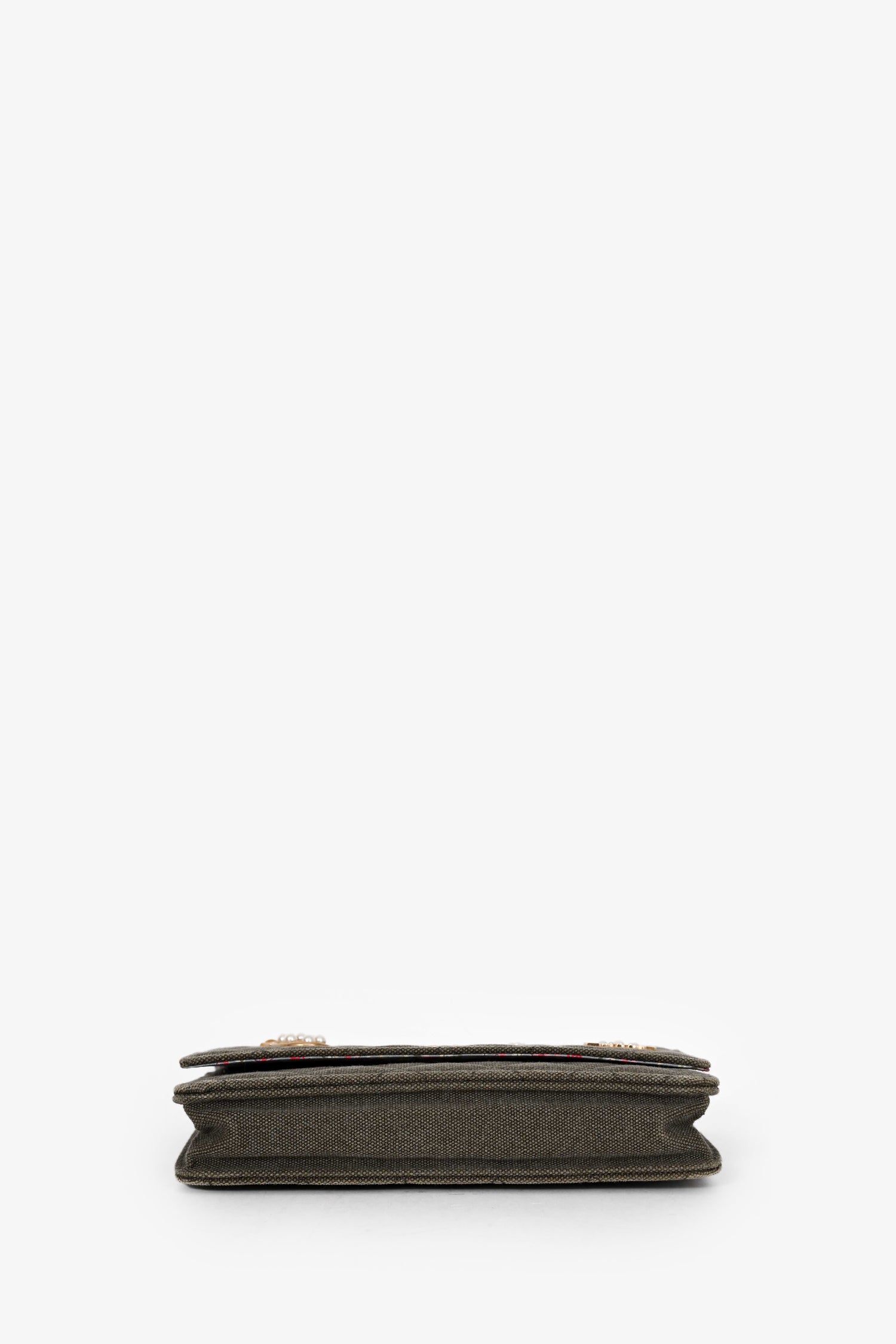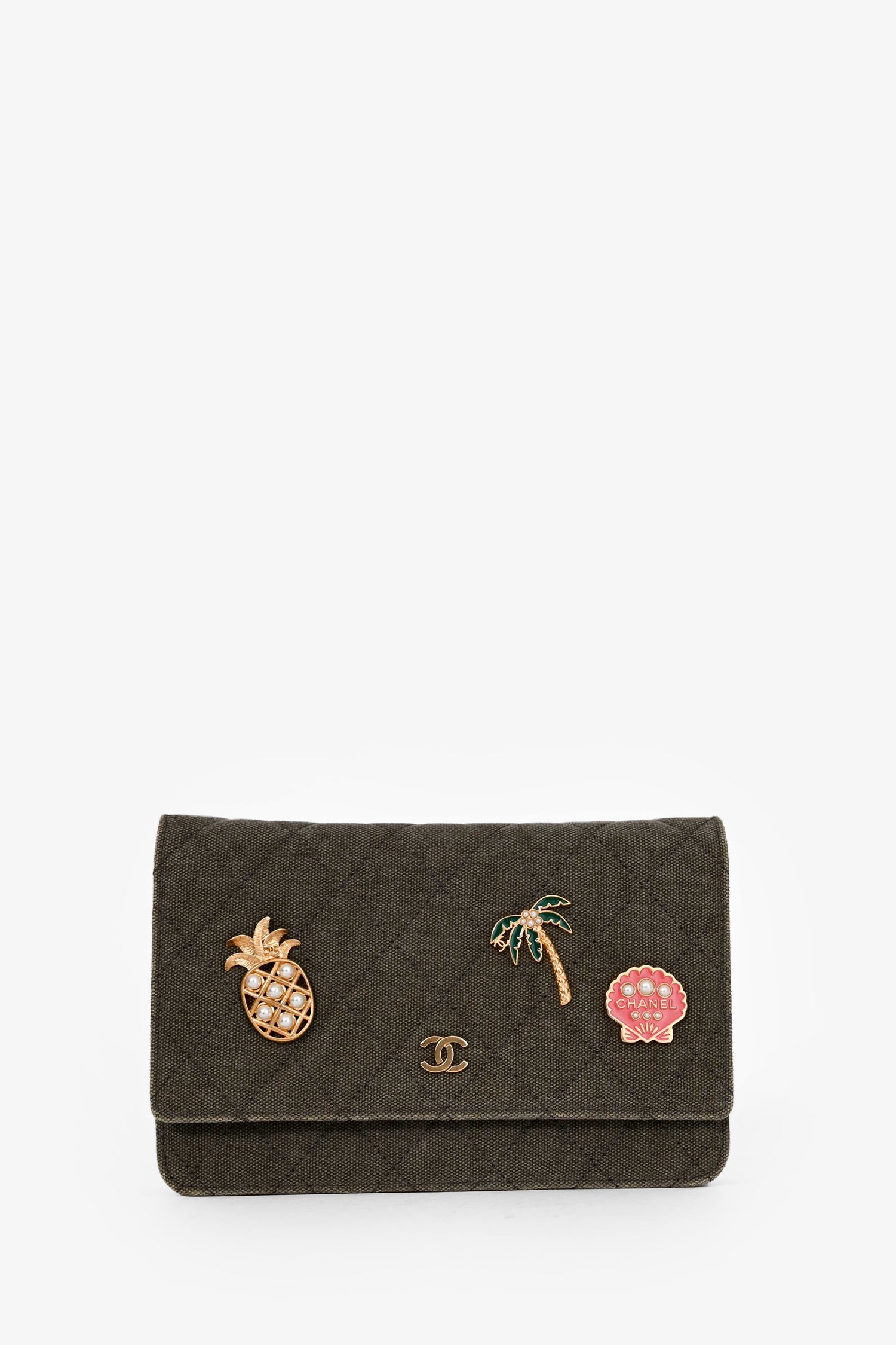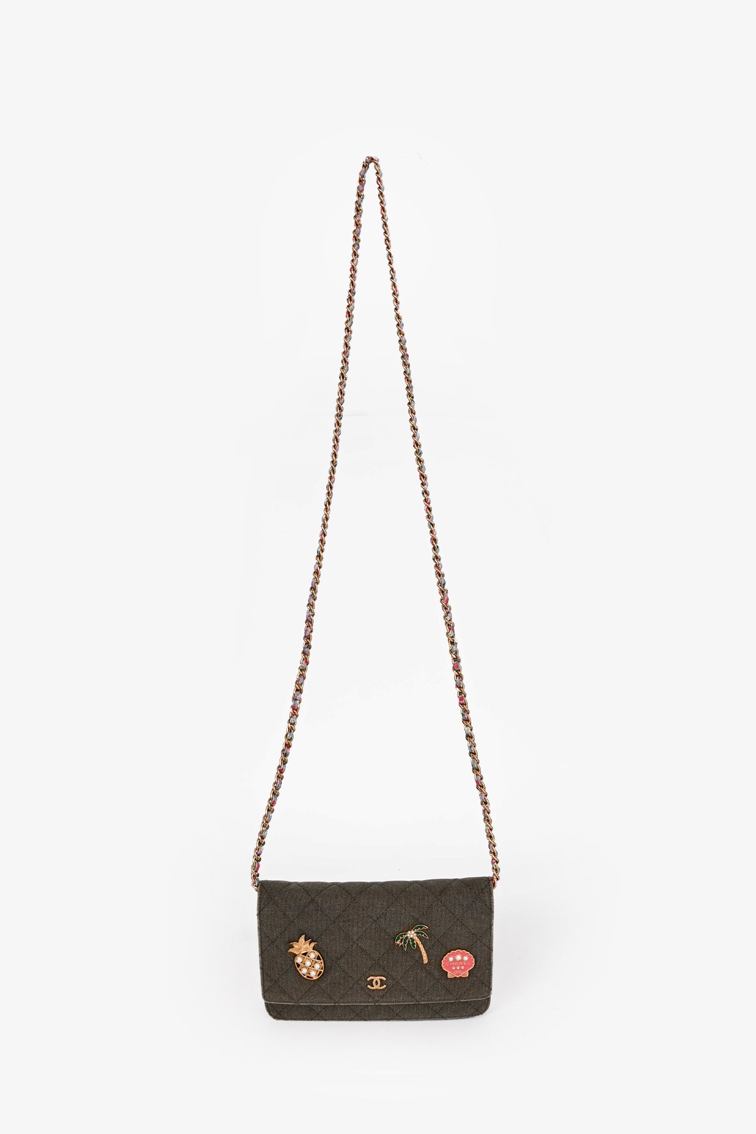 Pre-Loved Chanel™ 2017 Khaki Green Denim Coco Cuba Charm Wallet On Chain. Front fold-over flap with magnetic button closure. Front slip pocket. Floral logo'd textile interior lining. Six card slots. Two billfold compartments. Zippered coin compartment. Zippered pocket at the interior of the front flap. Gold-tone hardware. Slide-around chain strap.