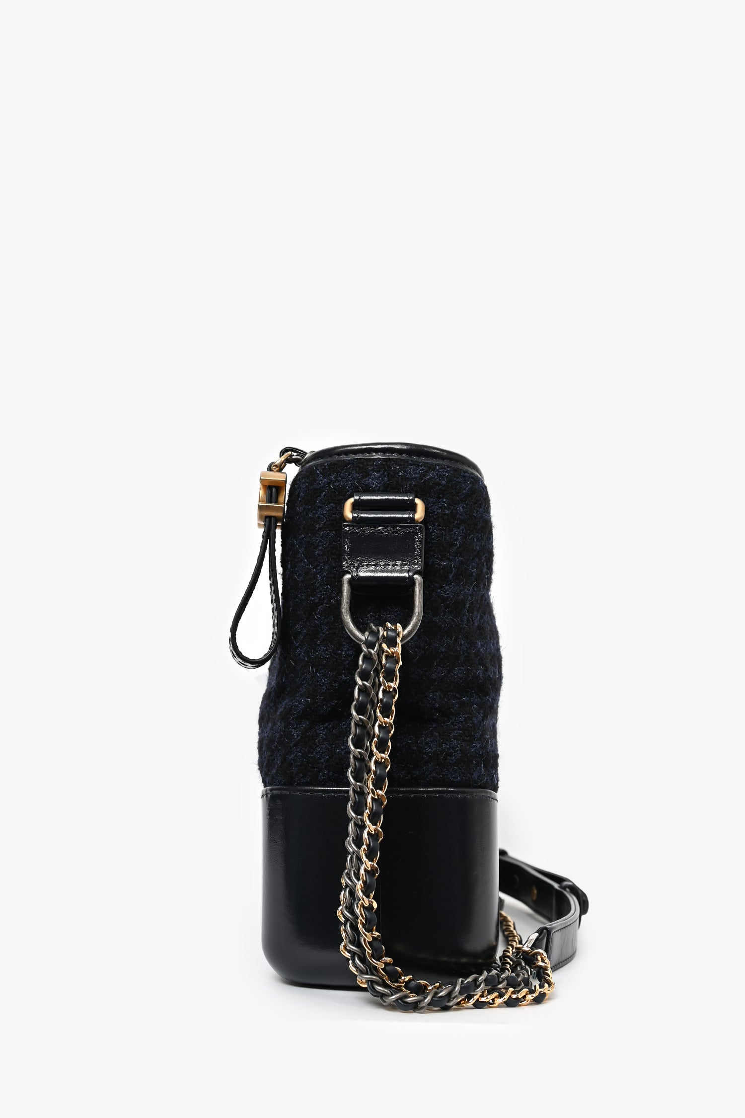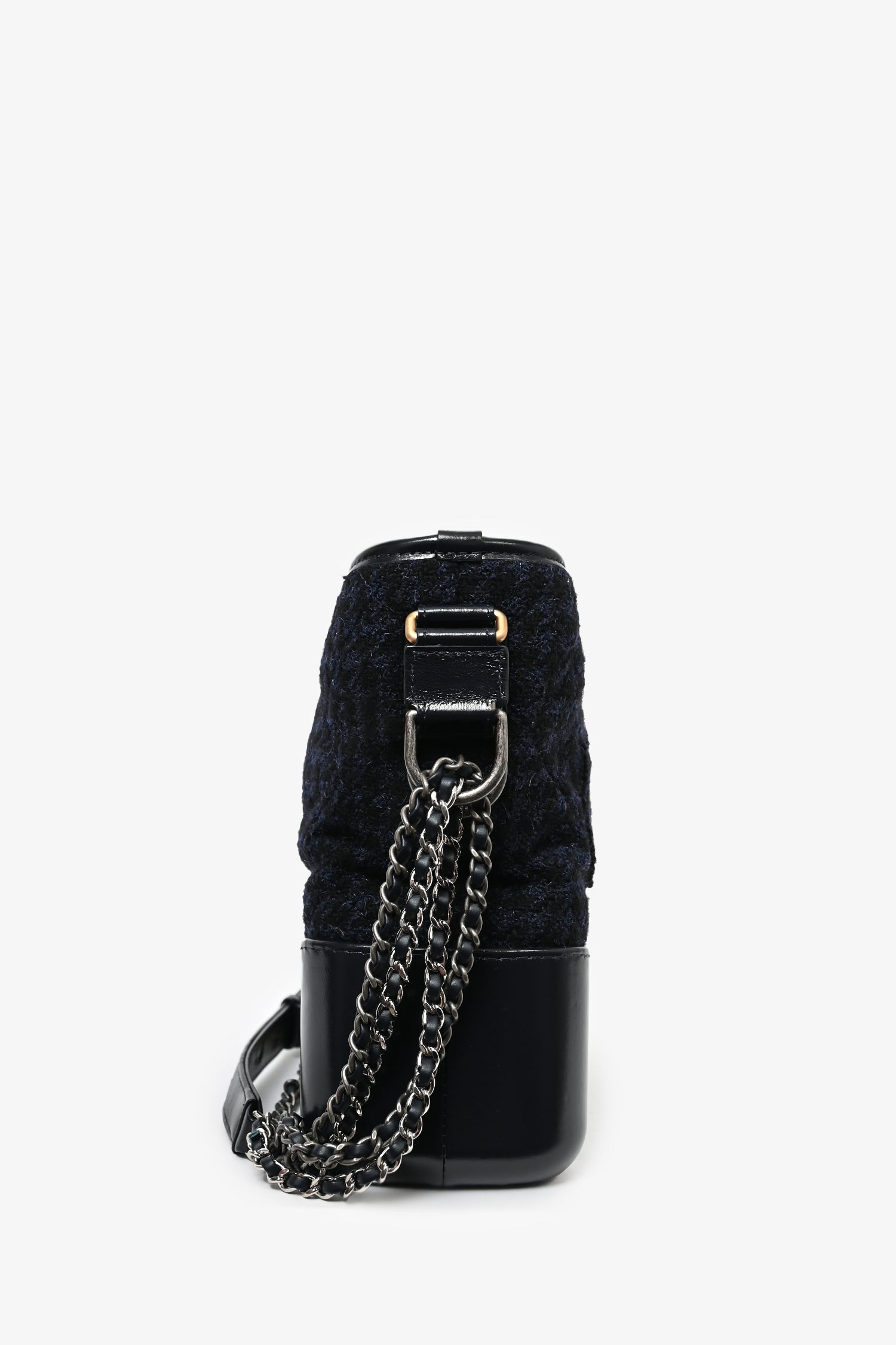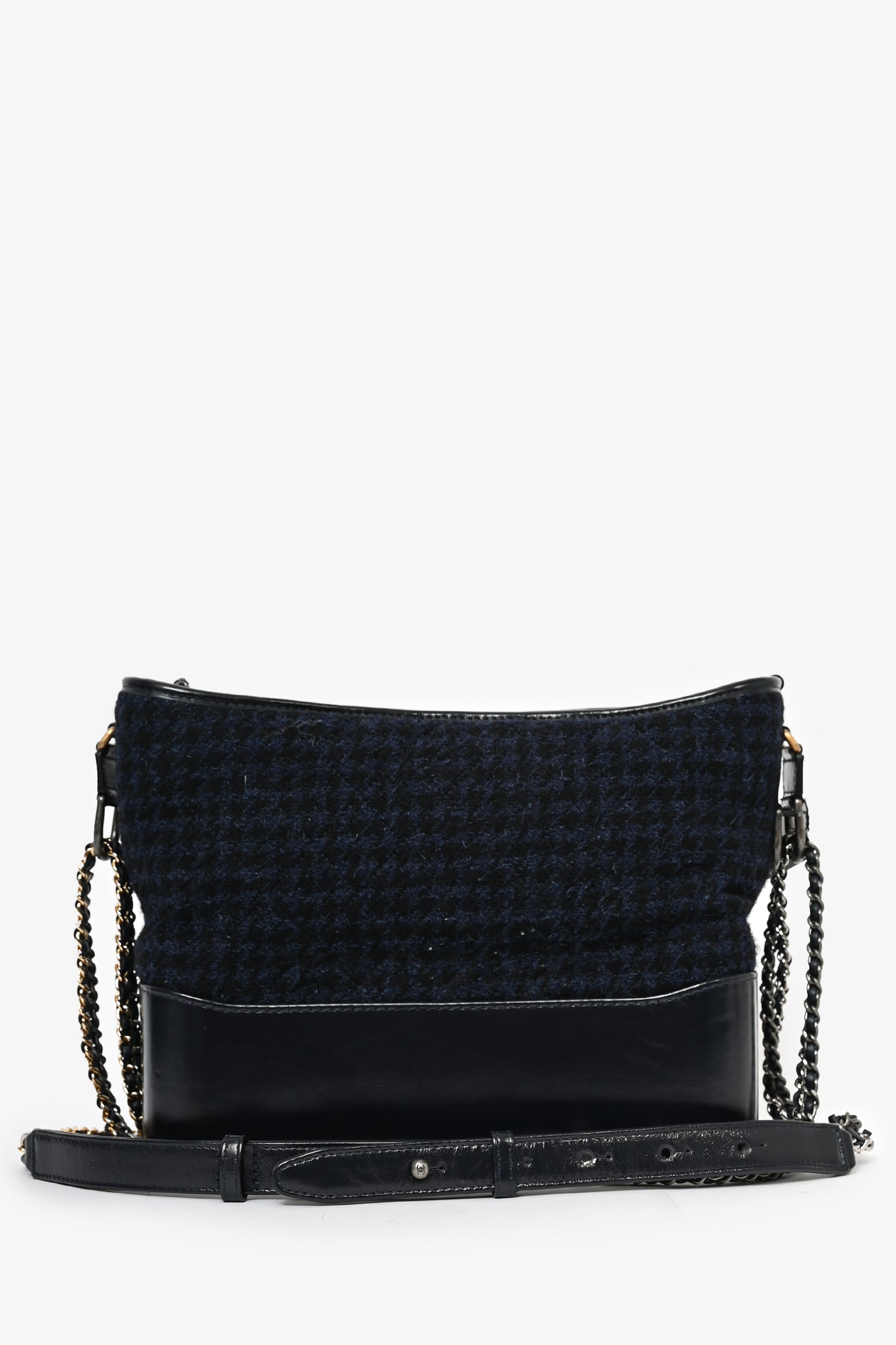 Refresh availabilityPre-loved Chanel™ 2017 Navy/Black Tweed Hobo Large Gabrielle Crossbody Bag. Single gold/silver-tone and antiqued silver-tone crossbody straps. Leather trimming. Tweed outer. Upper zipped top. Lined interior with a zipped compartment and 2 pockets. Tonal stitching.