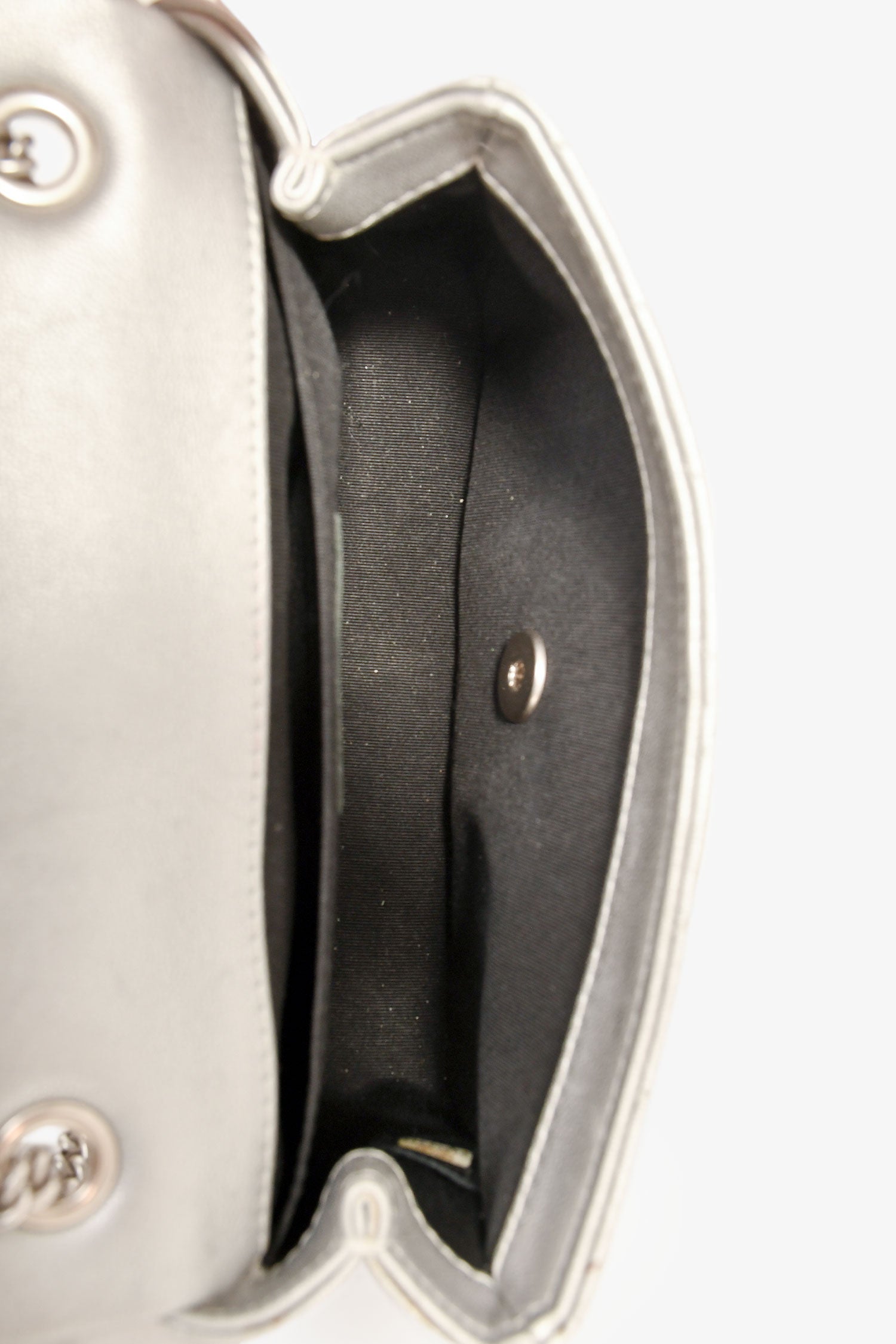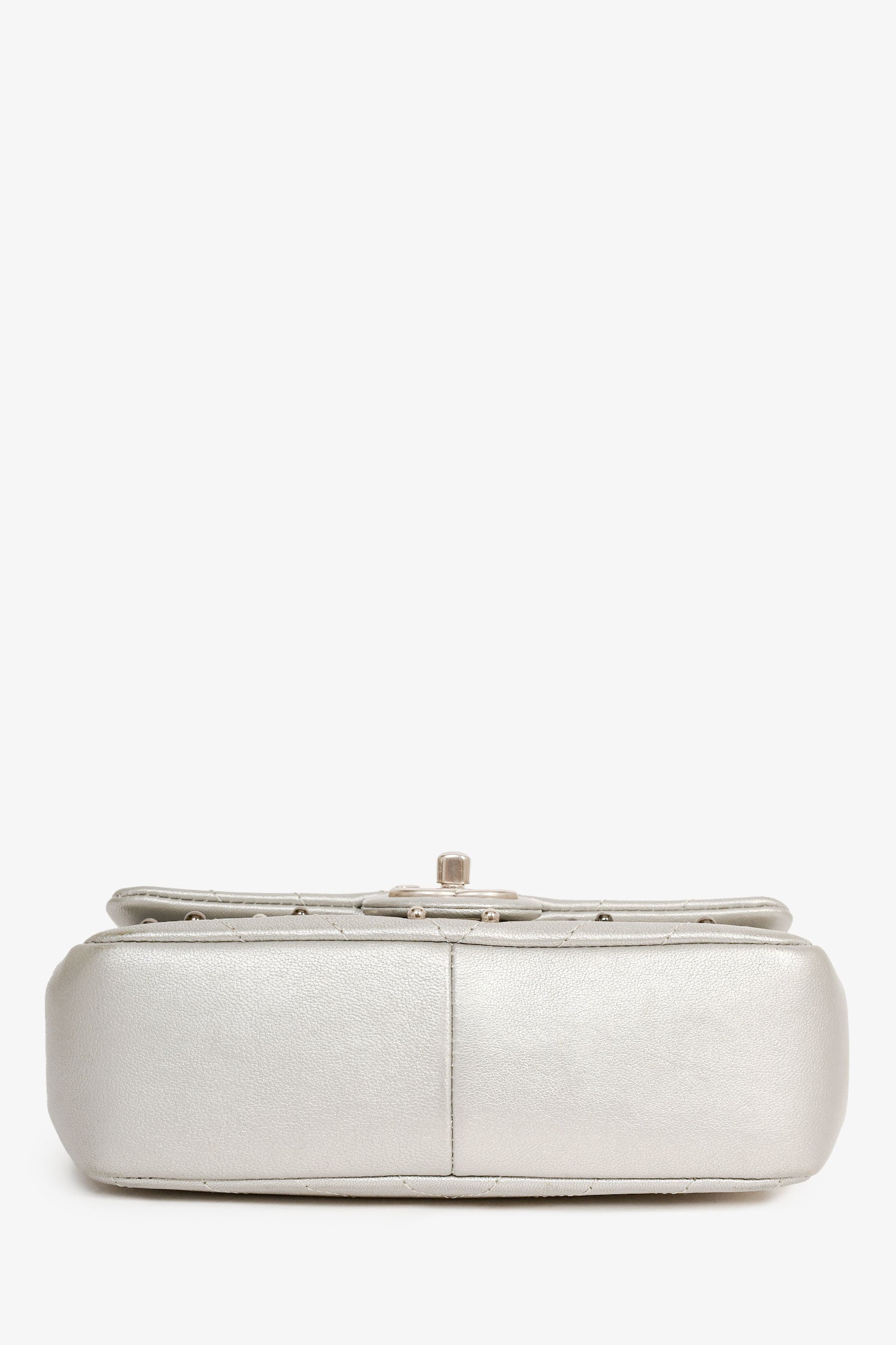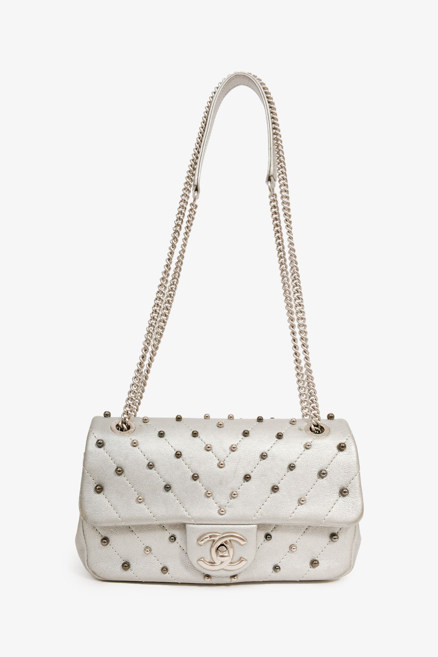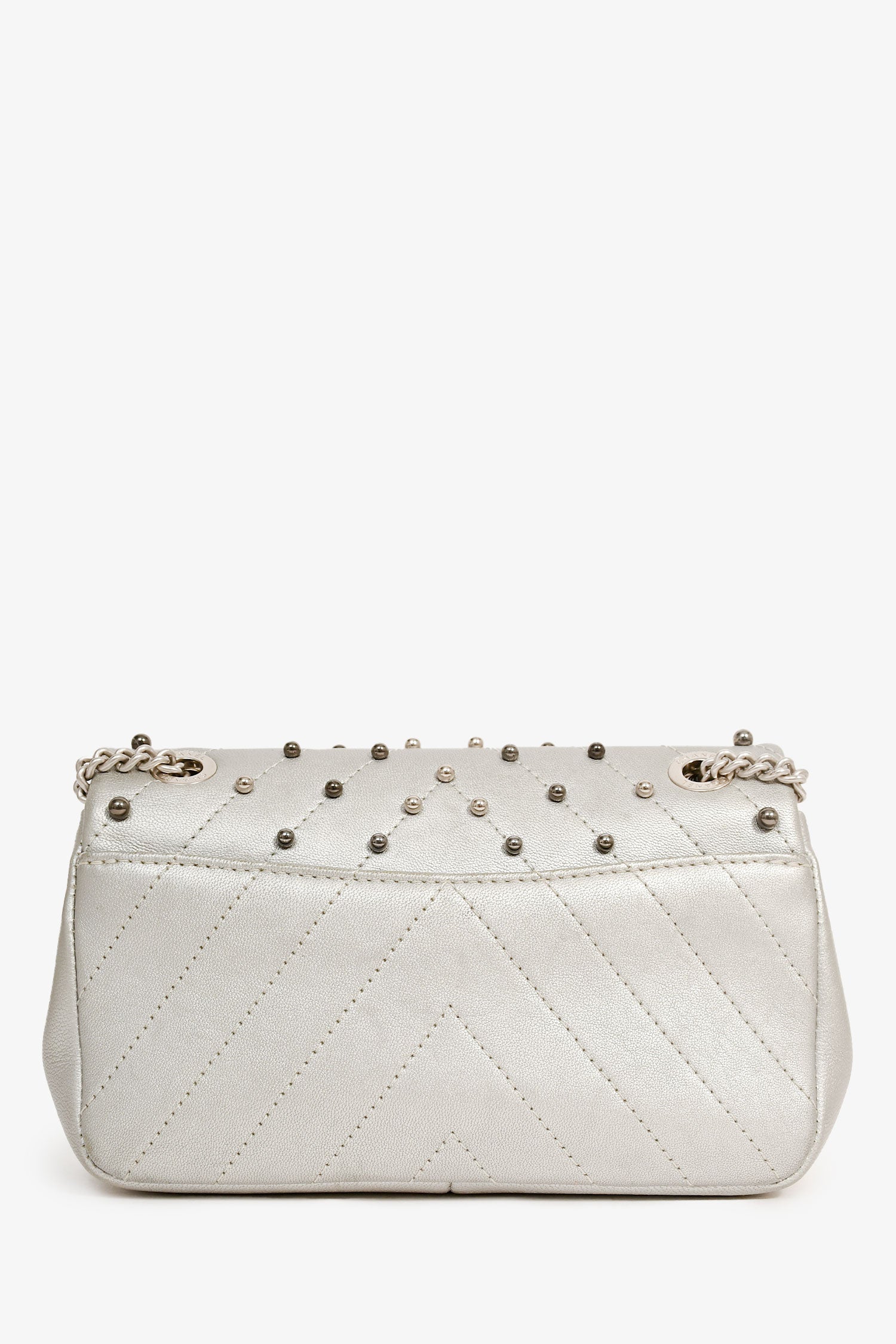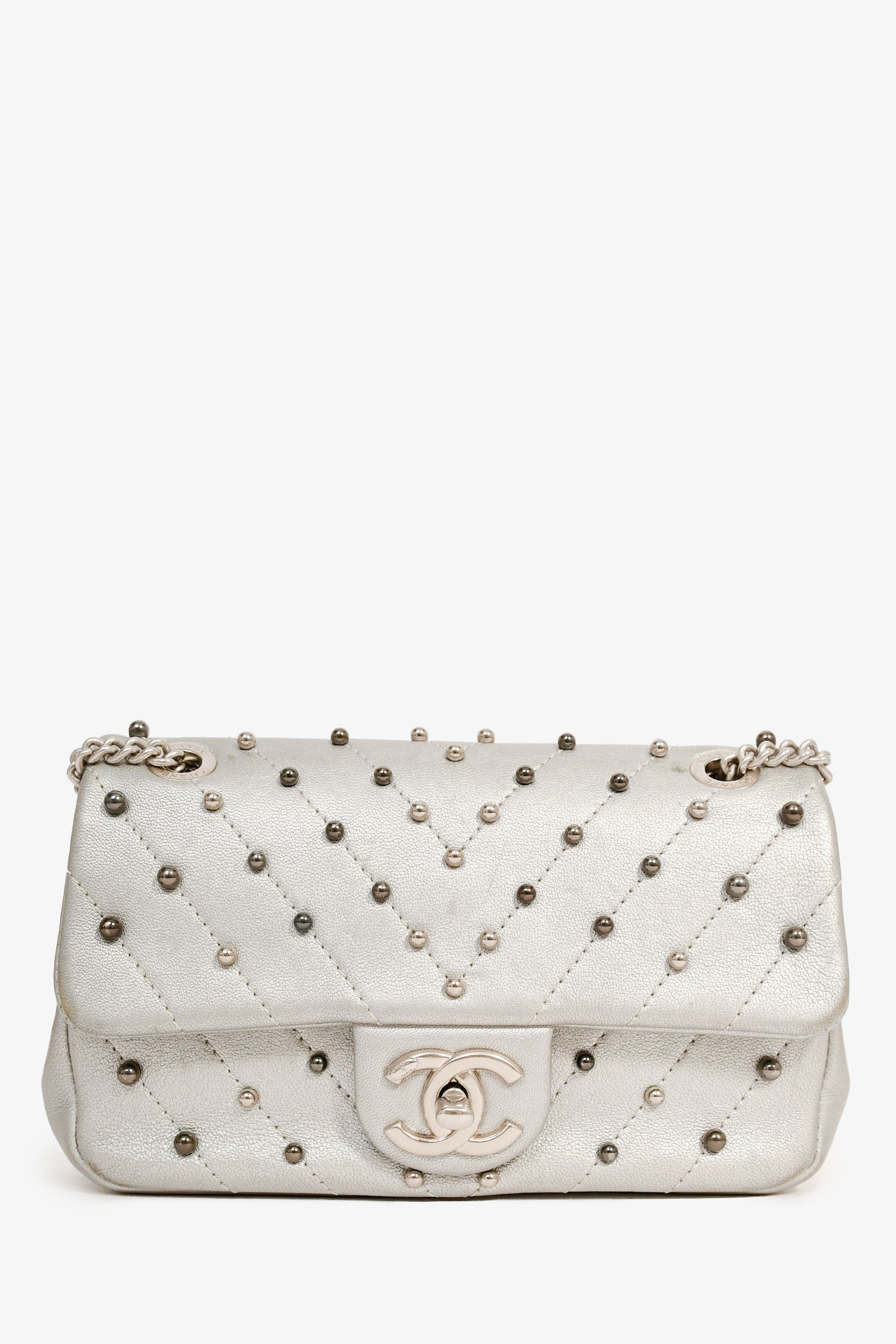 Refresh availabilityPre-Loved Chanel™ 2017 Silver Chevron 'Stud Wars Mini Rectangular Flap' Shoulder Bag. Fold-over flap with a turn-lock closure. Silver-tone hardware. Beaded embellishment. Lined interior with a slip compartment. Chain-link shoulder strap. Tonal stitching.