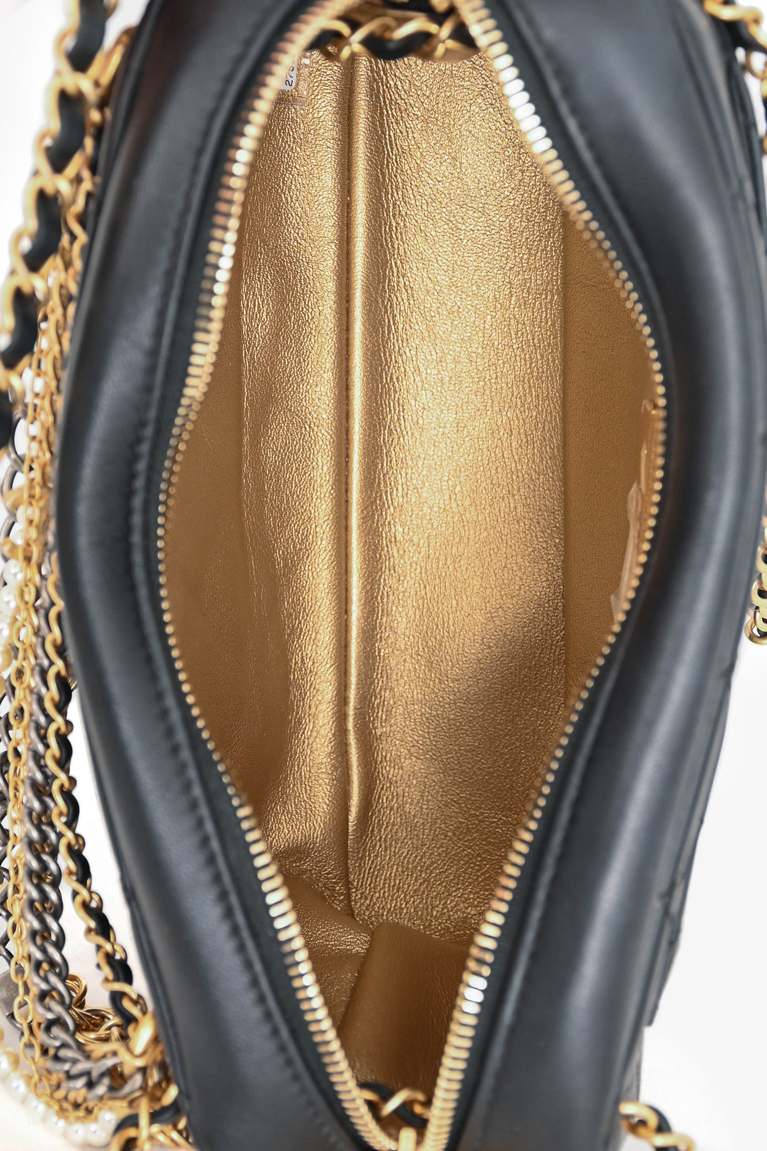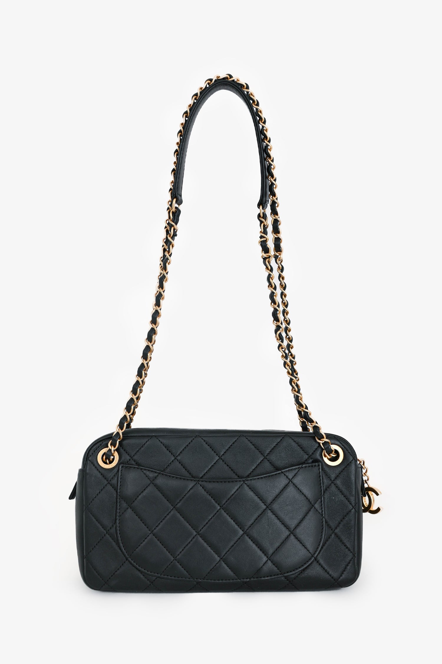 Pre-Loved Chanel™ 2018-19 Black Leather Quilted All About Chain Camera Bag. Top zip closure. Gold leather interior. Single interior wall zip pocket. Exterior rear slip pocket. Slide-around chain. Gold-tone hardware.