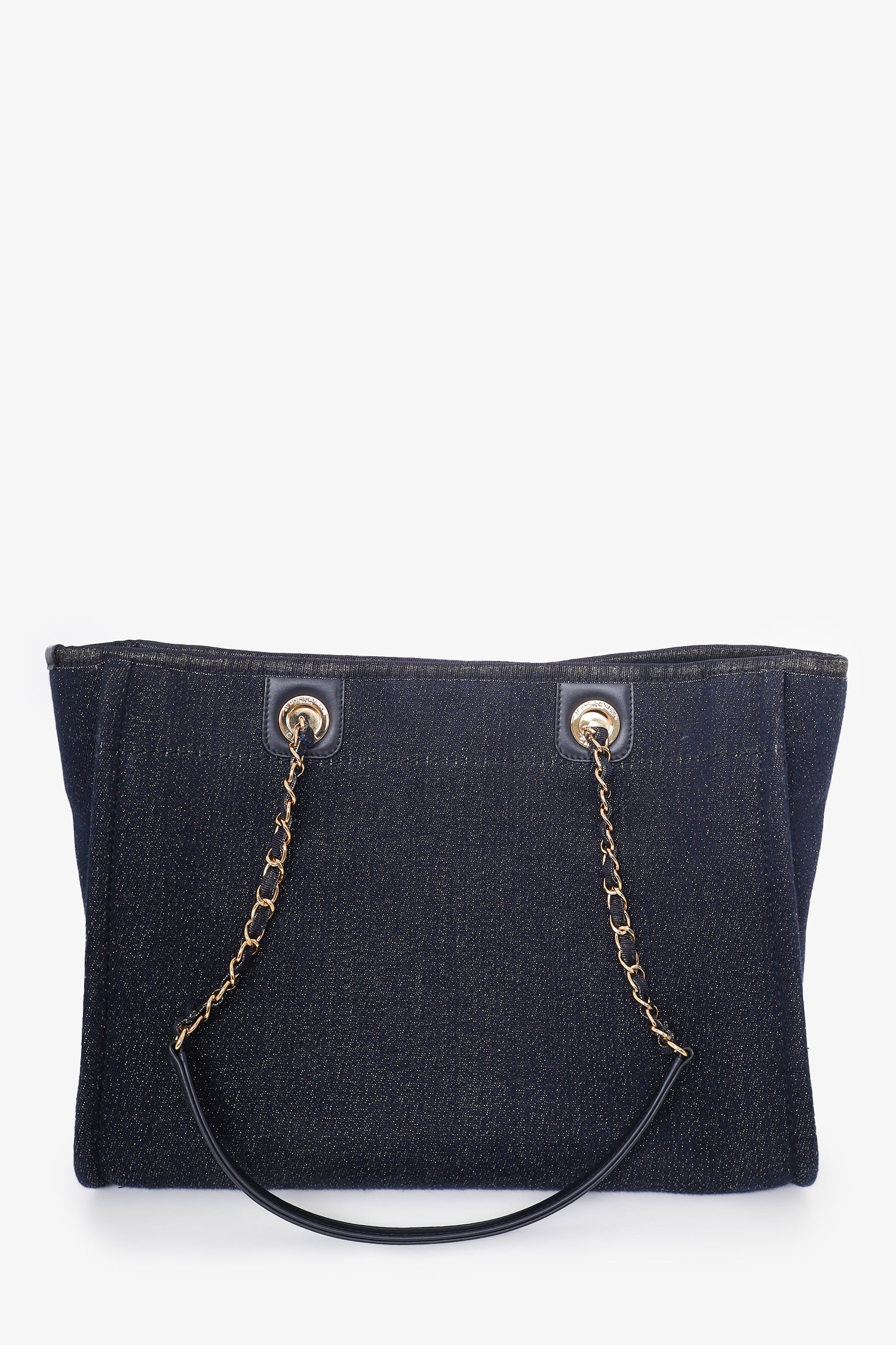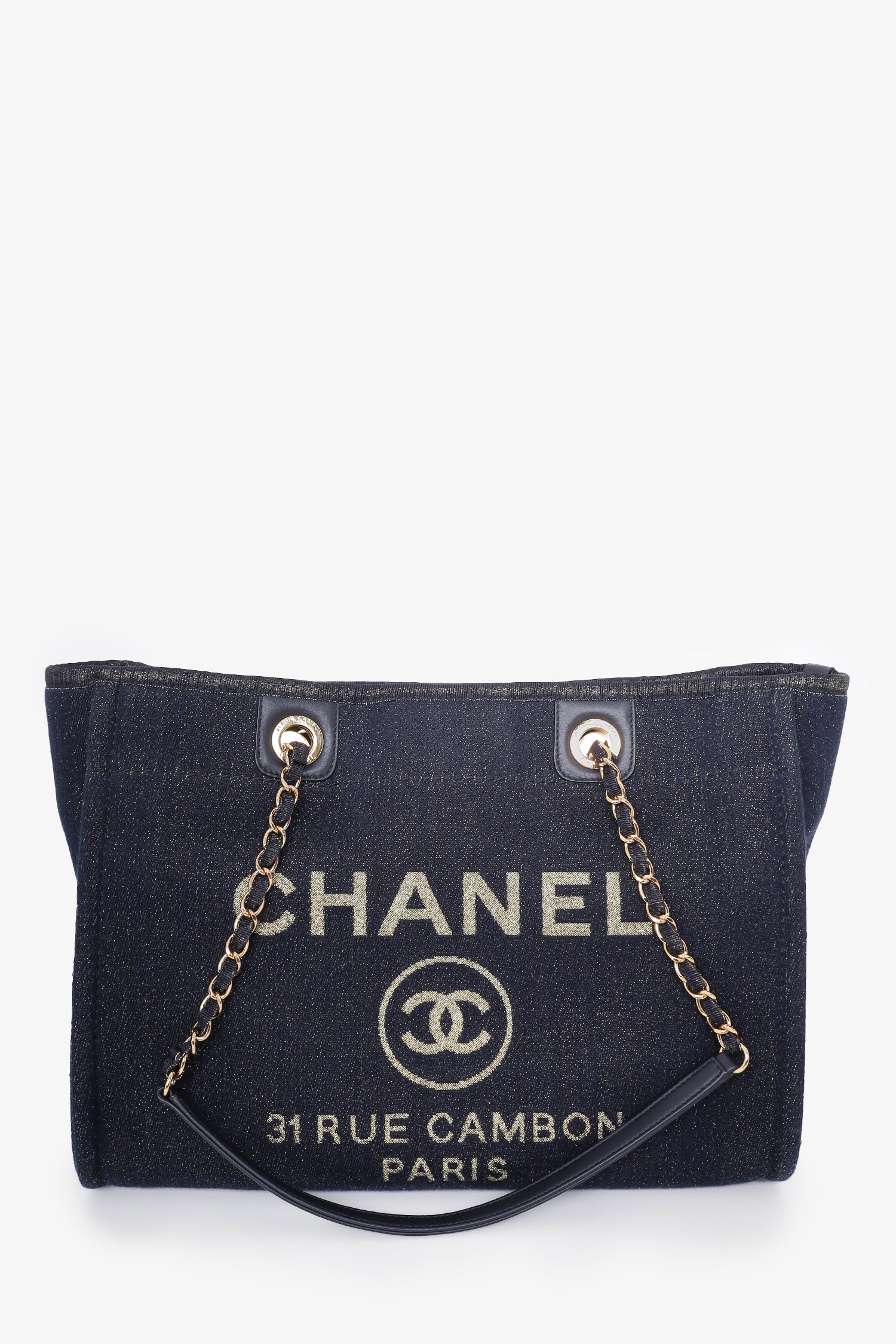 Pre-Loved Chanel™ 2018-19 Navy Glitter Canvas Deauville Tote Bag. 3 interior wall pockets; 1 with zip closure. 2 slip pockets. Gold-tone hardware. Tonal stitching.