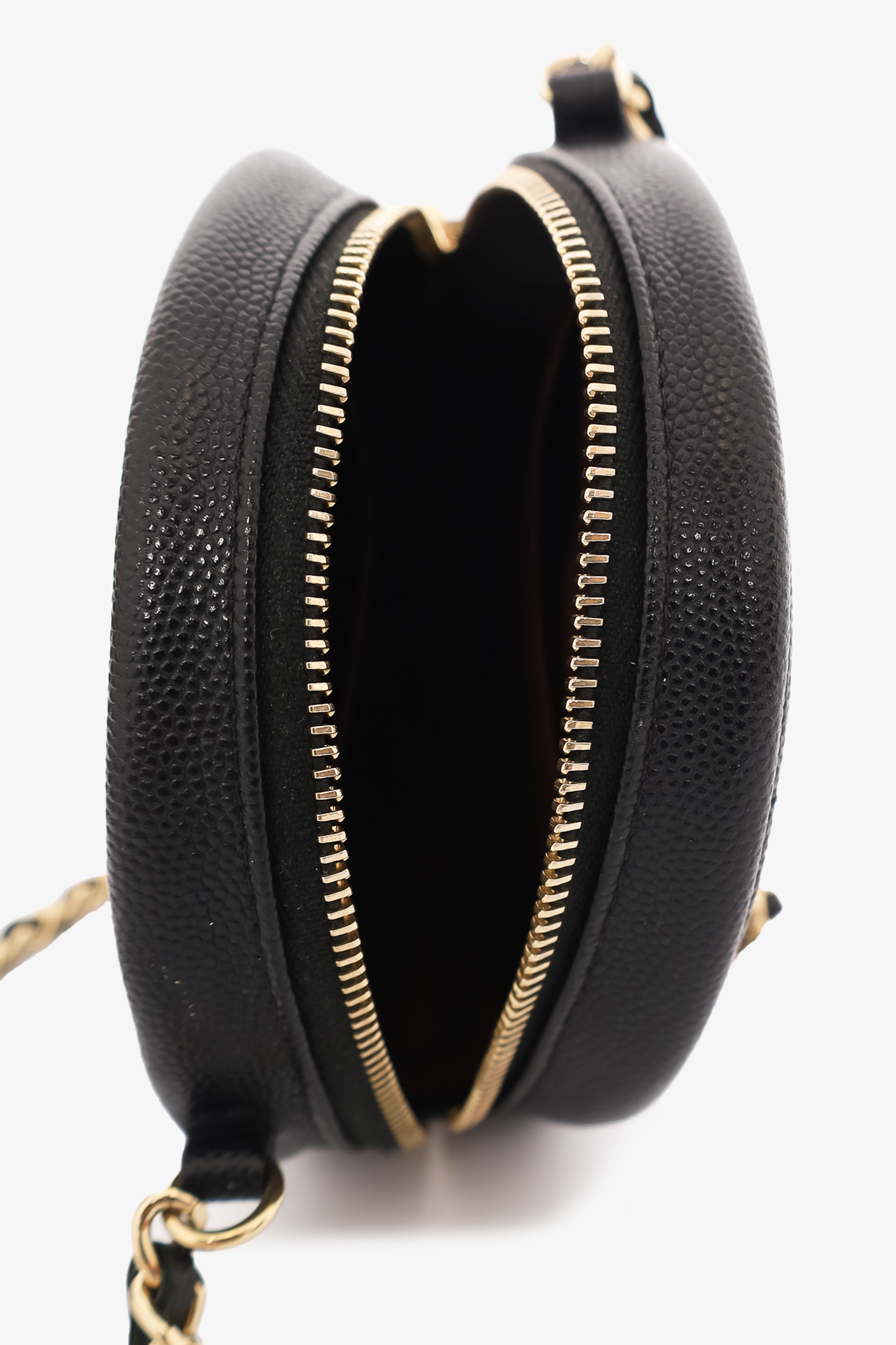 Refresh availabilityPre-Loved Chanel™ 2018 Black Caviar Leather Mini Round Chain Bag. Top zip closure. Open interior. Tonal stitching.