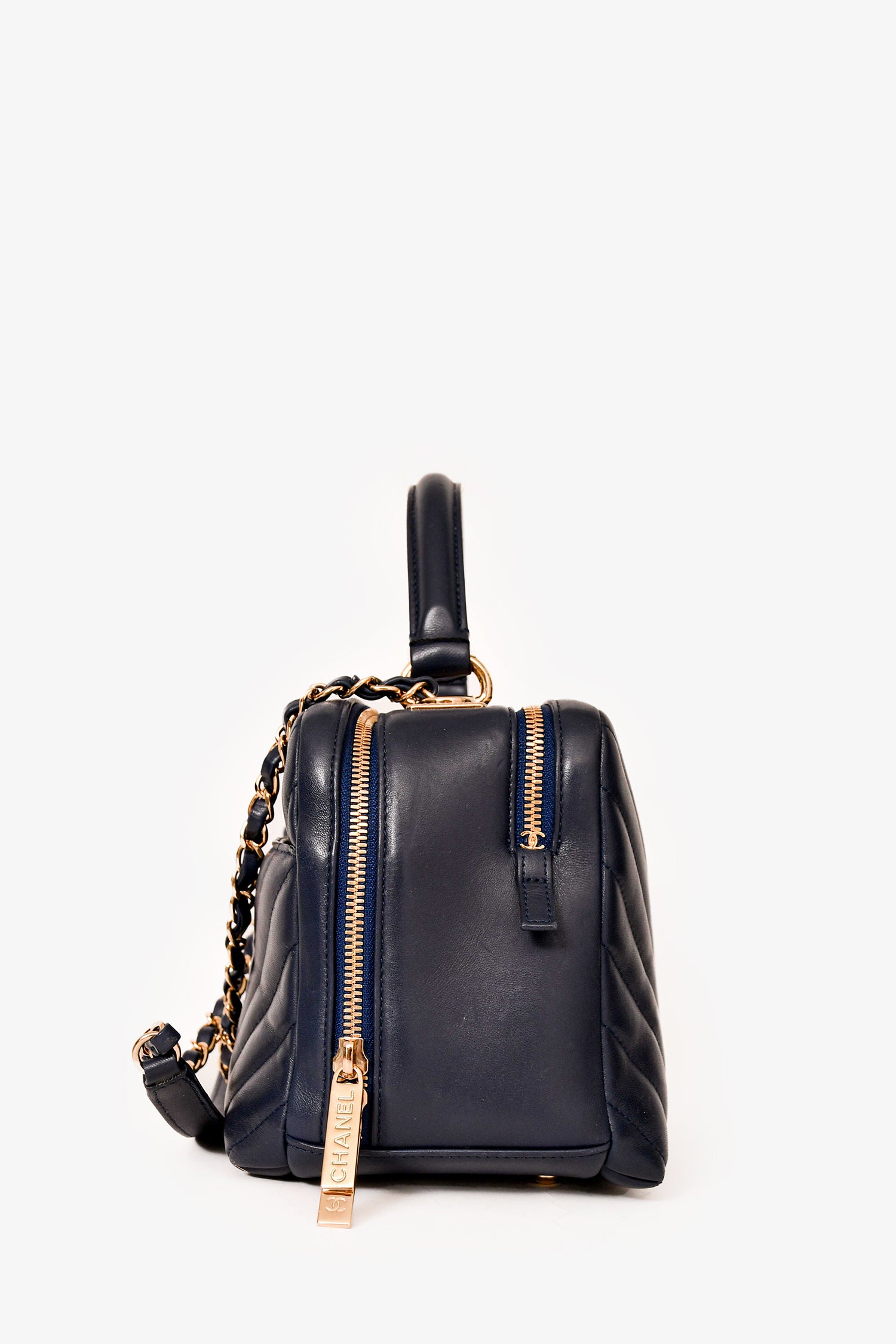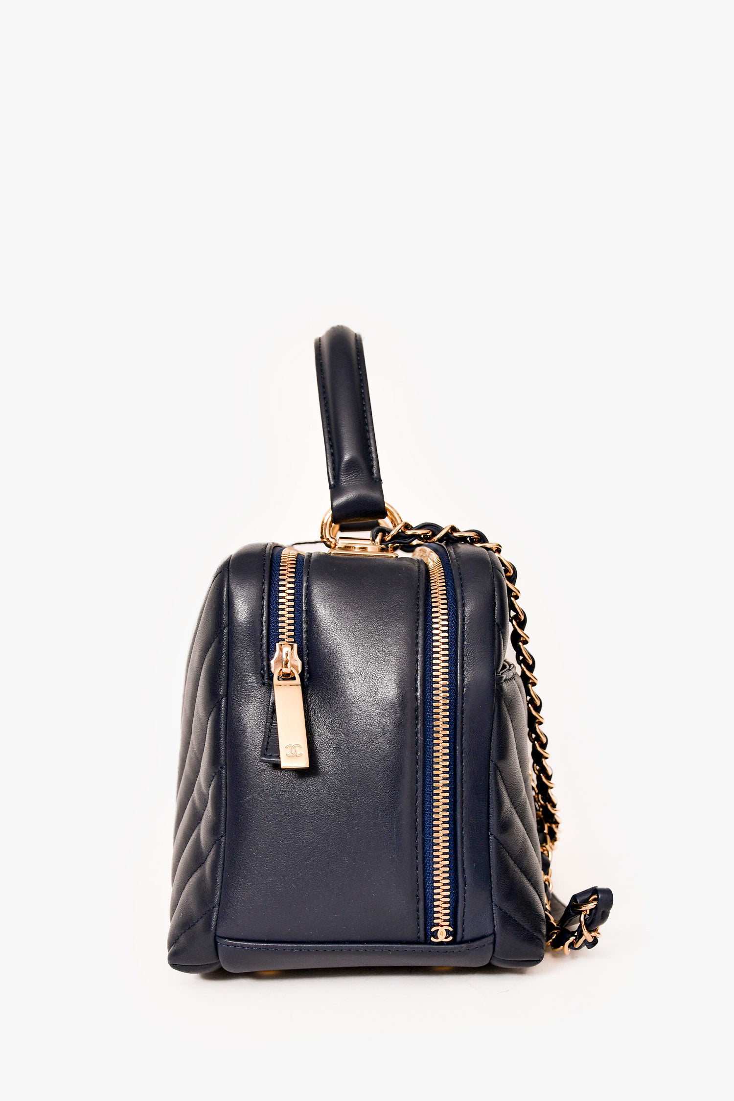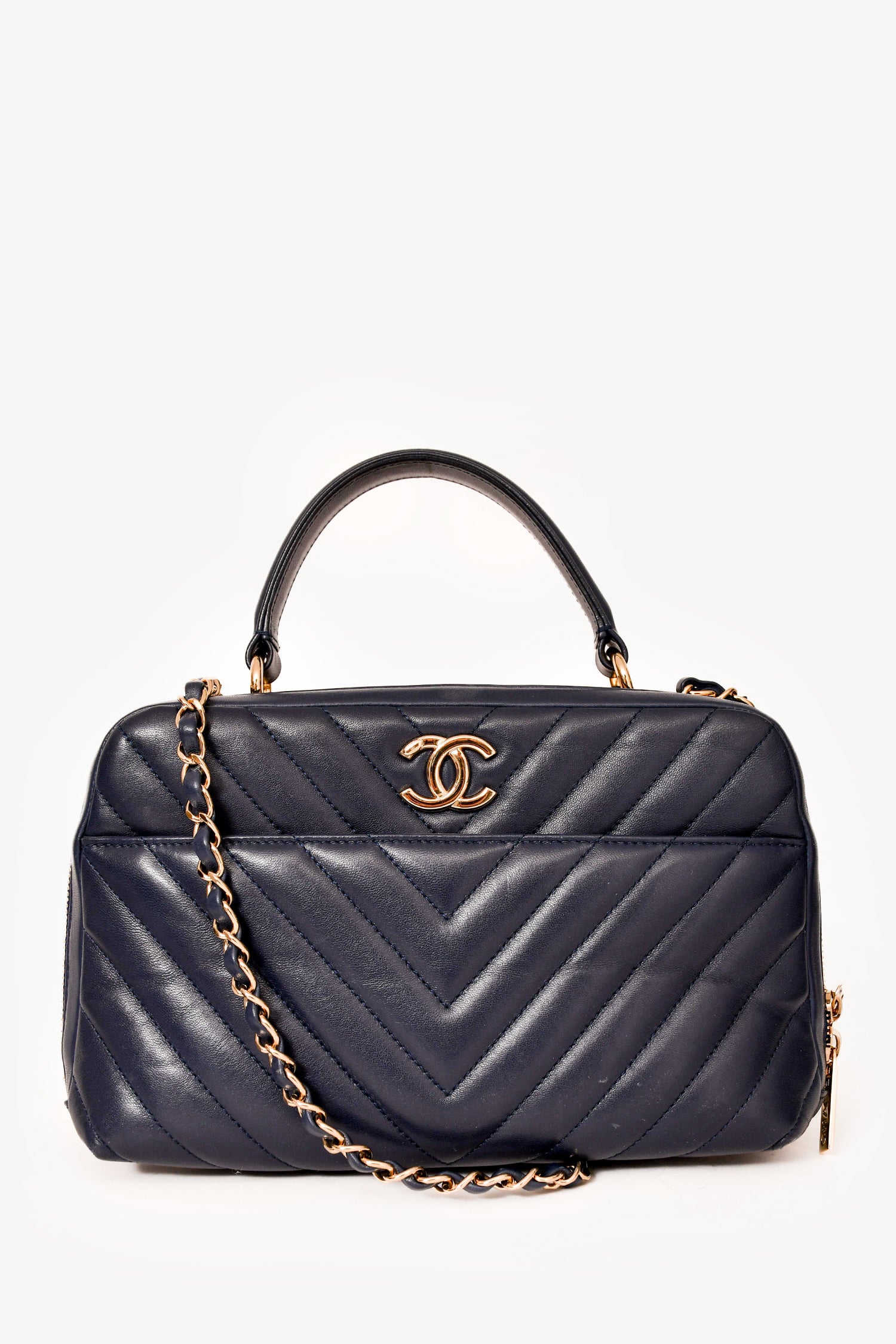 Refresh availabilityPre-Loved Chanel™ 2018 Navy Chevron Leather Medium Trendy Bowling Top Handle. Single top handle. Chain-link and leather woven strap. Front exterior slip pocket. Front compartment with top zip-around closure. Two interior slip pockets and one zippered wall pocket. Back compartment with top zip-around closure and an interior wall slip pocket. Gold-tone hardware. Tonal stitching.
