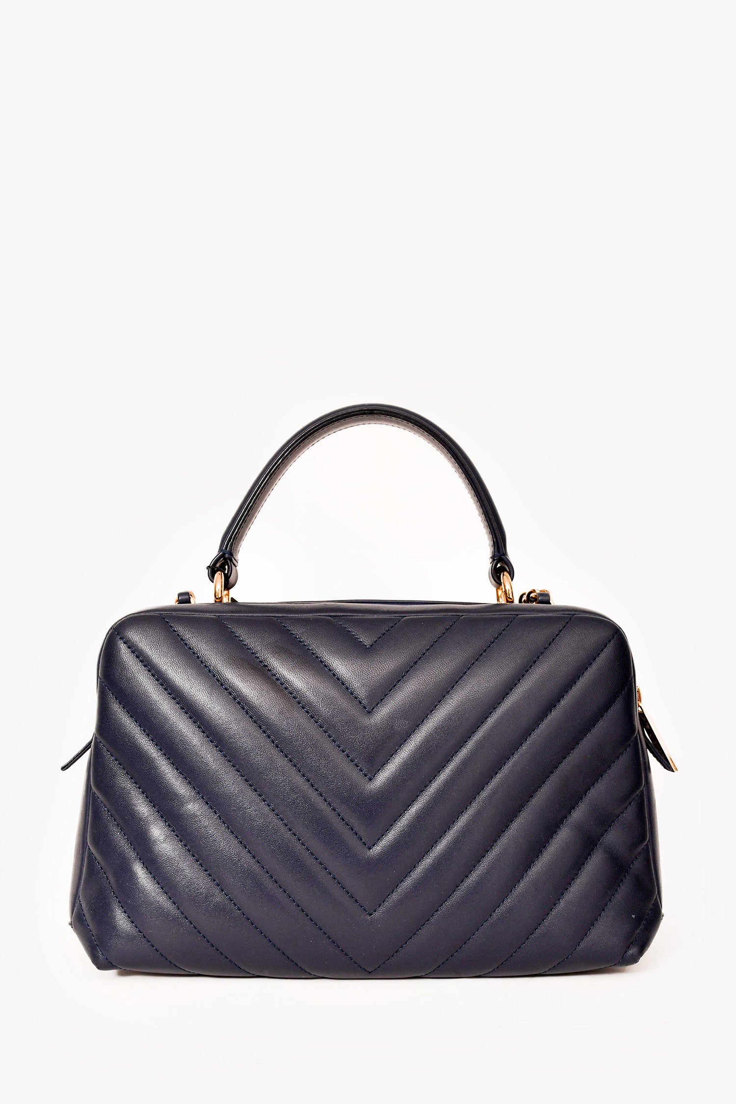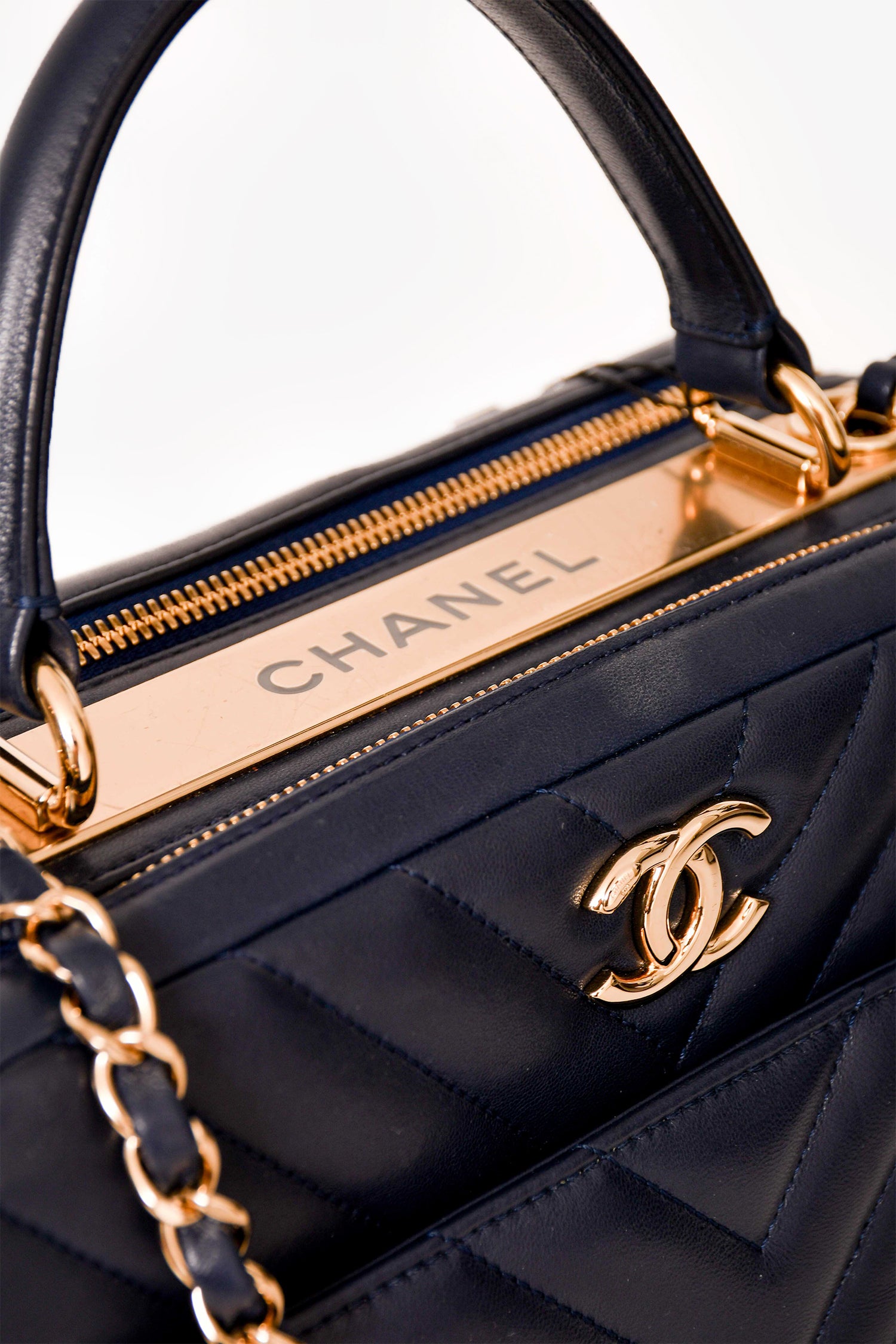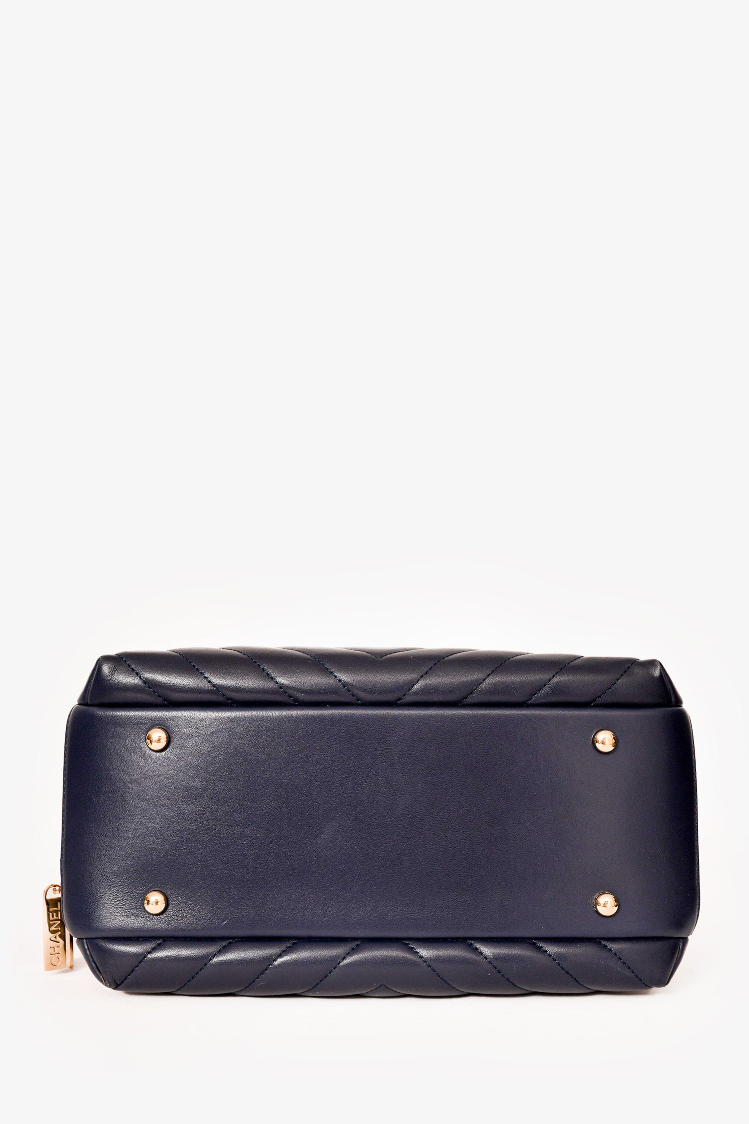 Refresh availabilityPre-Loved Chanel™ 2018 Navy Chevron Leather Medium Trendy Bowling Top Handle. Single top handle. Chain-link and leather woven strap. Front exterior slip pocket. Front compartment with top zip-around closure. Two interior slip pockets and one zippered wall pocket. Back compartment with top zip-around closure and an interior wall slip pocket. Gold-tone hardware. Tonal stitching.