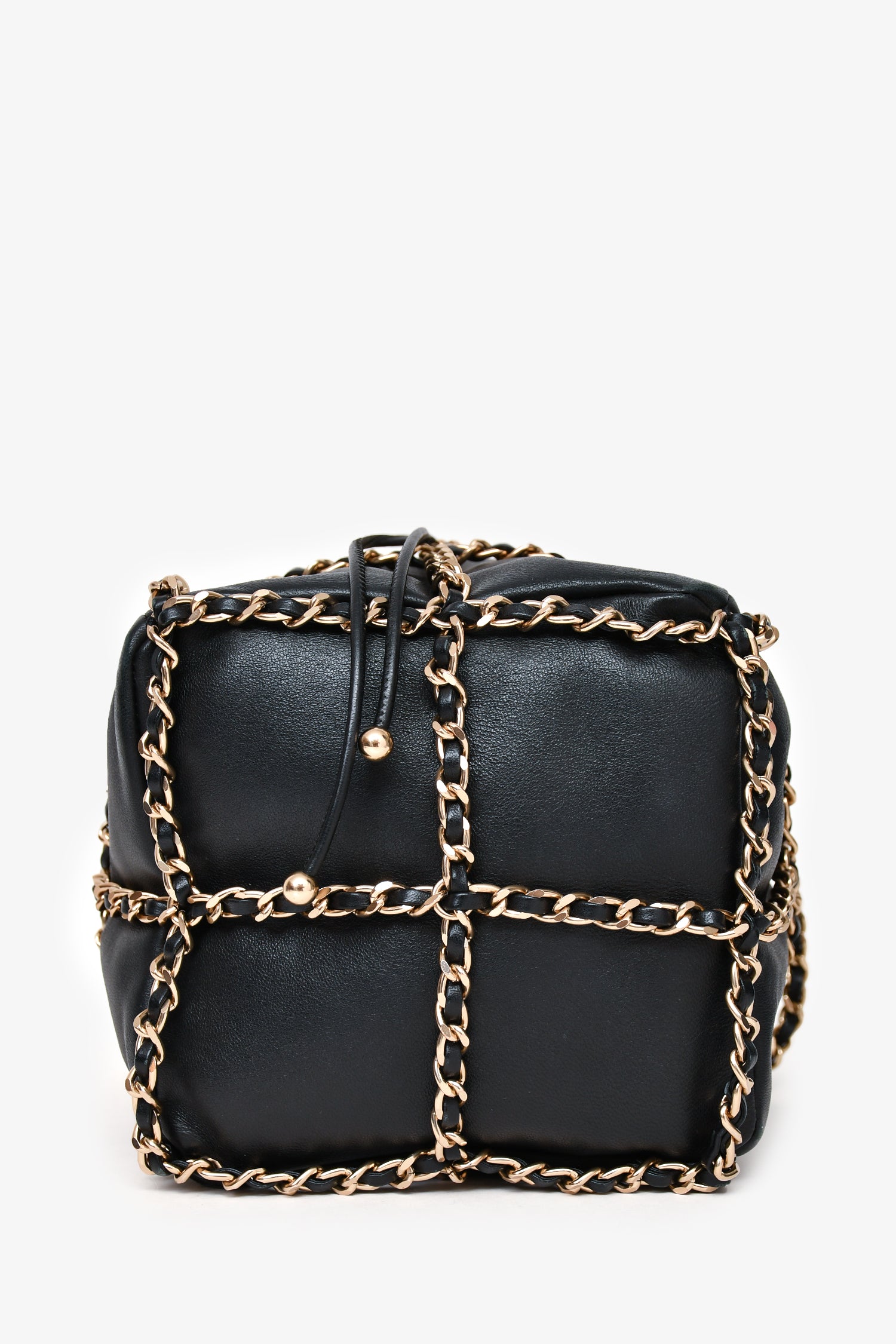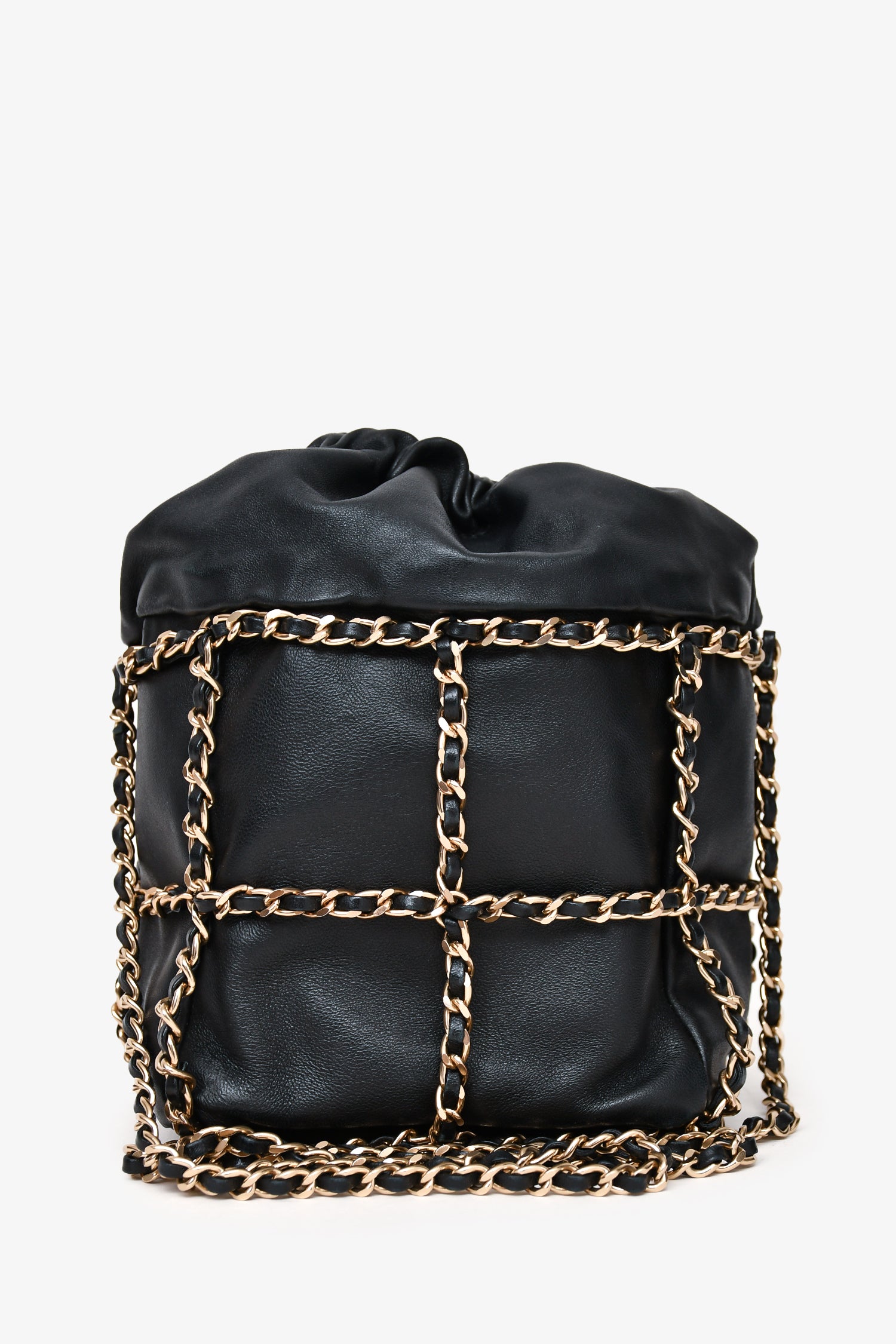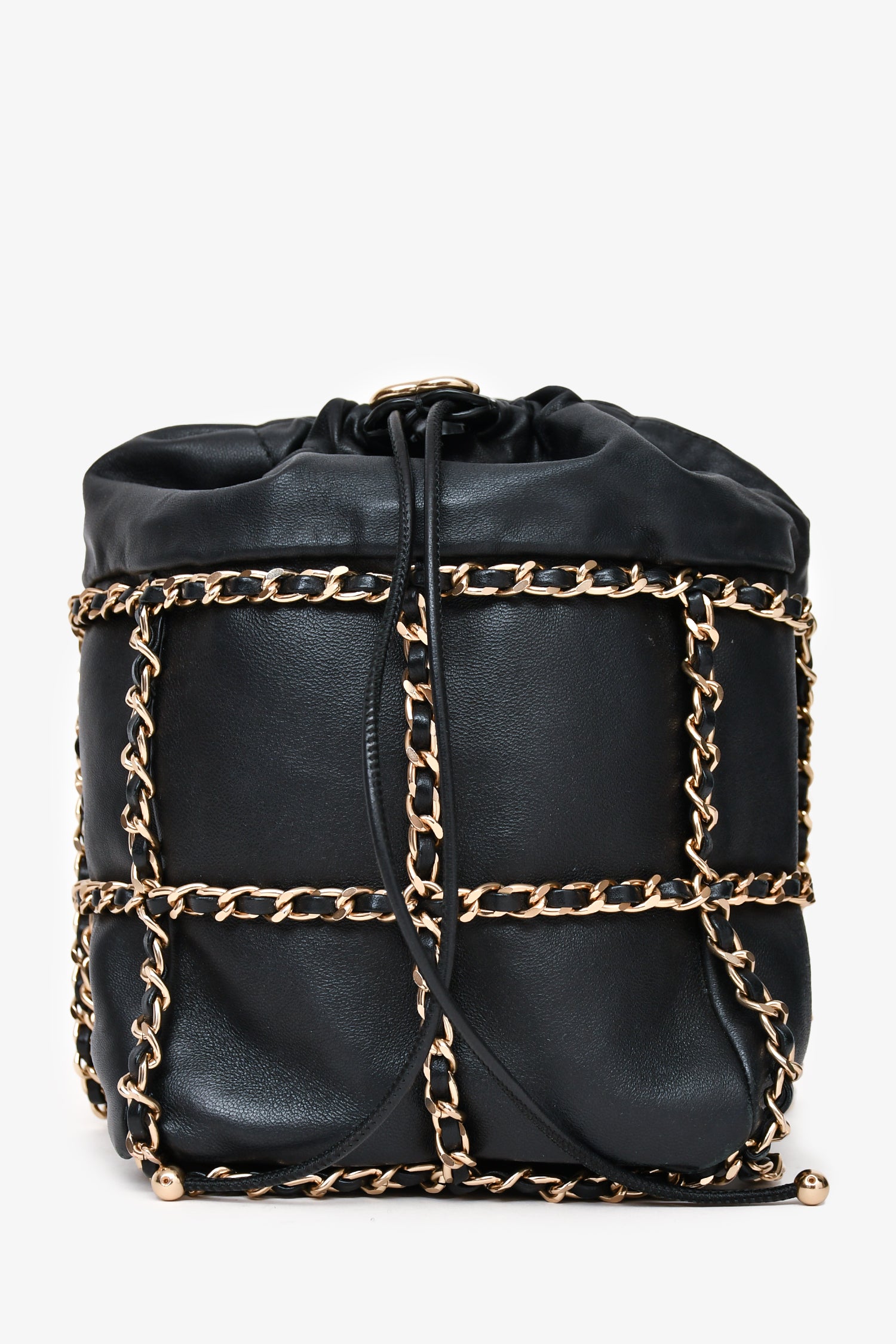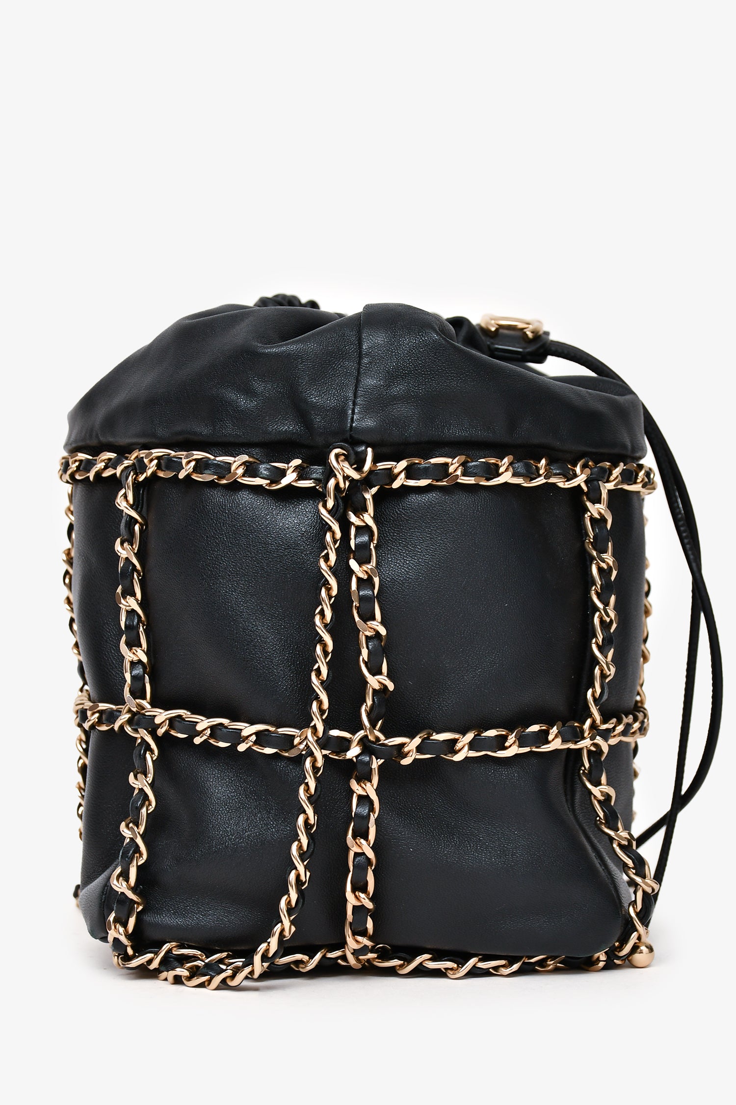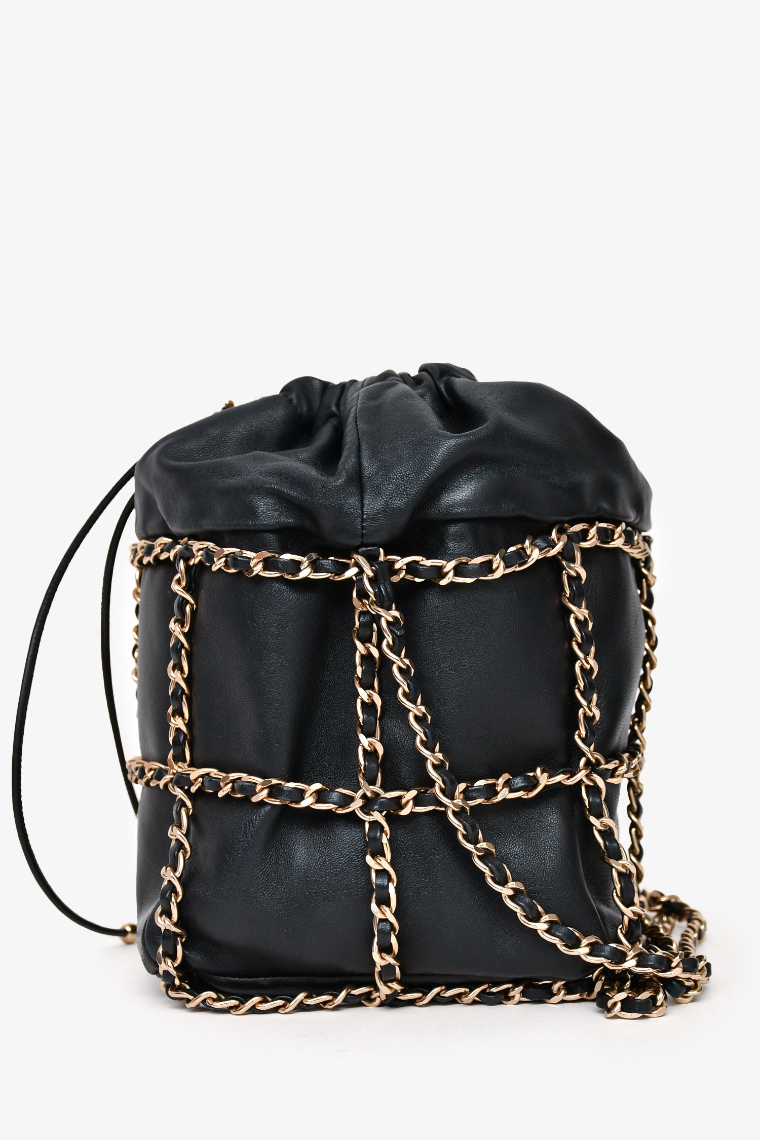 Refresh availabilityPre-Loved Chanel™ 2019-20 Black Lambskin Bucket Bag. Drawstring closure with interwoven leather and chain detail. Leather-threaded chain shoulder strap with adjustable length. Lined interior with one card-slip pocket. Gold-tone hardware. Tonal stitching.