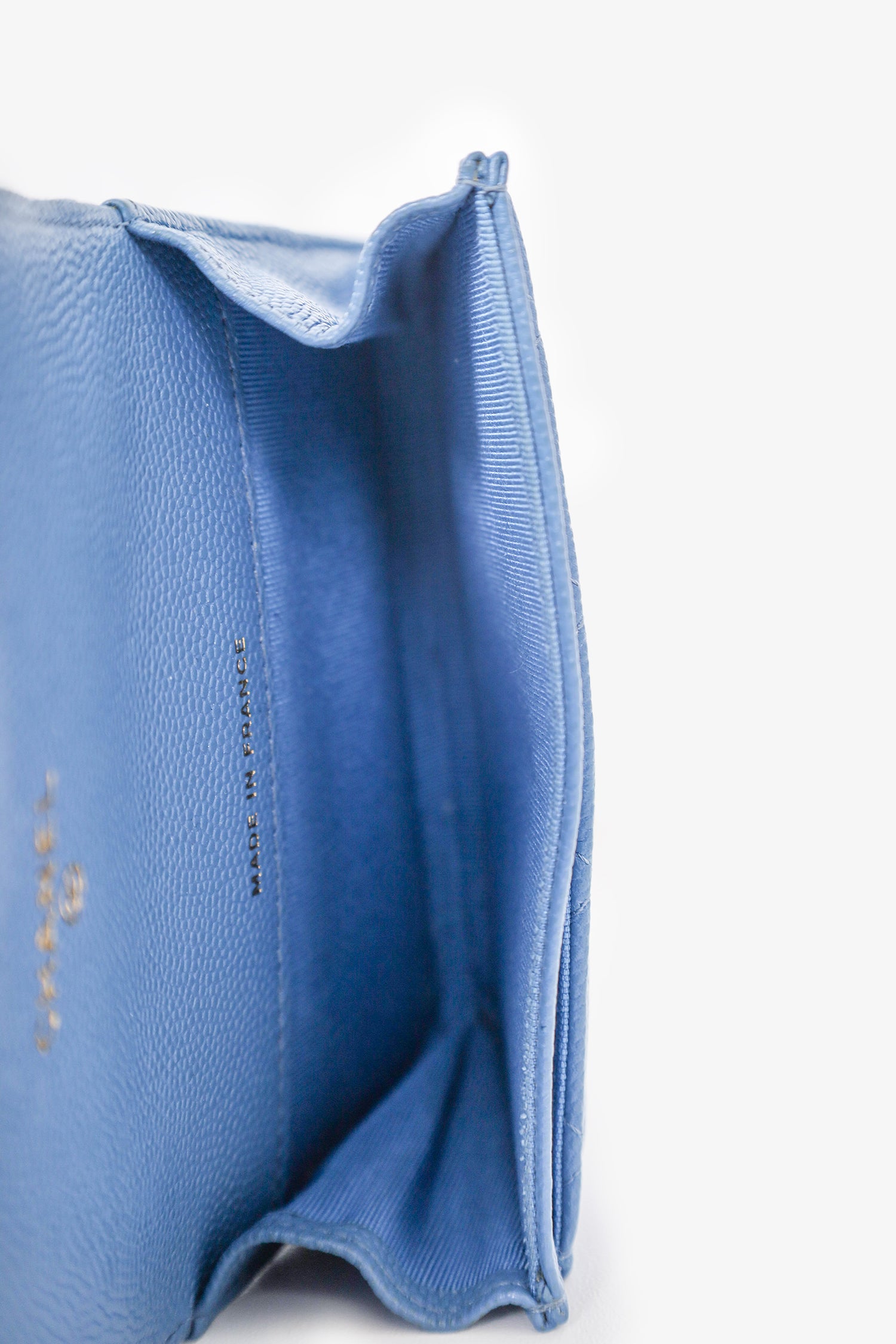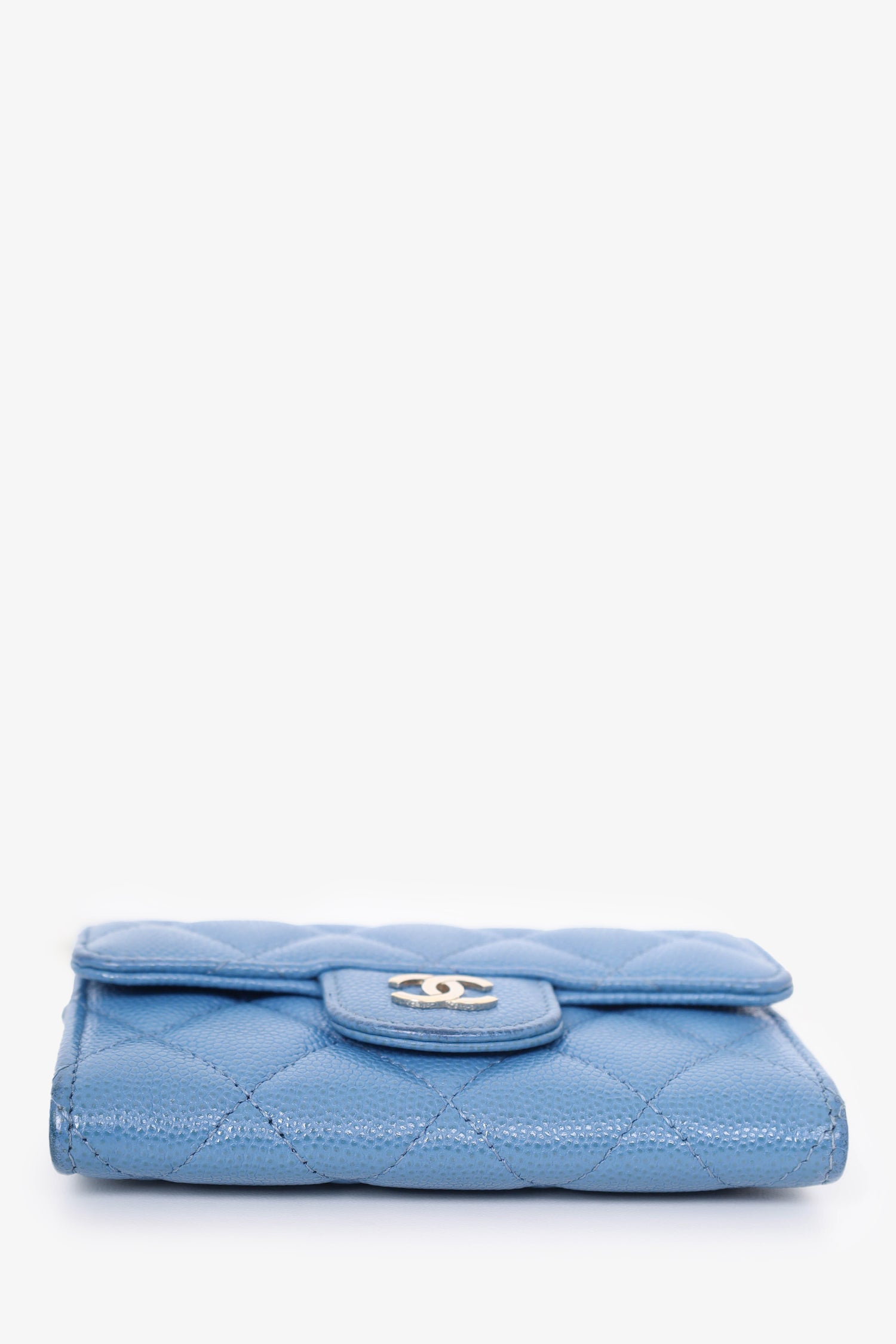 Refresh availabilityPre-Loved™ Chanel 2019/20 Blue Caviar Flap Cardholder. Fold-over flap with snap button closure. Open interior compartment with 2 interior card slip pockets on front of interior. Gold tone hardware. Tonal stitching.