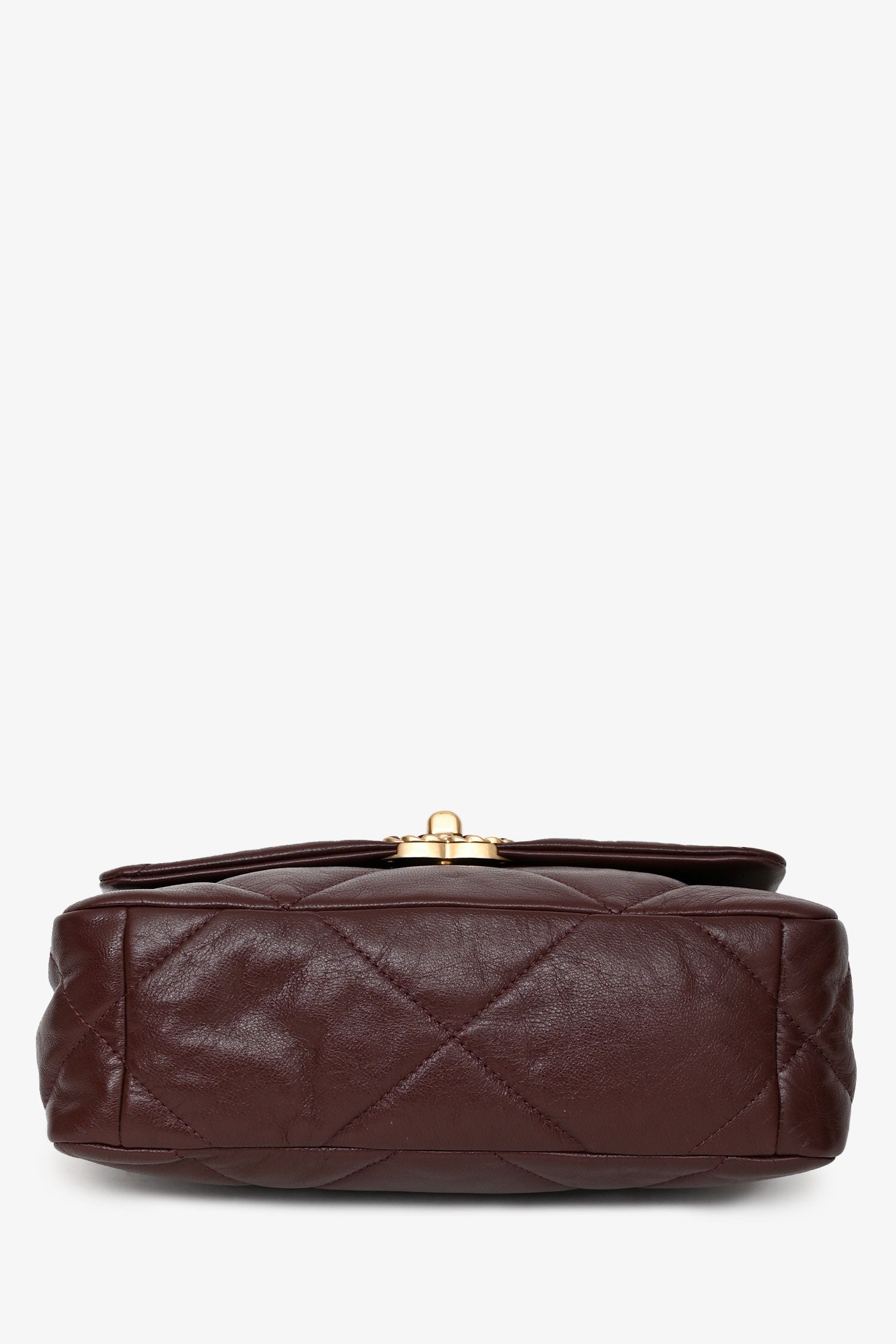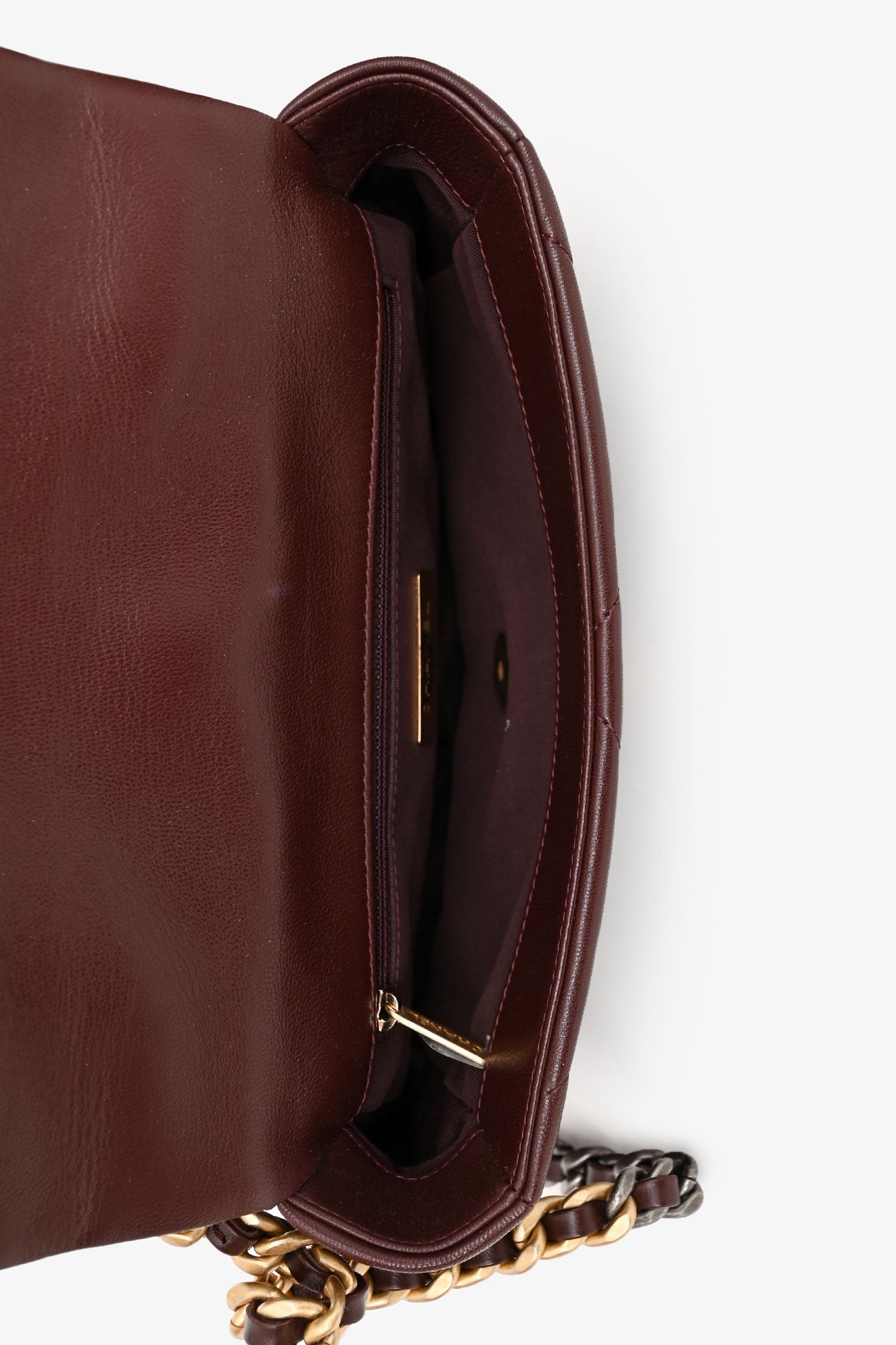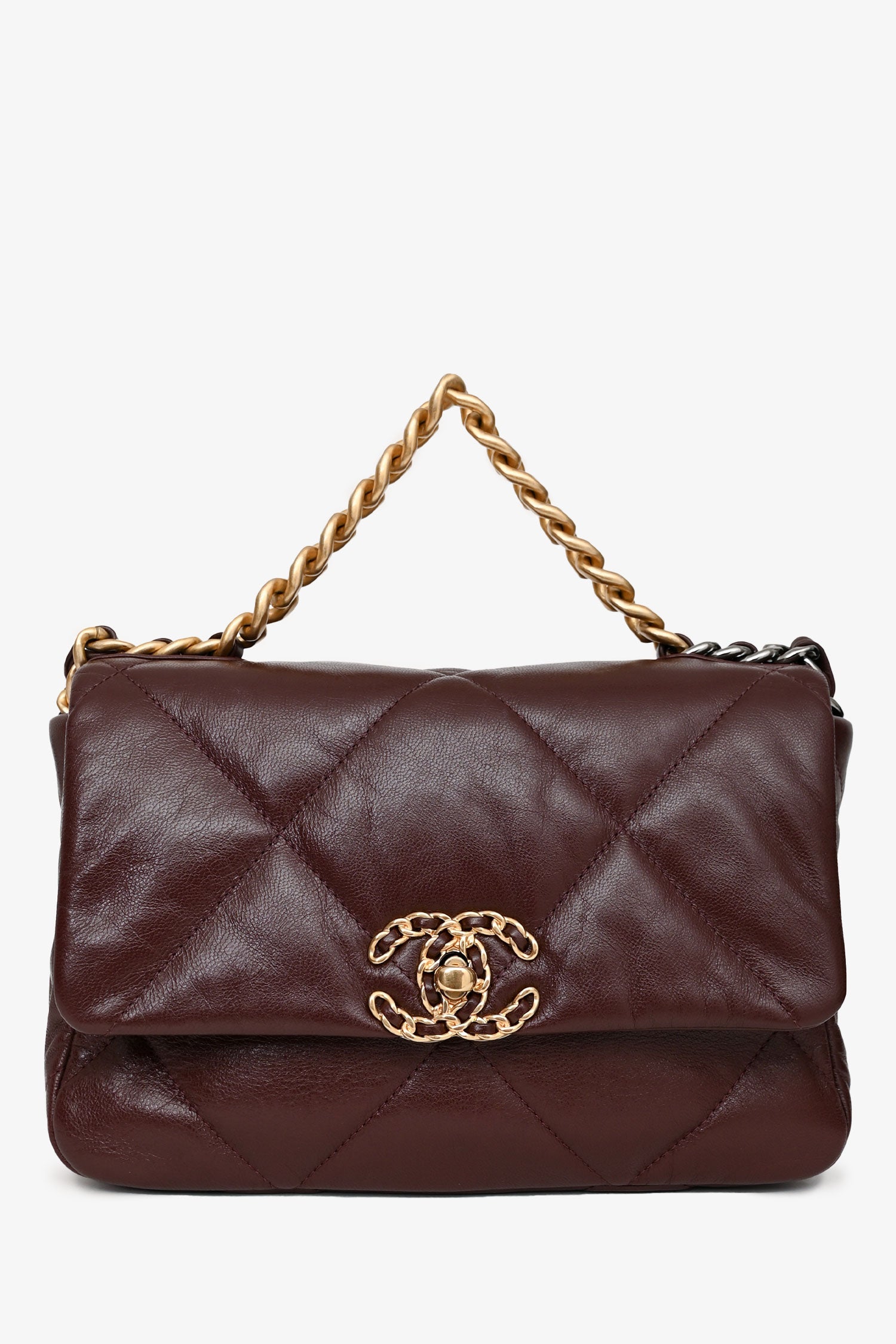 Refresh availabilityPre-Loved Chanel™ 2019-30 Brown Leather Chanel 19 Shoulder Bag. Flap closure with gold-tone metal CC turn-lock. Mixed-tone chain shoulder strap with leather detail. Back slip pocket with magnetic snap closure. Lined interior with wall zip pocket. Tonal stitching.