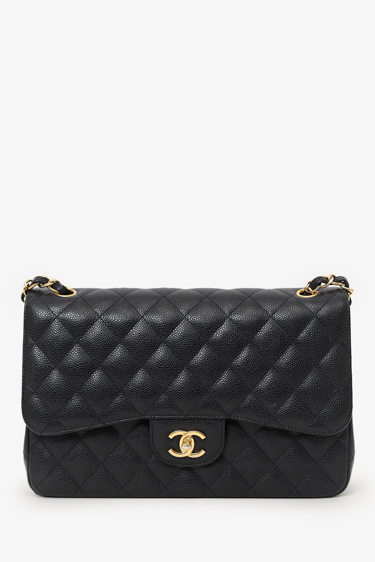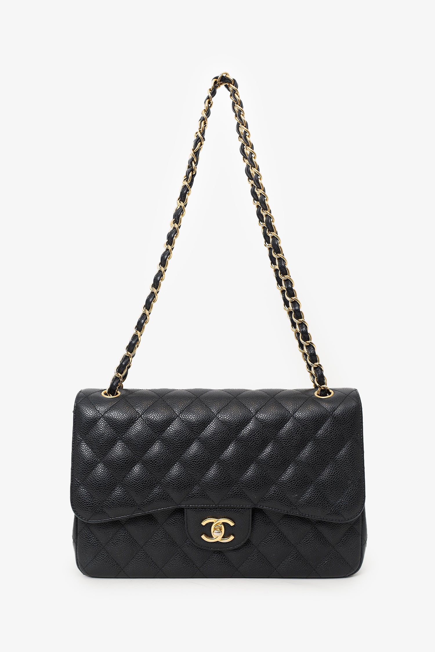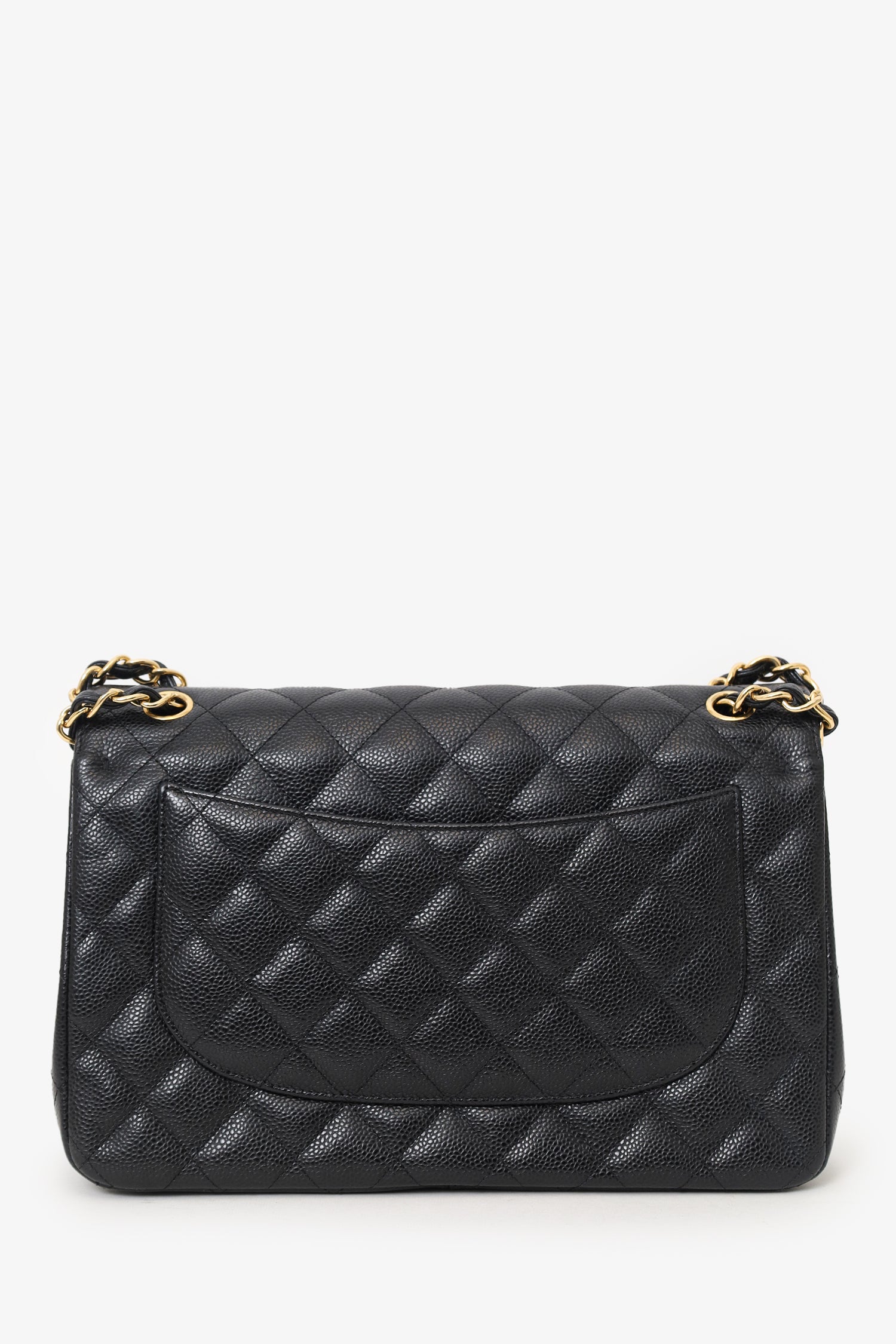 Pre-Loved Chanel™ 2019 Black Caviar Leather Jumbo Double Flap Should Bag. Front fold-over flap with turn-lock closure. Twin chainlink shoulder straps that can be pulled into one long strap. Quilted exterior. Single exterior slip pocket. Zip pocket under flap. Secondary fold-over flap with snap-button closure under. Leather-lined interior. 2 interior compartments; front slip and rear main with 2 slip pocket and 1 pen pocket. Gold-tone hardware. Tonal stitching.