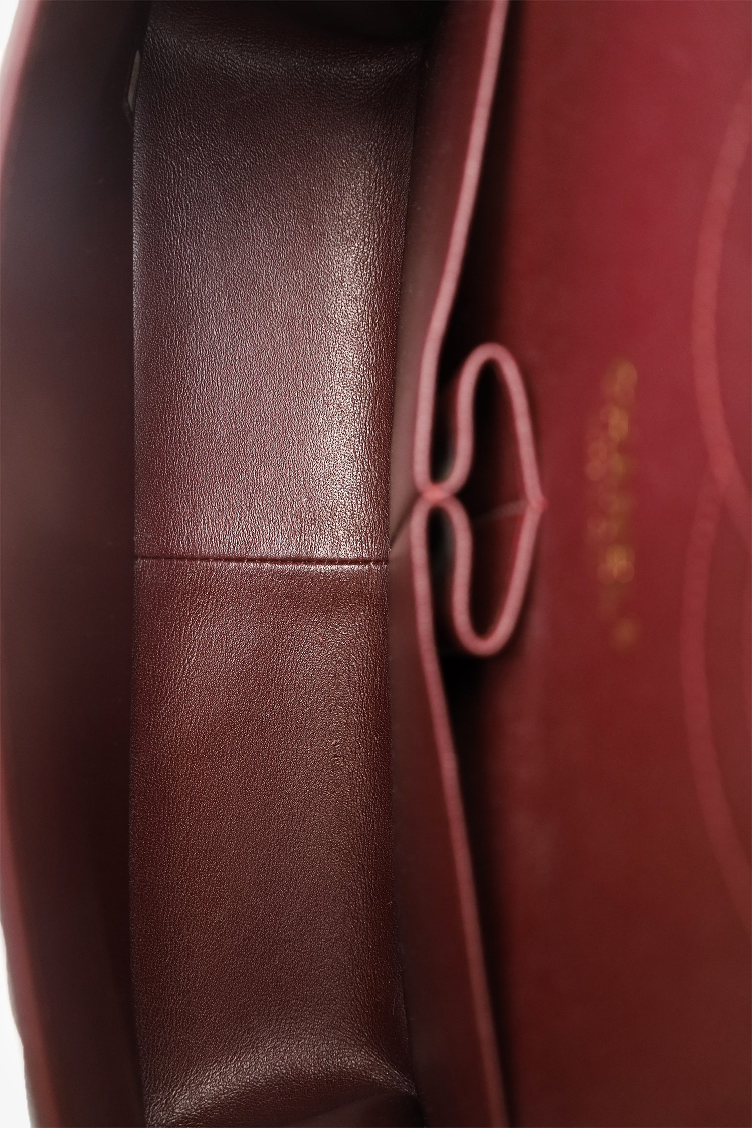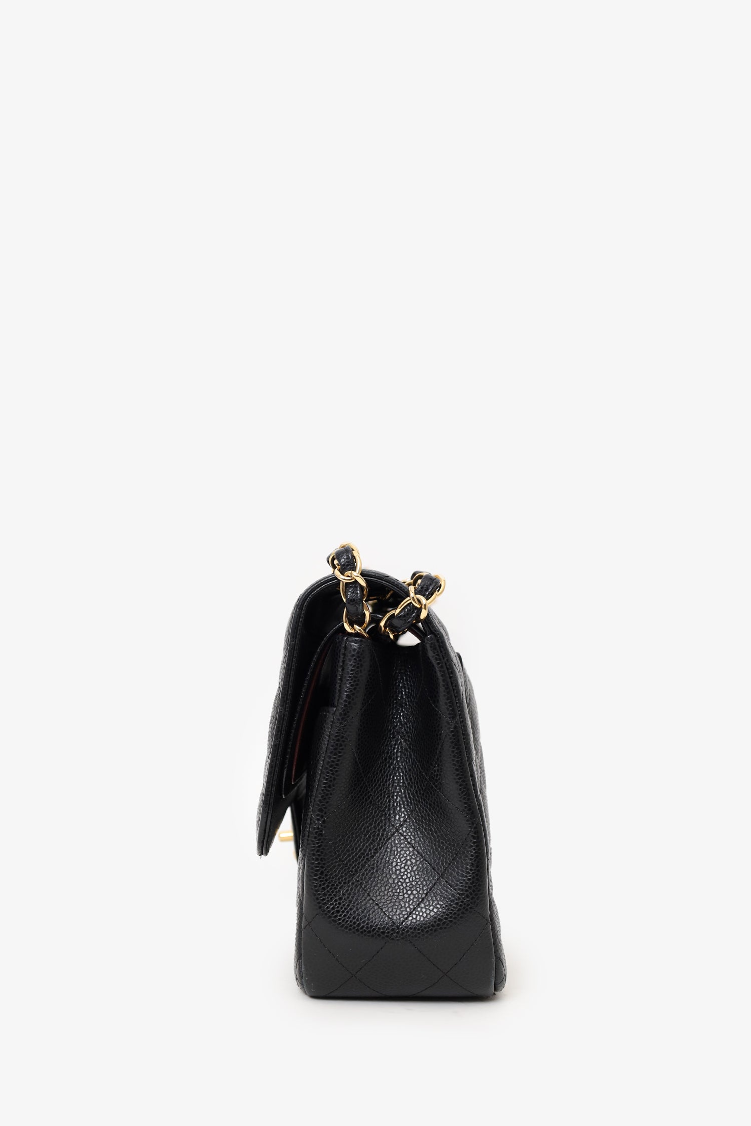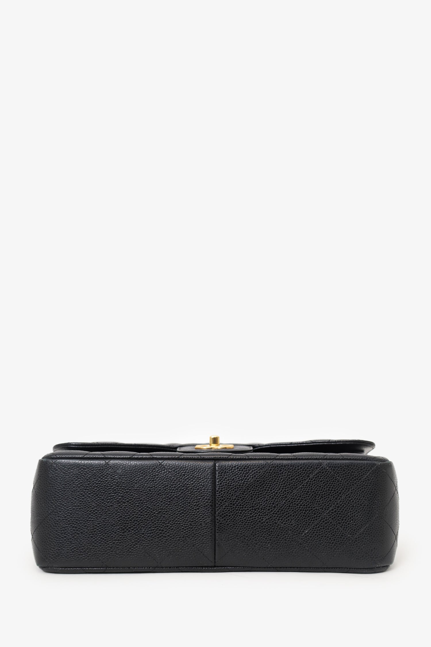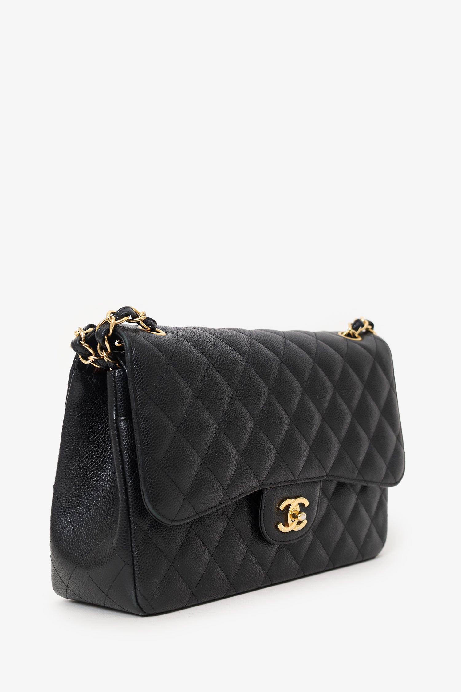 Pre-Loved Chanel™ 2019 Black Caviar Leather Jumbo Double Flap Should Bag. Front fold-over flap with turn-lock closure. Twin chainlink shoulder straps that can be pulled into one long strap. Quilted exterior. Single exterior slip pocket. Zip pocket under flap. Secondary fold-over flap with snap-button closure under. Leather-lined interior. 2 interior compartments; front slip and rear main with 2 slip pocket and 1 pen pocket. Gold-tone hardware. Tonal stitching.
