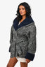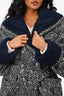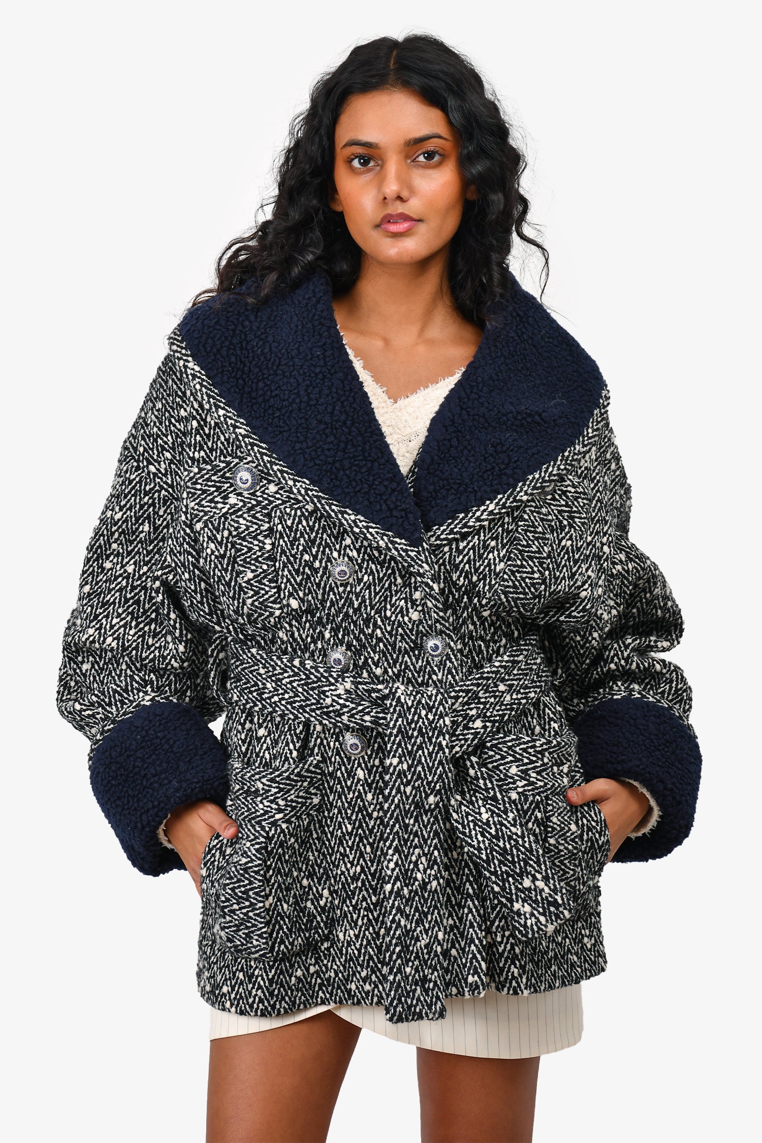 Pre-Loved Chanel™ 2019 Black/White/Navy Chevron Pattern Jacket with Belt. Acrylic blue and pearl "CC" detailed buttons. Sherpa trimmed. 4 front buttoned pockets; 2 hand and 2 breast. Silk interior lining. Tonal stitching.