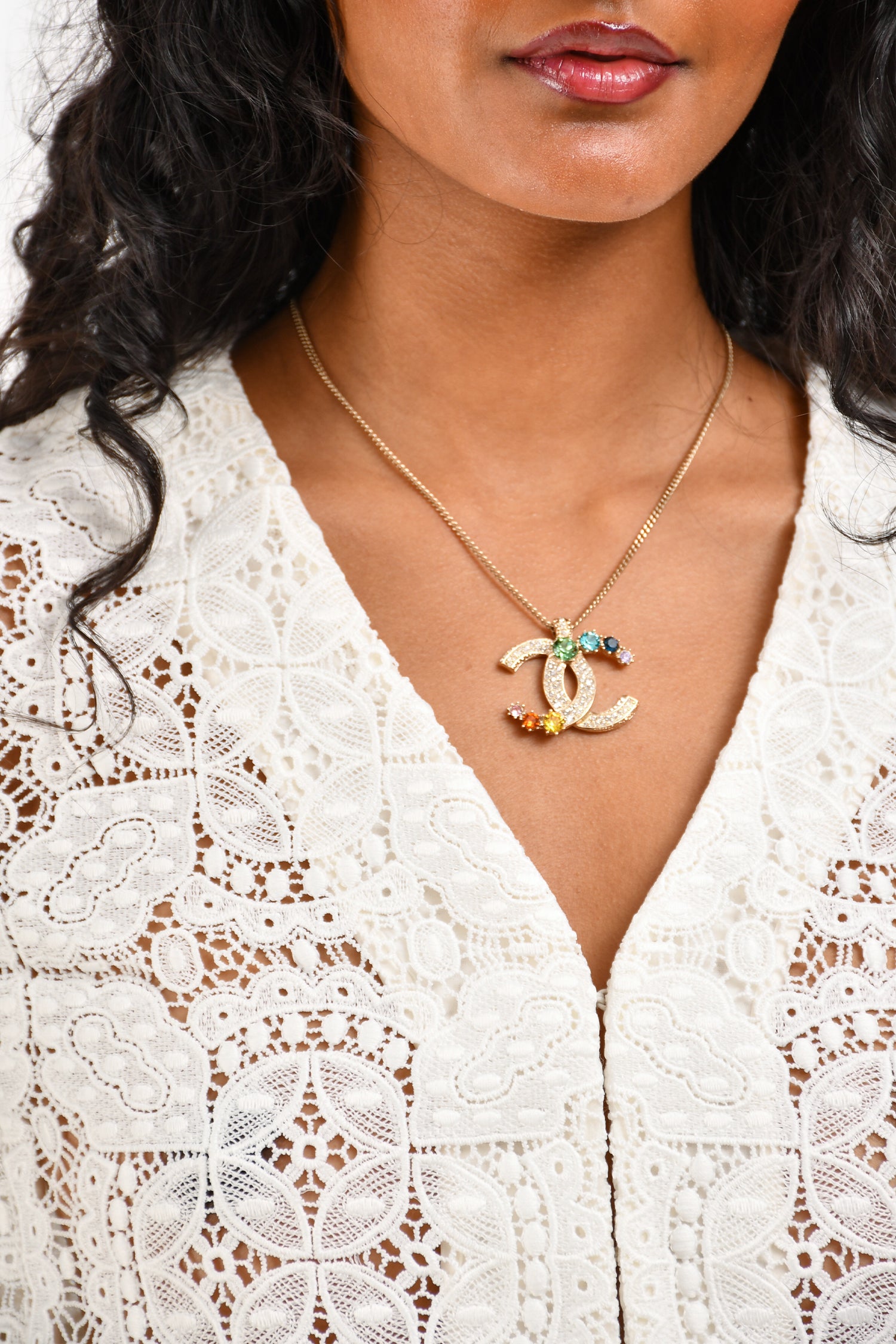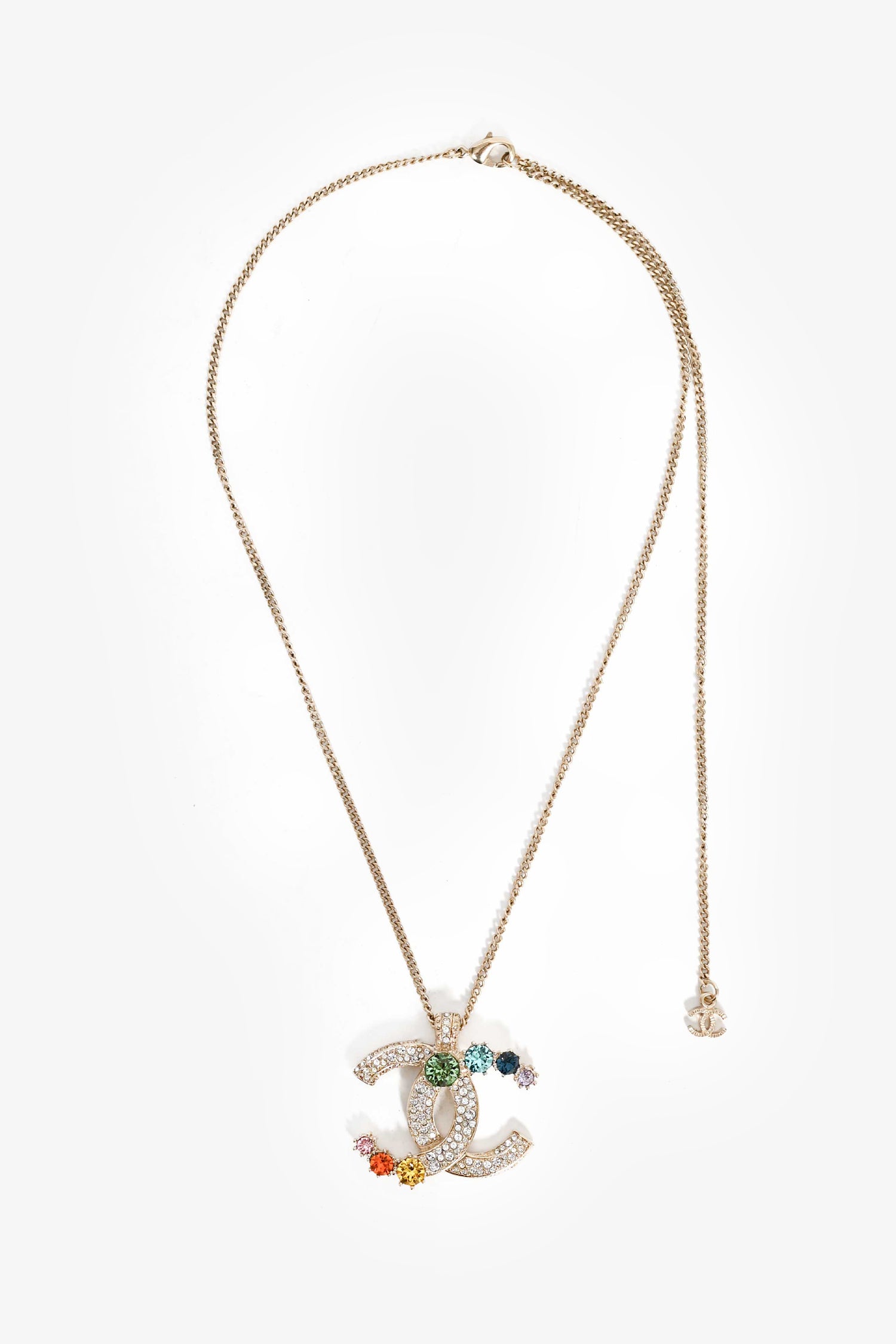 Refresh availabilityPre-Loved Chanel™ 2019 Gold Toned Rainbow Crystal CC Necklace. Lobster clasp closure.