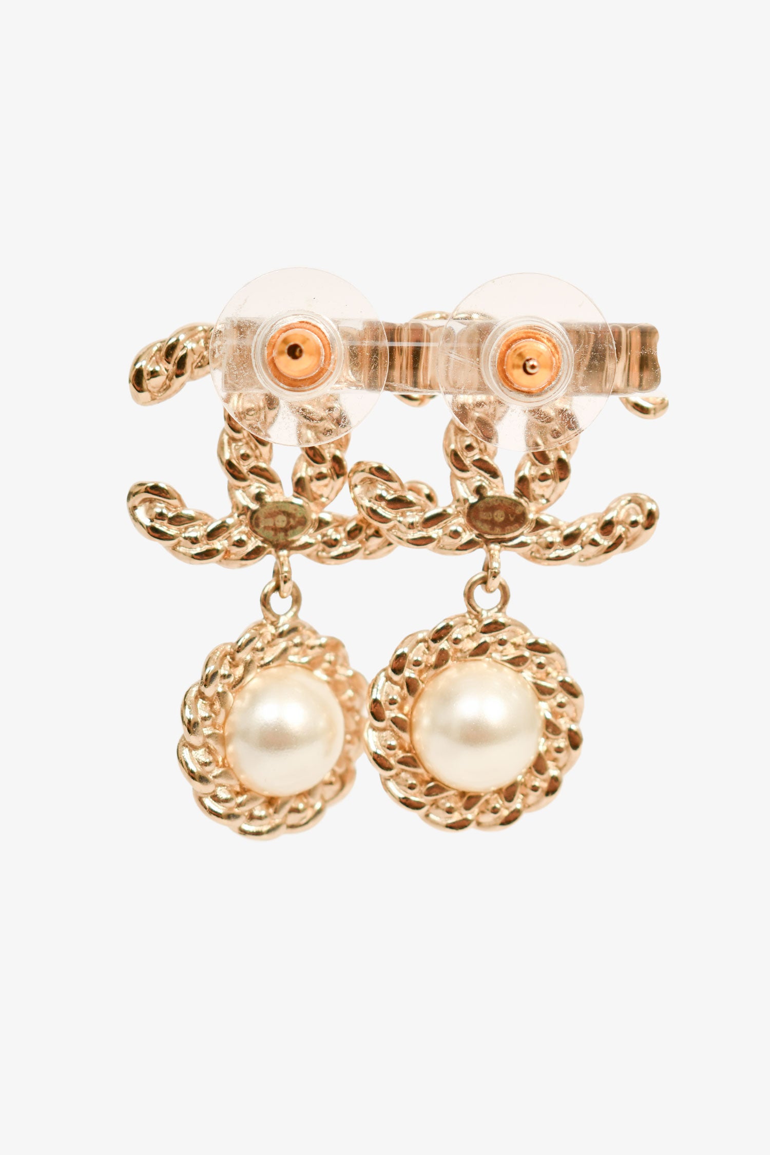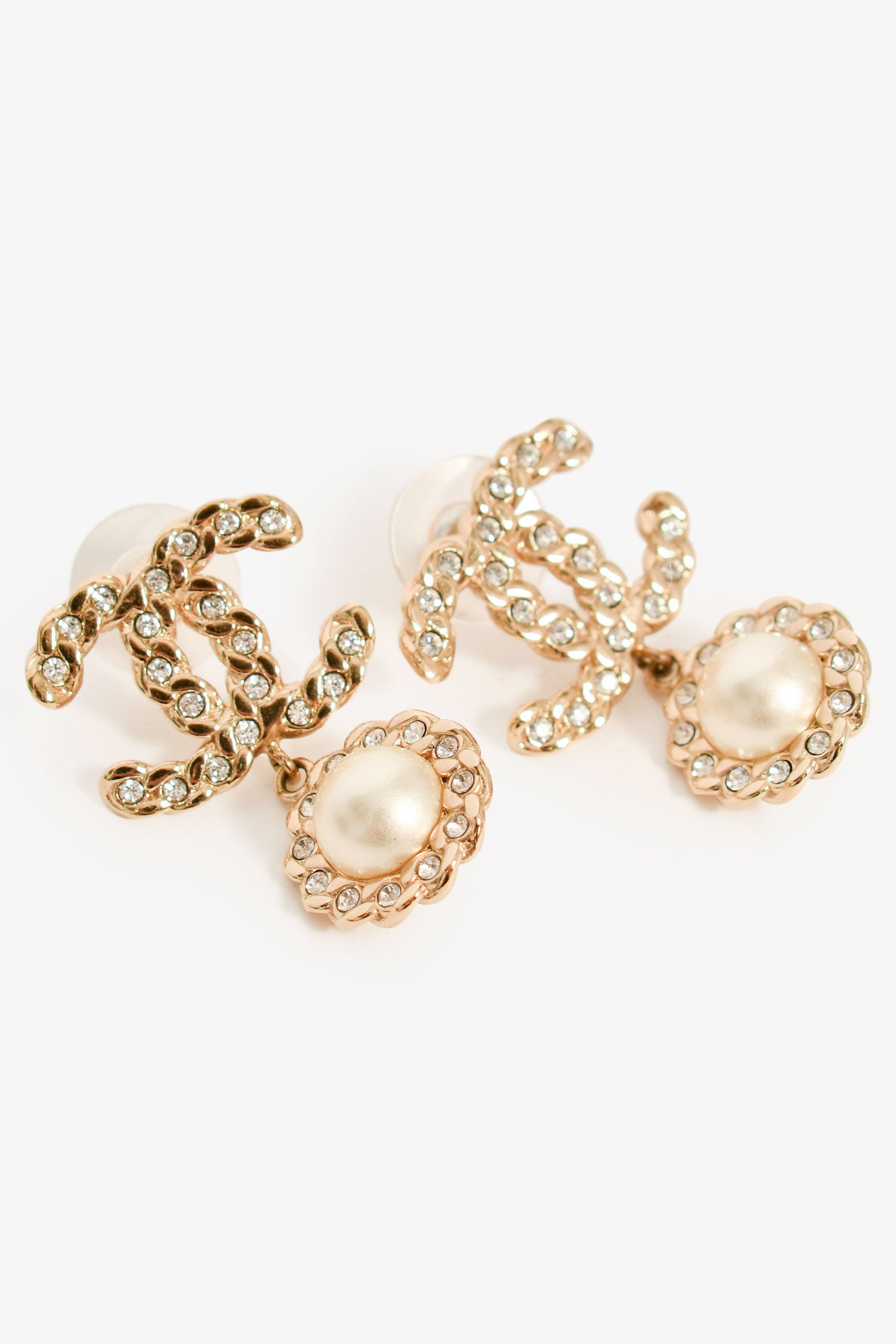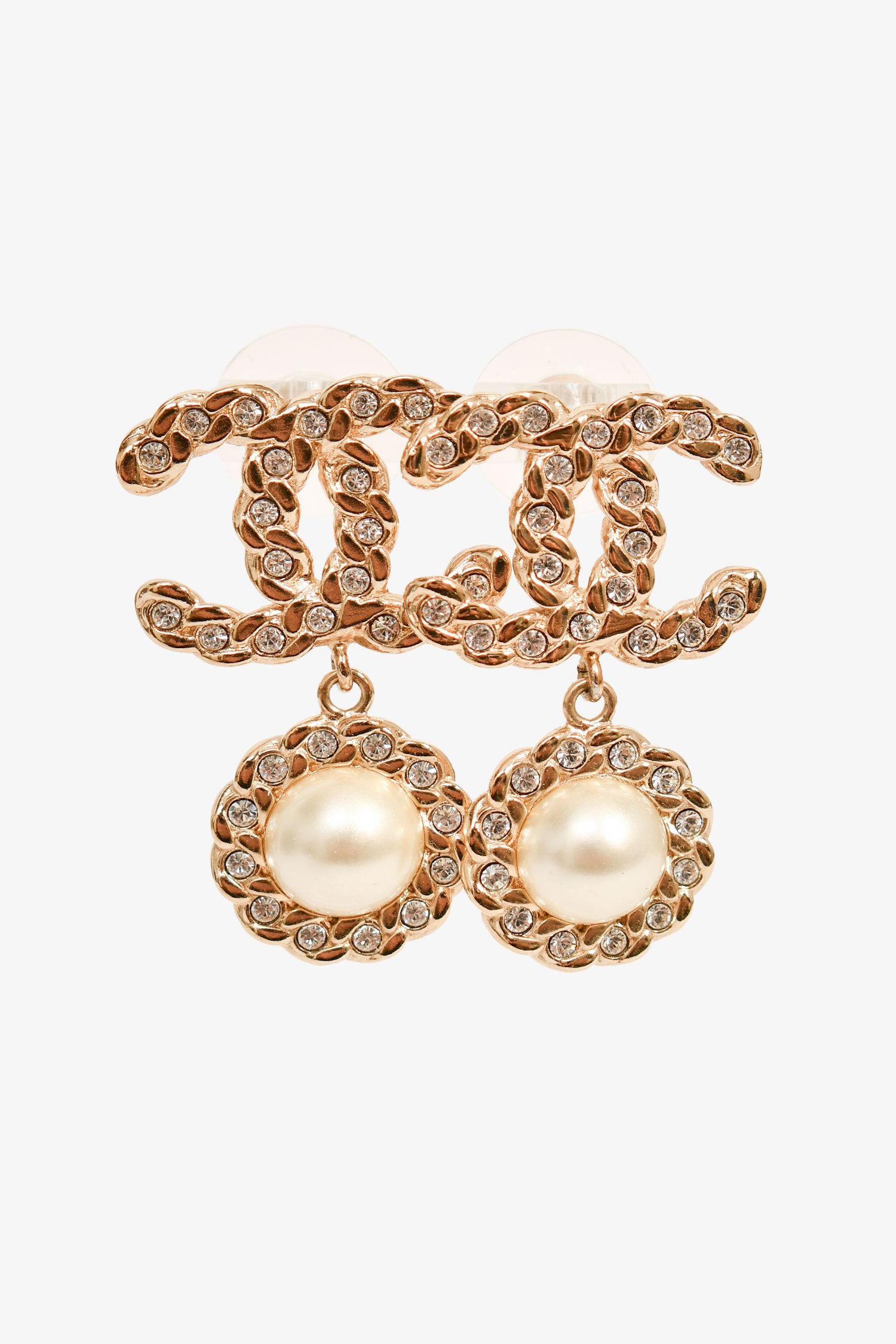 Refresh availabilityPre-Loved Chanel™ 2020 Gold Toned Faux Pearl/Crystal CC Dropstud Earrings. Push post-stud closures.