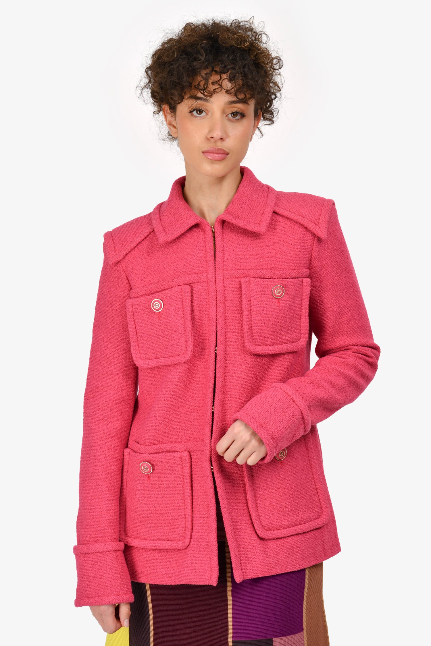 Refresh availabilityPre-Loved Chanel™ 2020 Pink 4 Pocket Tweed Jacket. Front hook and loop closure. 4 front slip pockets with button closure. Button detailing at cuffs. Gold-toned chain detailing along inner hemline. Lined. Gold-toned hardware. Tonal stitching.