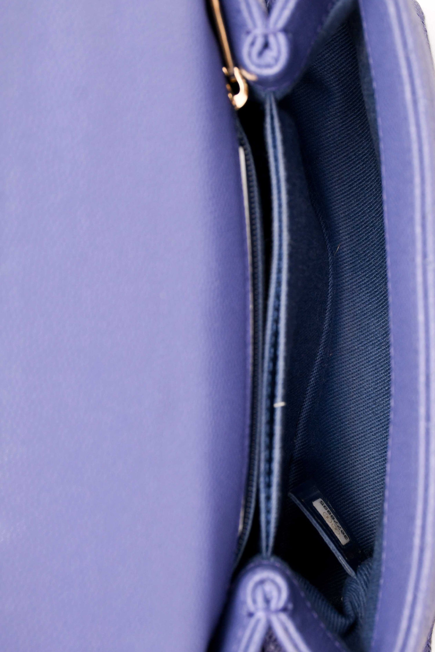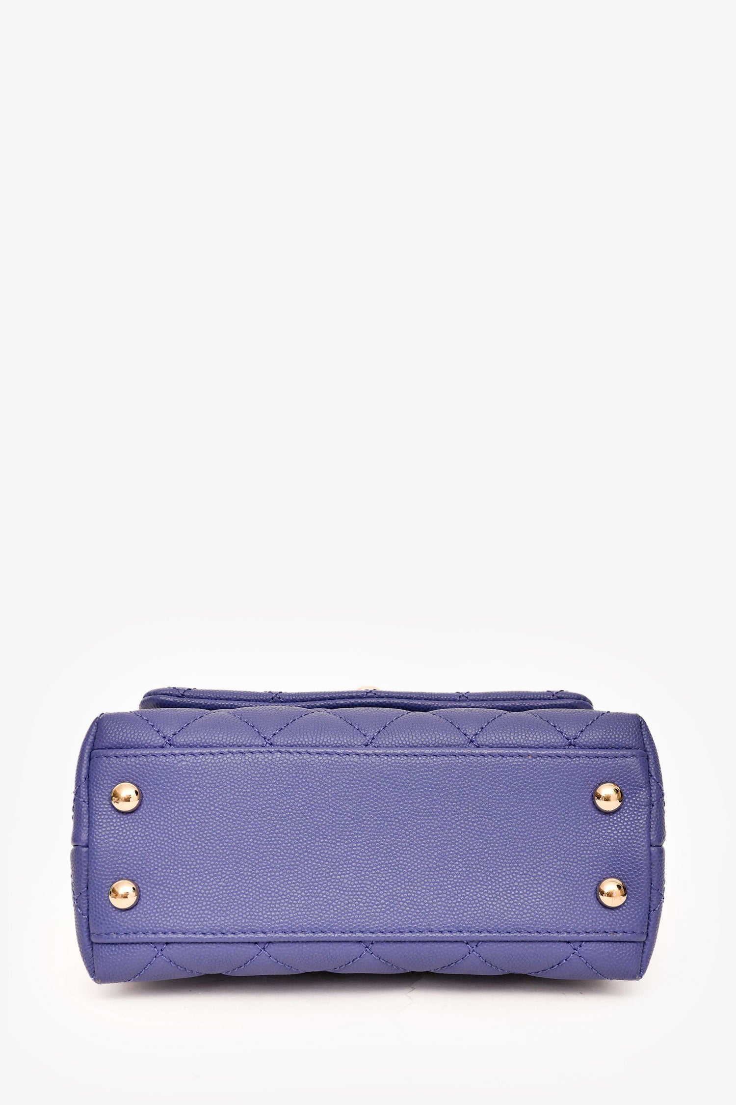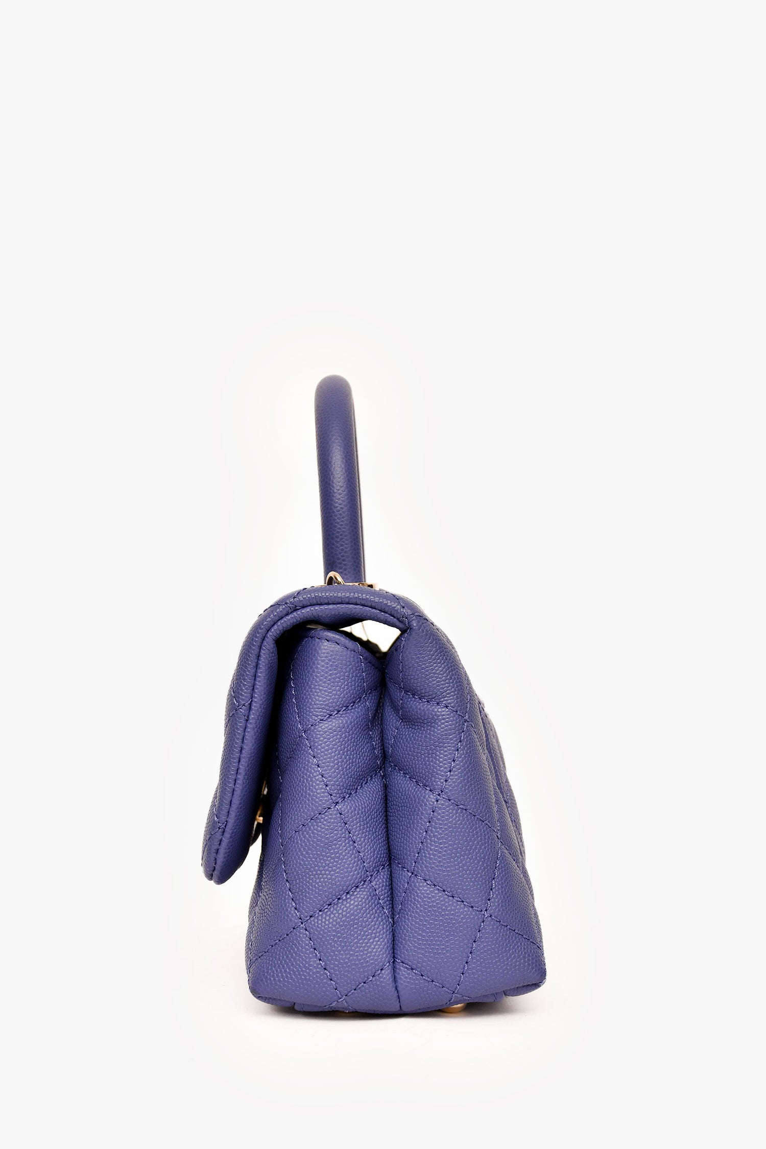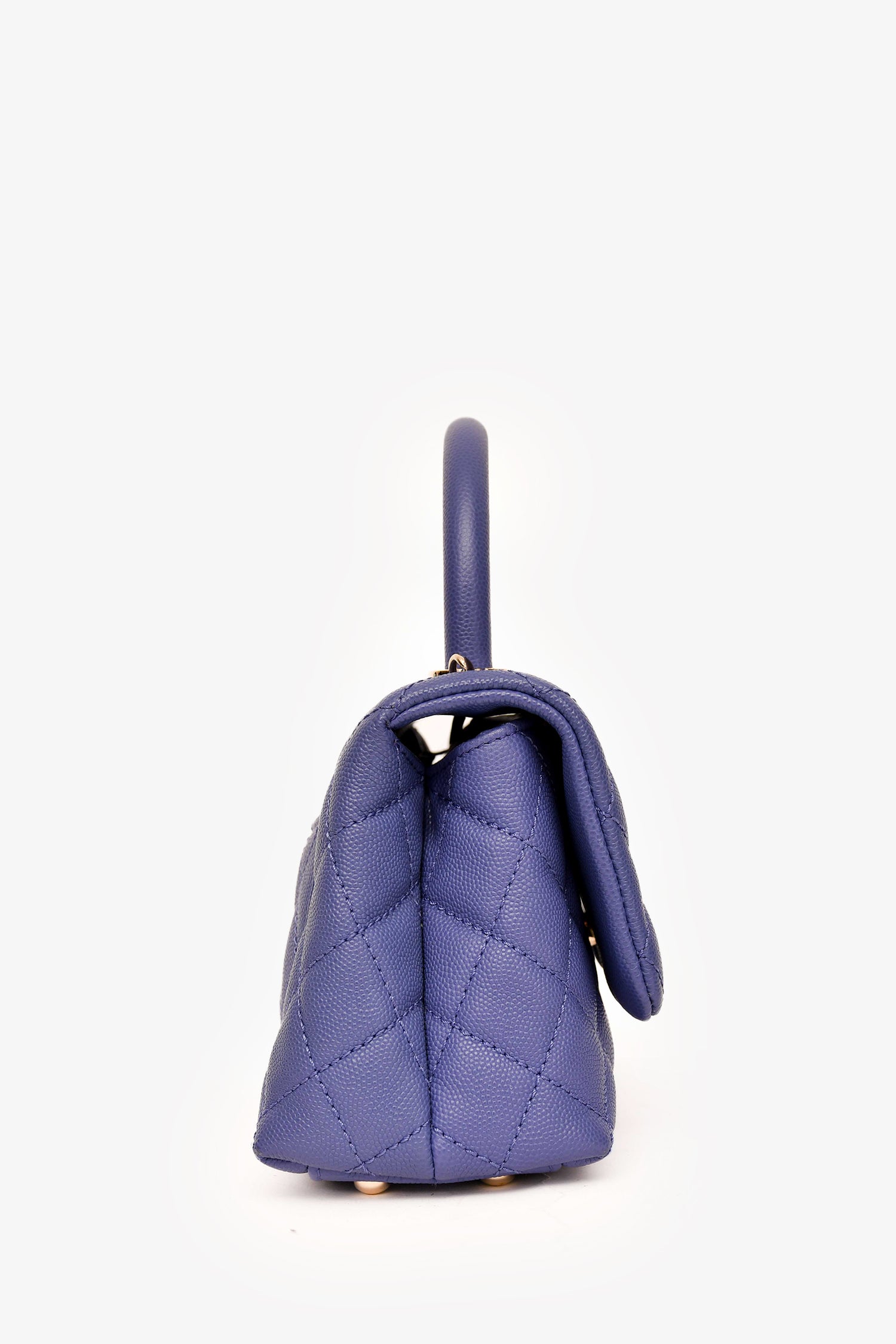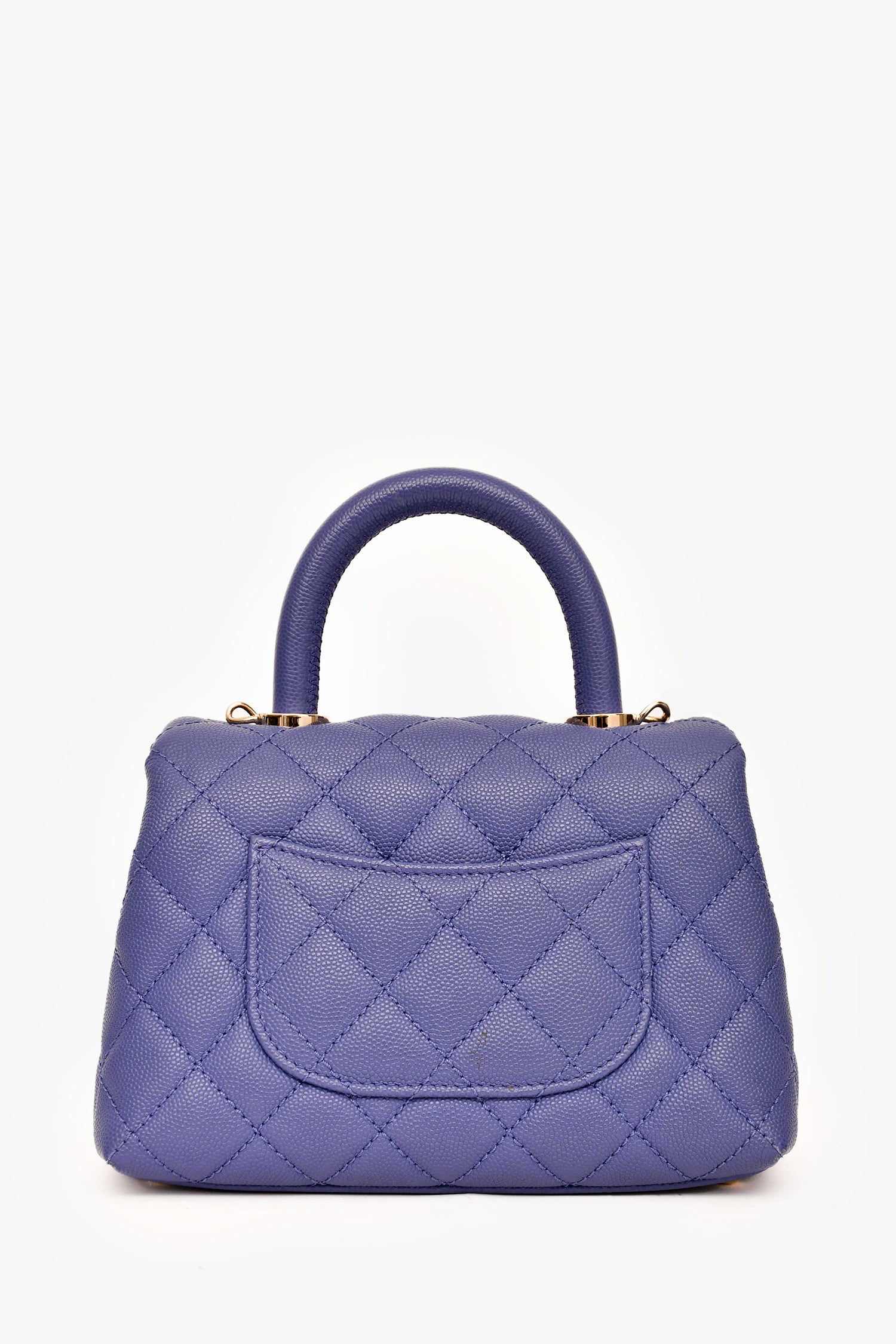 Refresh availabilityPre-Loved Chanel™ 2020 Purple Caviar Leather Mini Coco Top Handle. Front fold-over flap with turn-lock closure. Single exterior slip pocket. Removable crossbody strap. 3 interior compartments. Tonal textile interior lining. Single interior zip pocket. Gold-toned hardware. Tonal stitching.