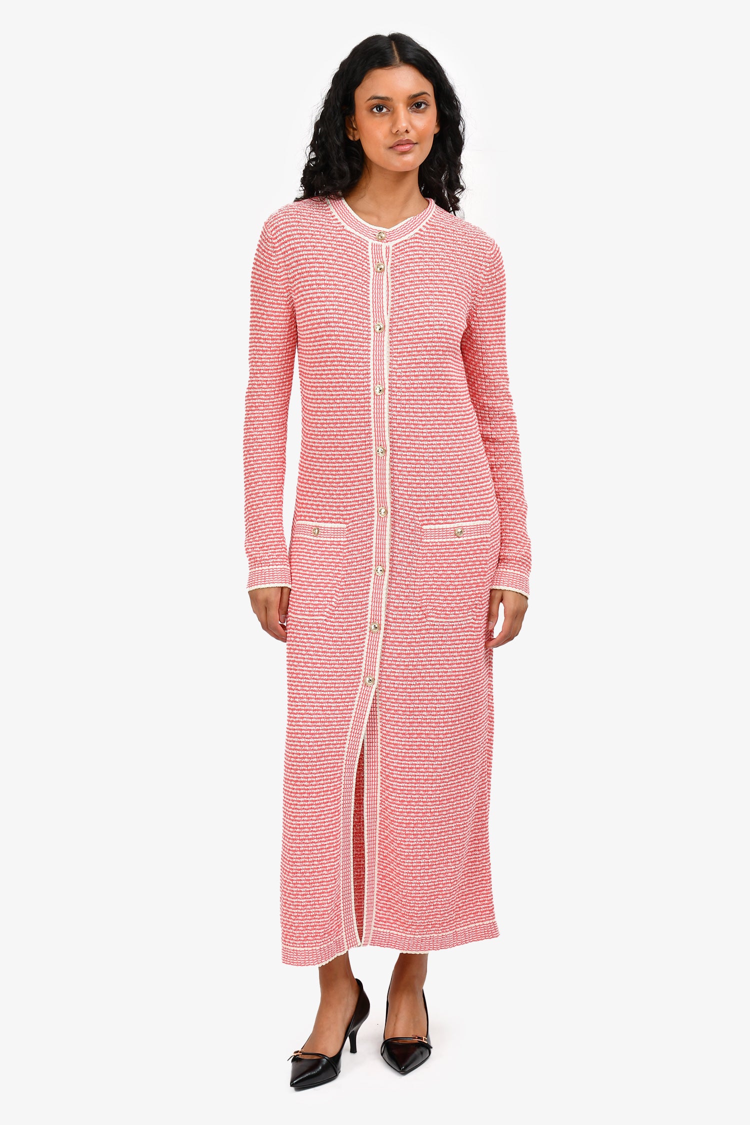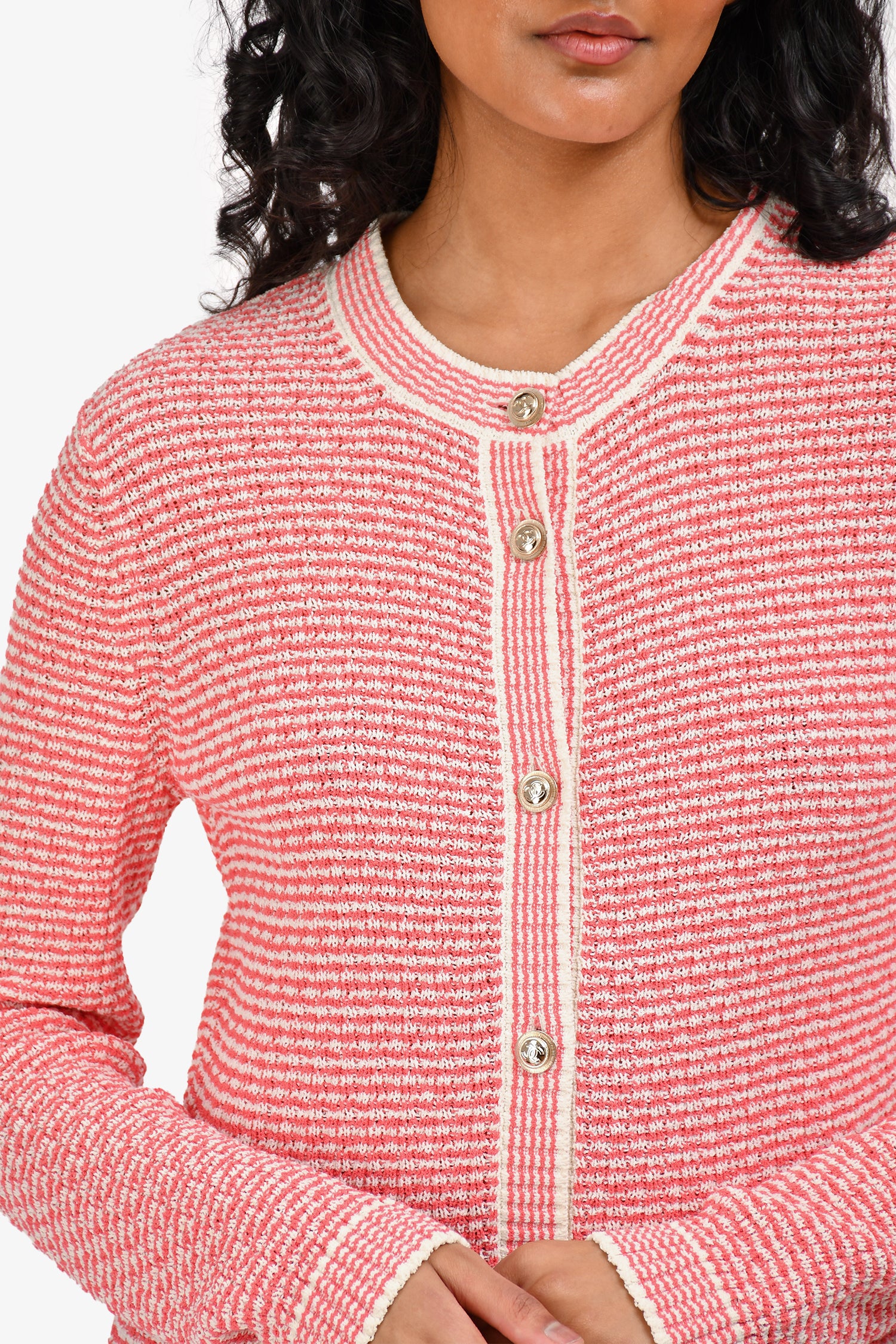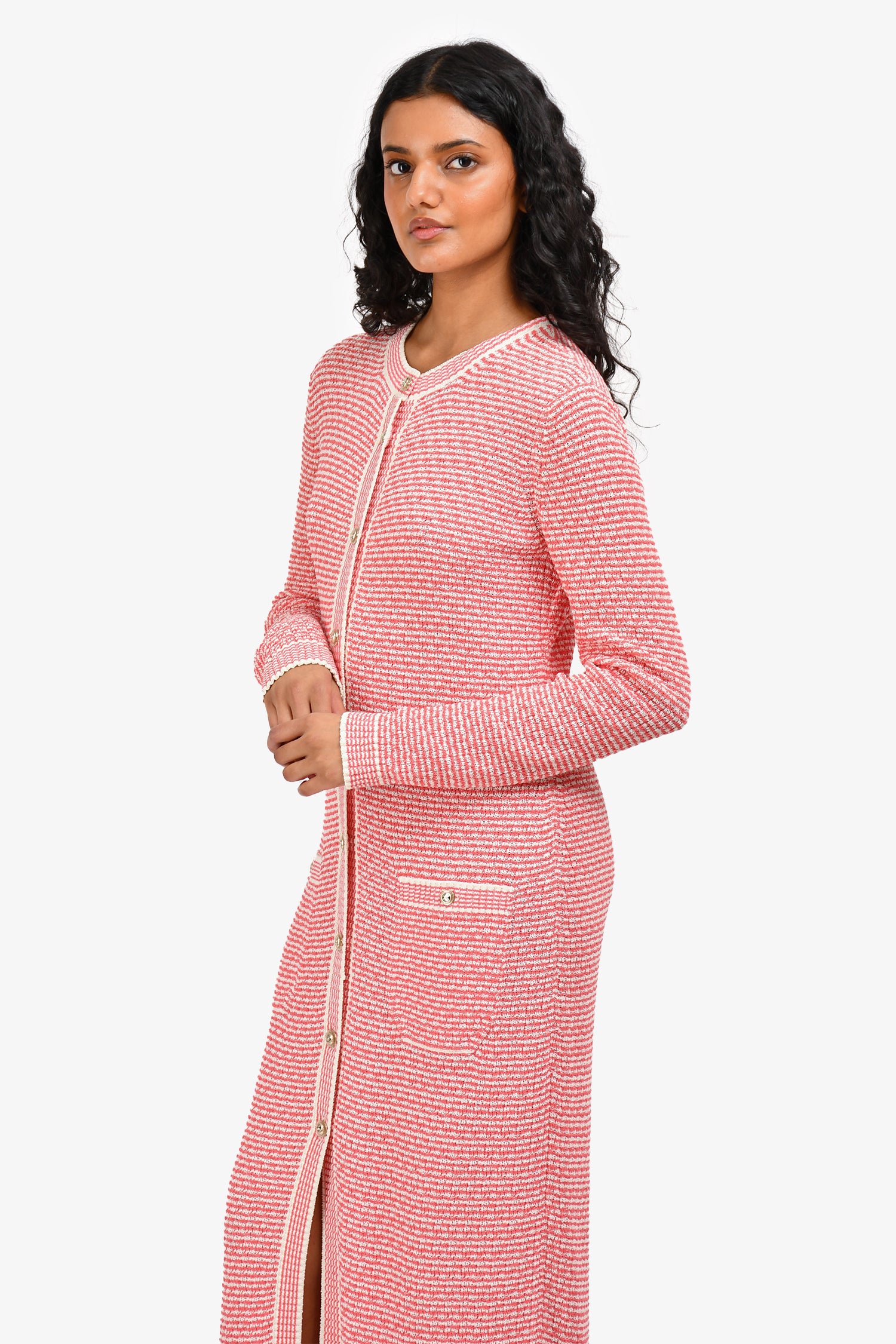 Refresh availabilityPre-Loved Chanel™ 2021 Pink Cotton Knit Long Cardigan. Front button-down closure. 2 front slip pockets with CC buttons. Ribbed collar, cuffs and hem. Gold-toned hardware. Tonal stitching.