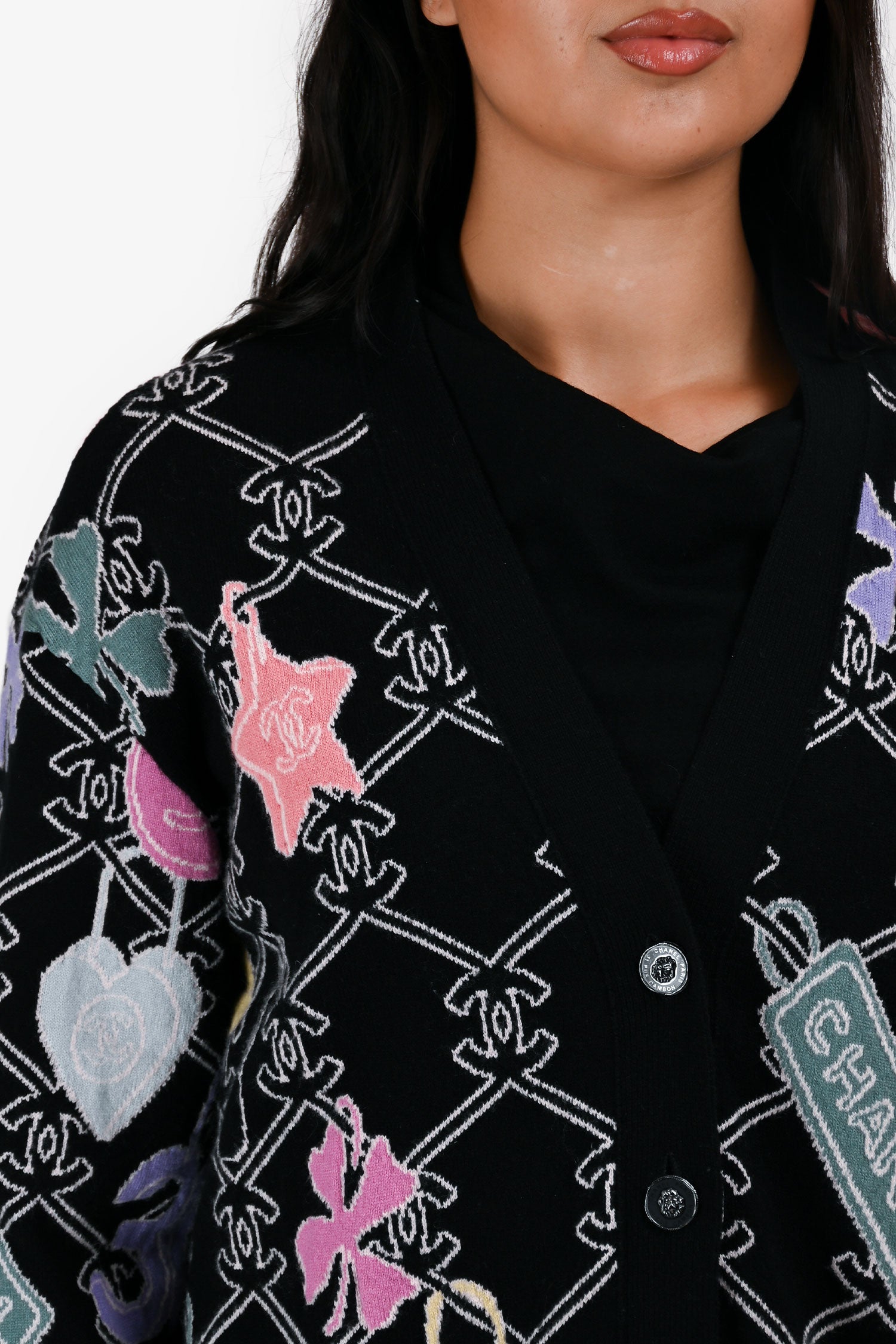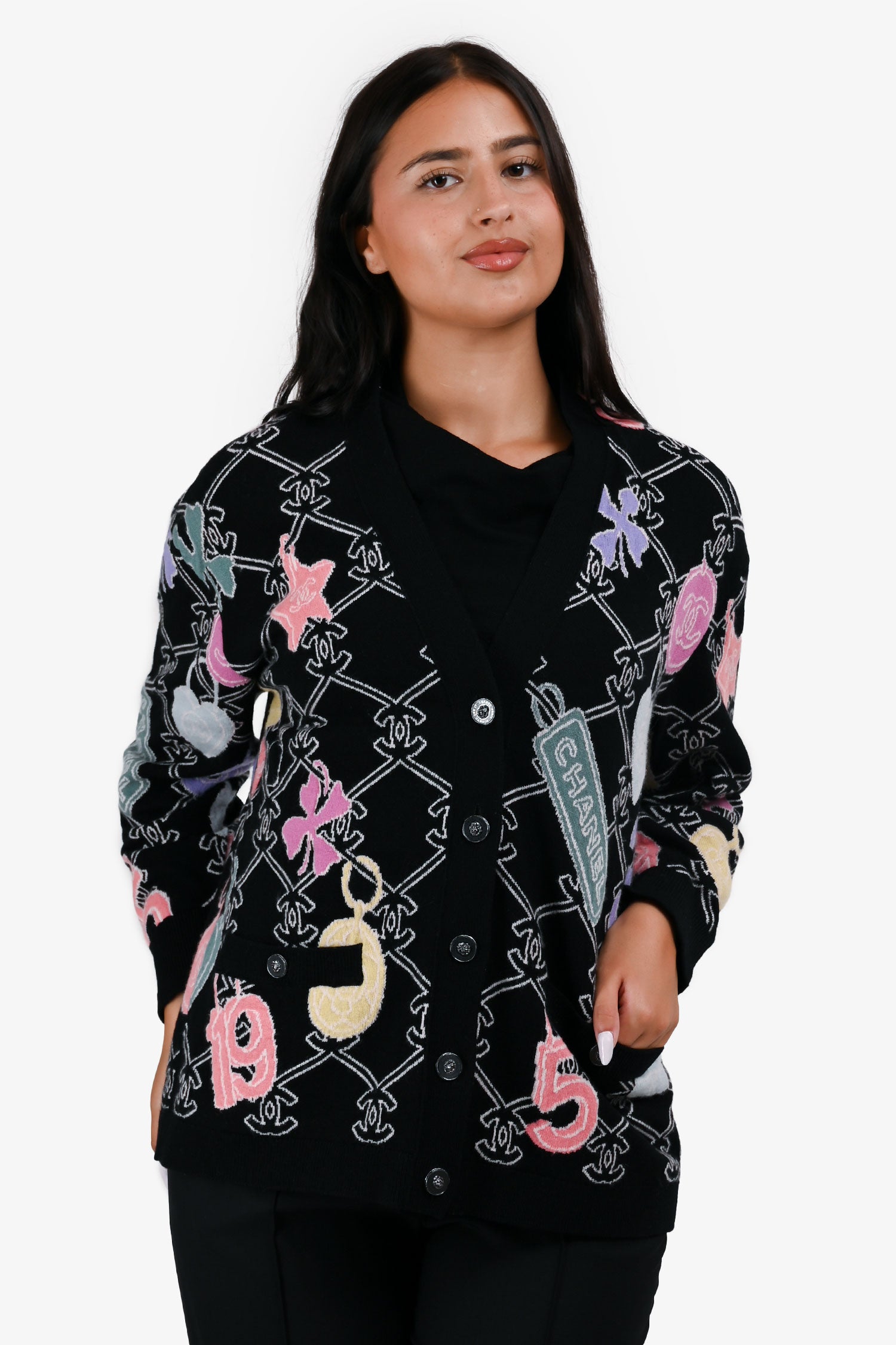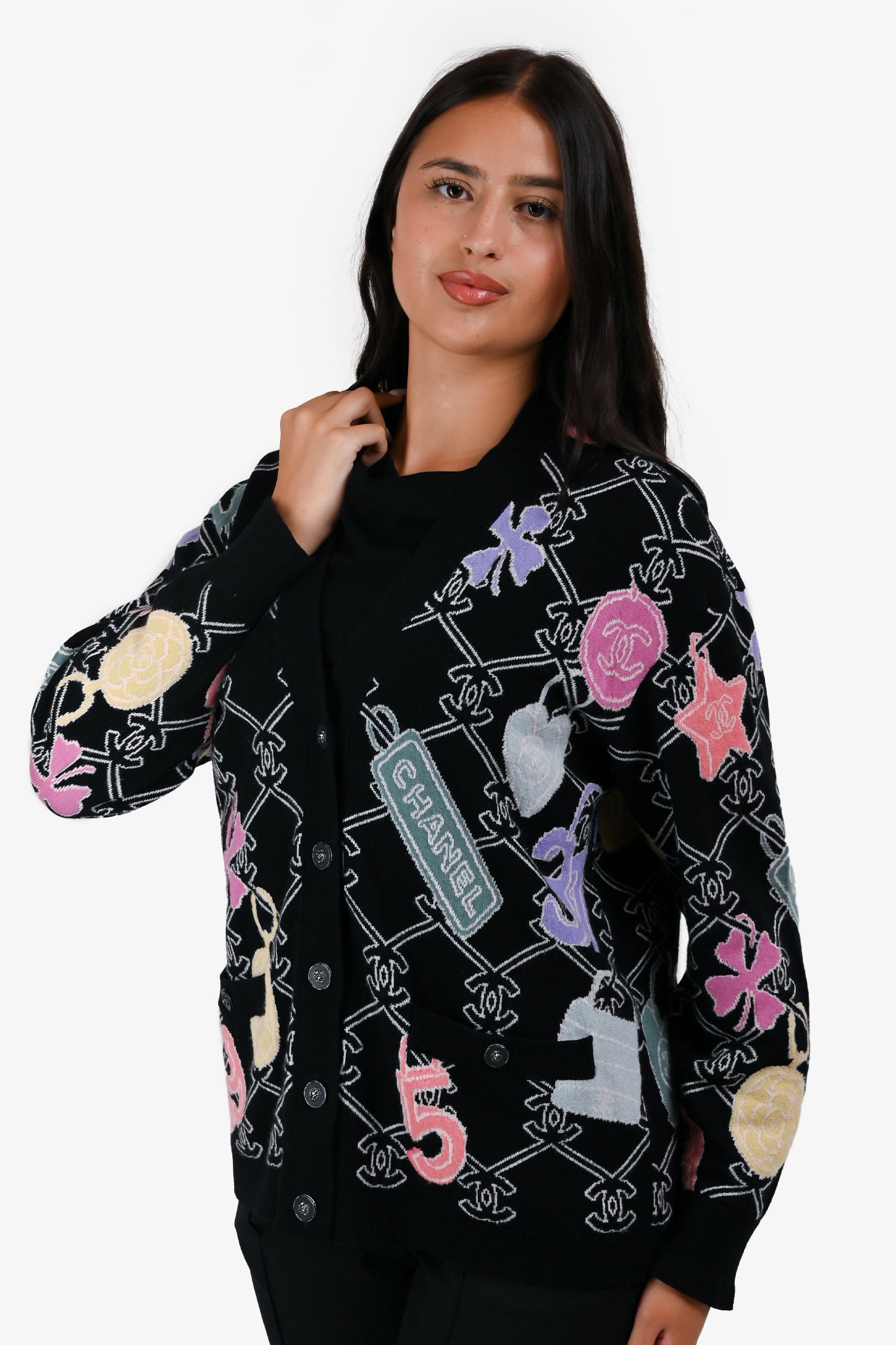 Pre-Loved Chanel™ 2022 Black Cashmere Logo Graphic Cardigan Size 38