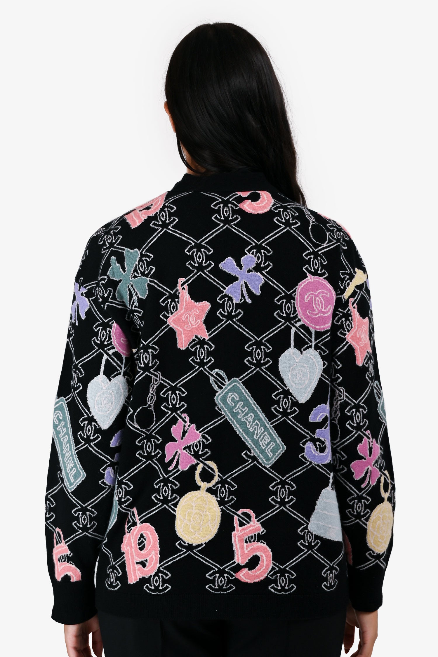 Refresh availabilityPre-Loved Chanel™ 2022 Black Cashmere Logo Graphic Cardigan. V-neck. Front button-up closure. Front pockets.