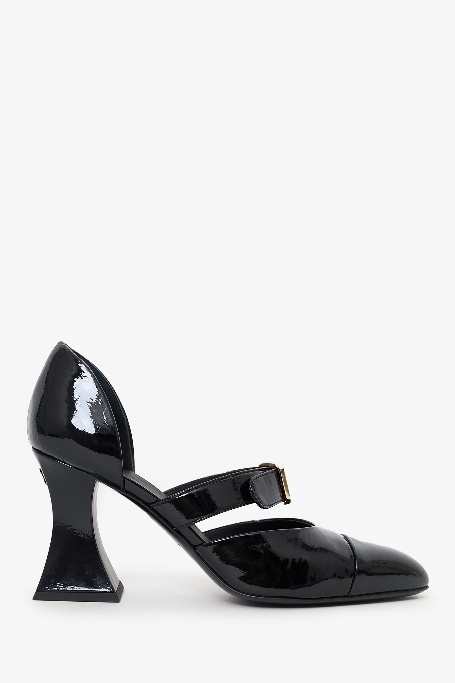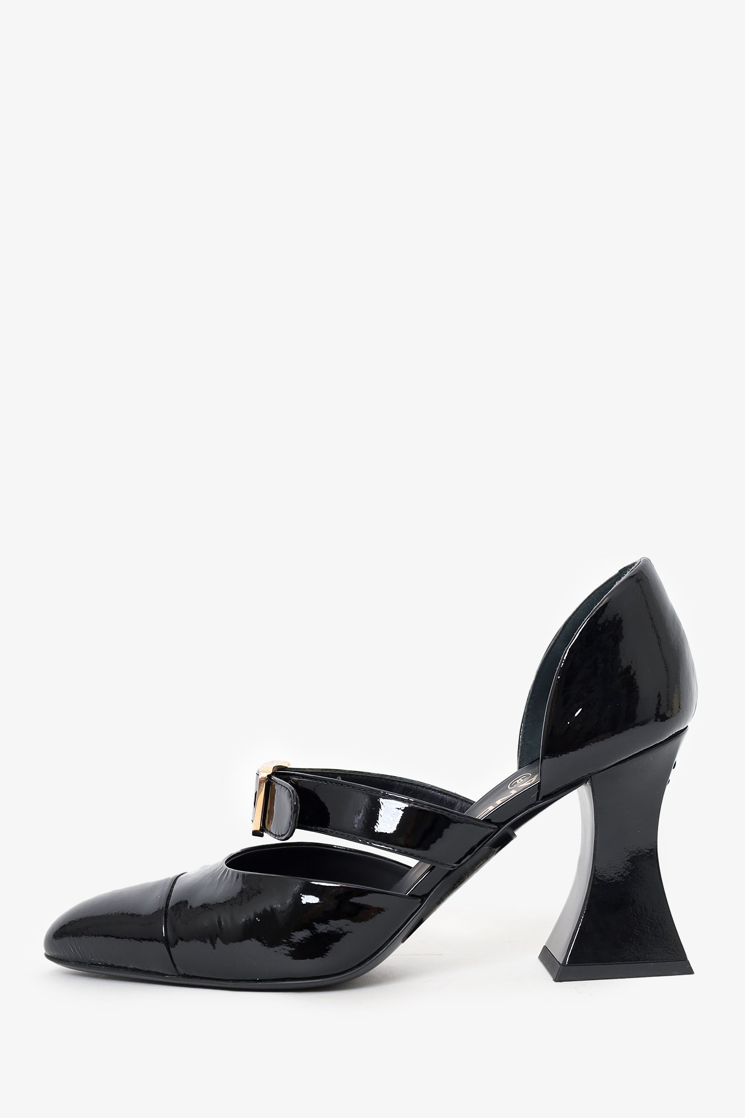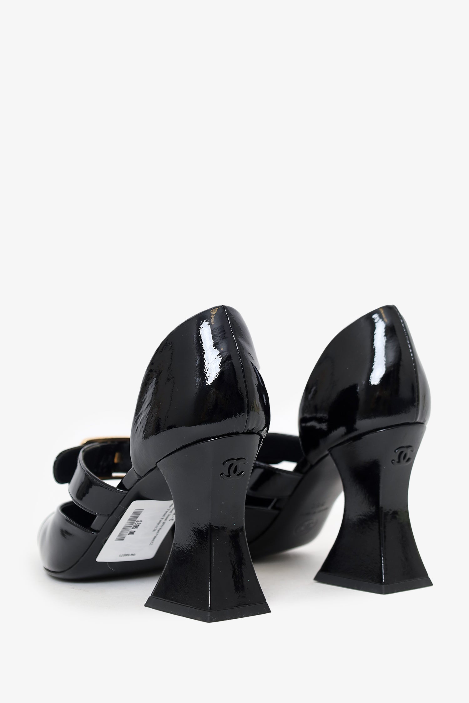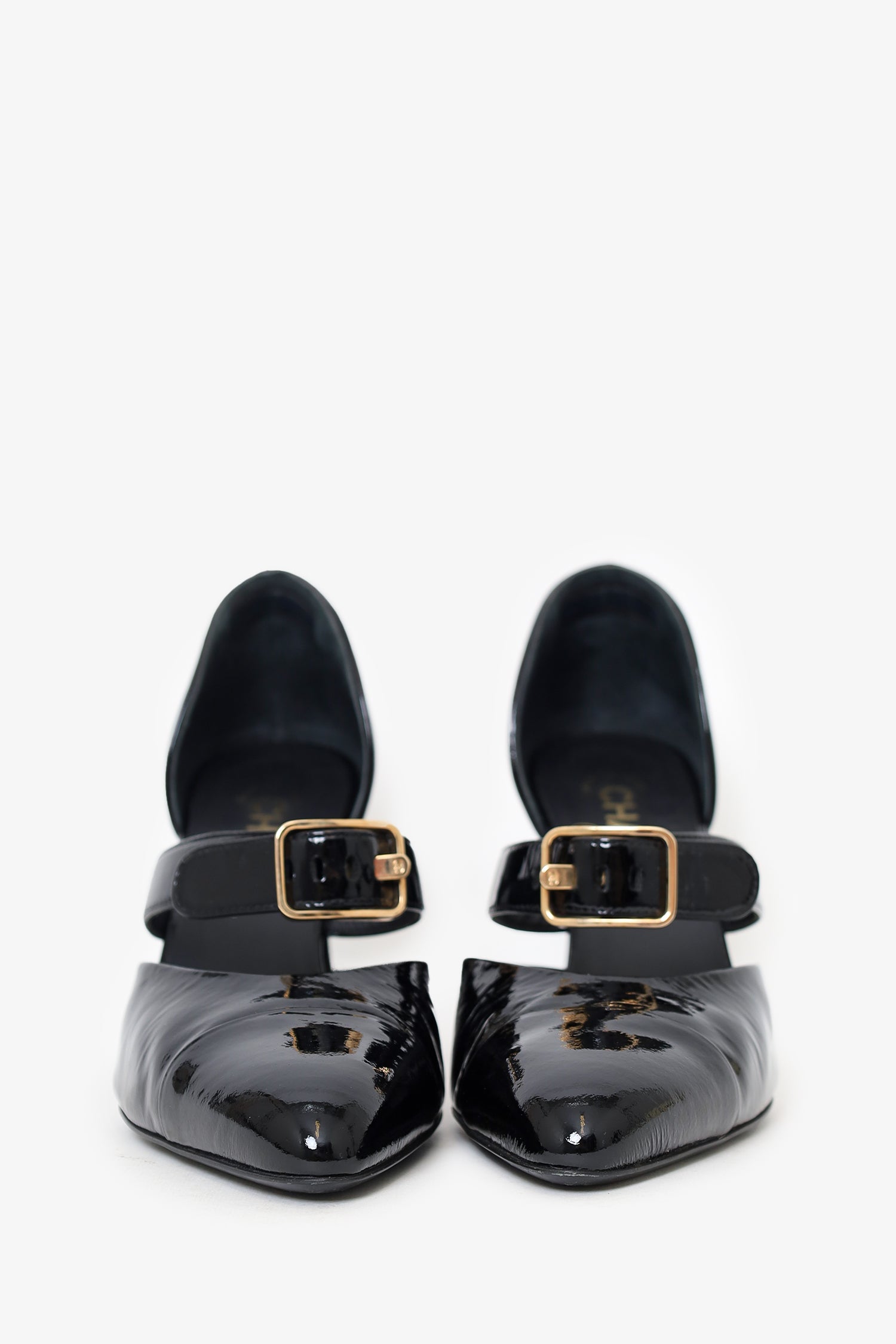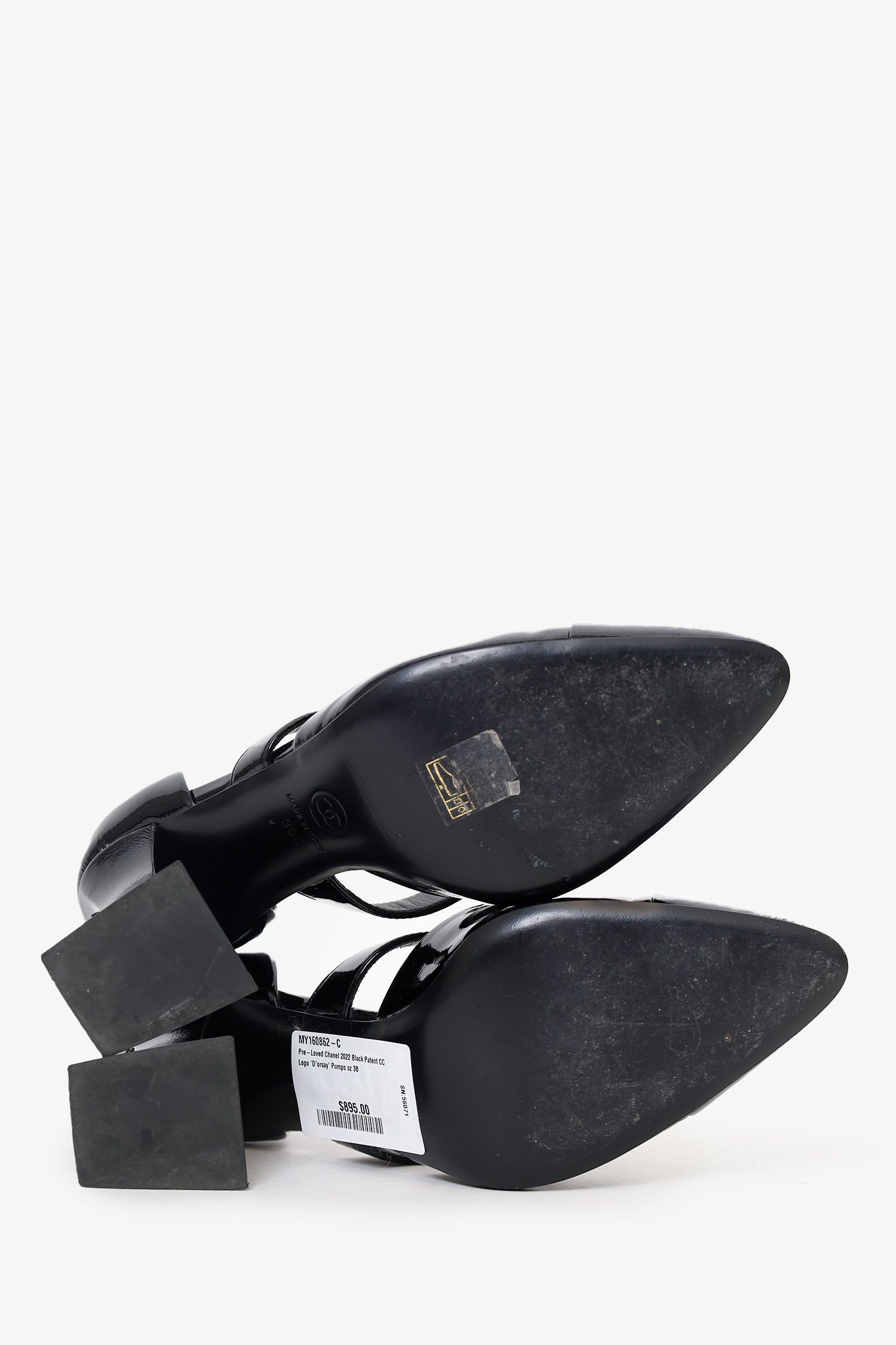 Refresh availabilityPre-Loved Chanel™ 2022 Black Patent CC Logo 'D'orsay' Pumps. Slip-on. Pointed-toe. Top strap with adjustable buckle closure. Gold-tone hardware. Tonal stitching.