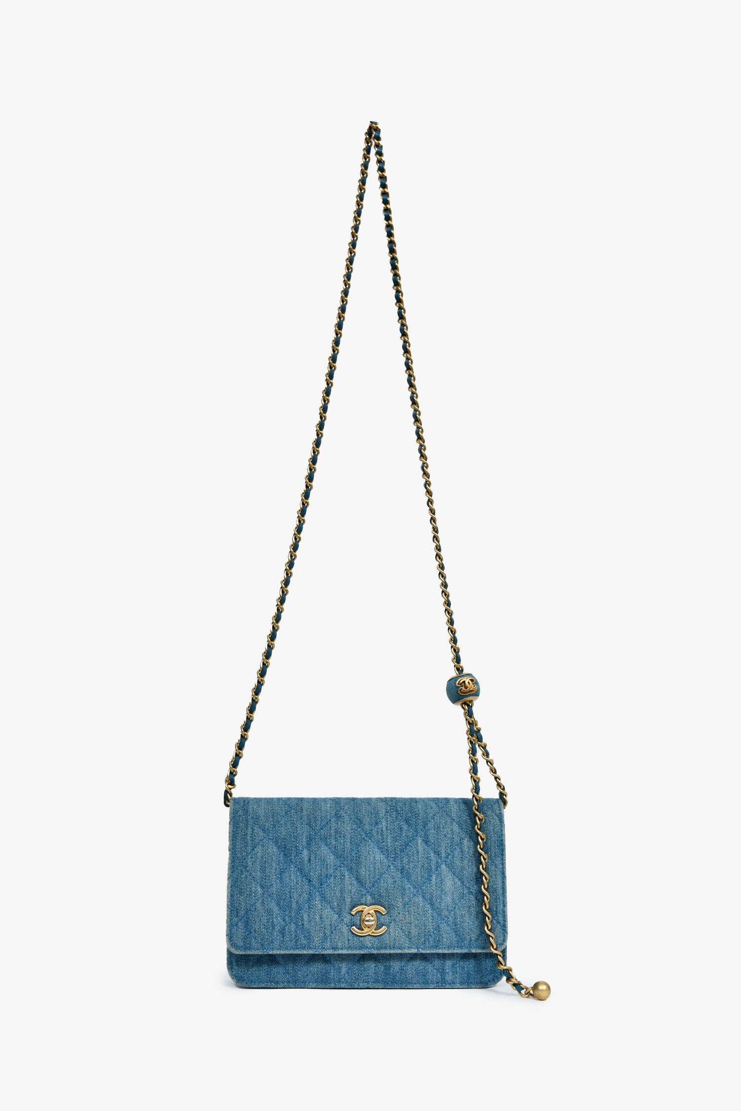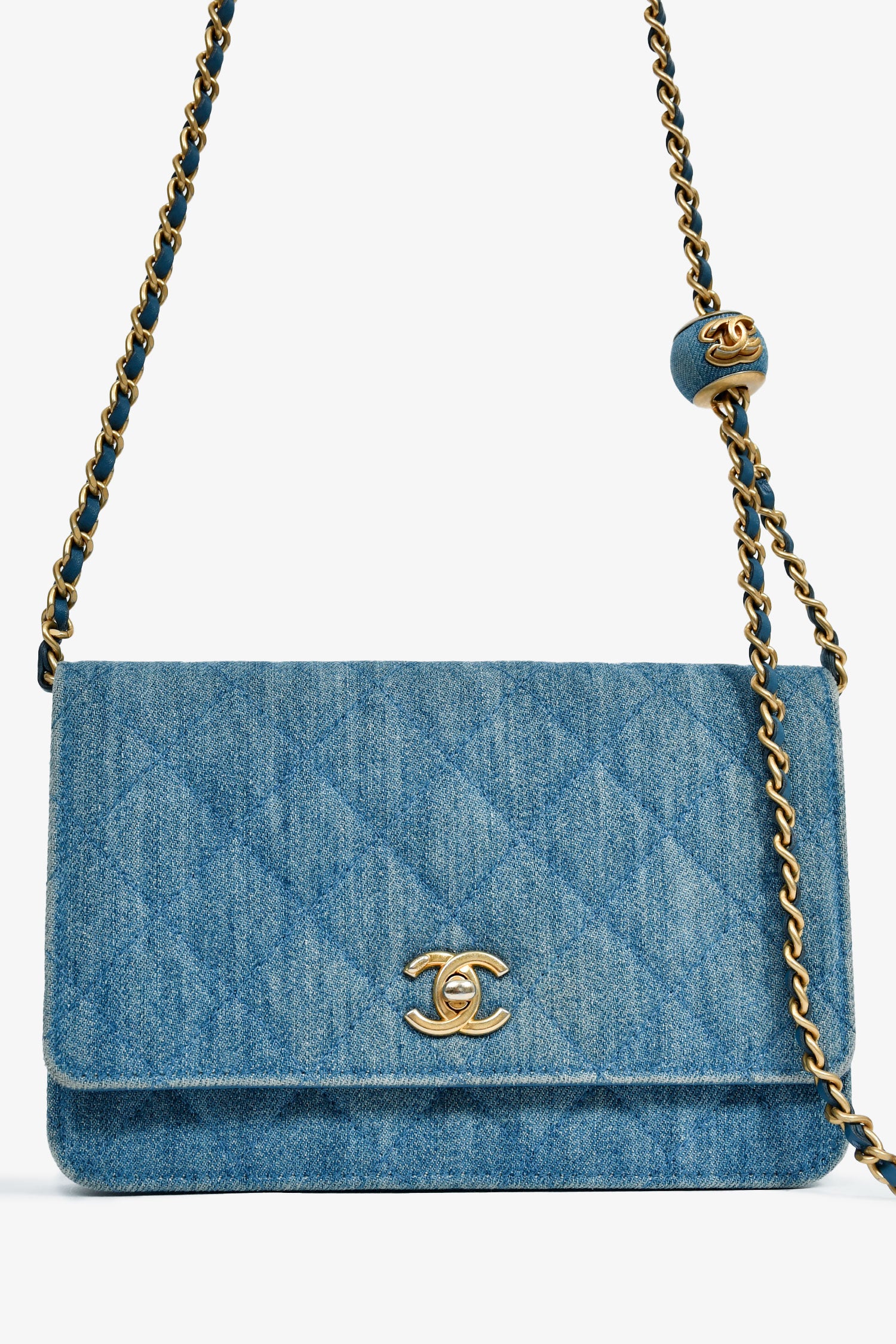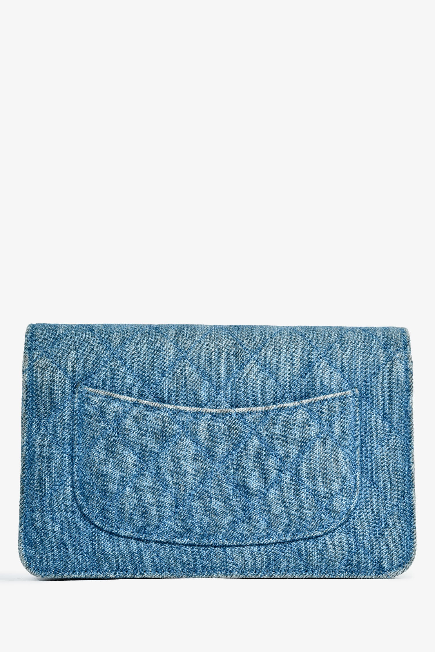 Pre-Loved Chanel™ 2022 Blue Denim Wallet On Chain. Front fold-over flap with turn-lock closure. Front and rear exterior slip pocket. Inner flap zip pocket. Single interior compartment with six card slots, a wall slip and zip pocket. Tonal leather lining. Gold-tone hardware. Tonal stitching.