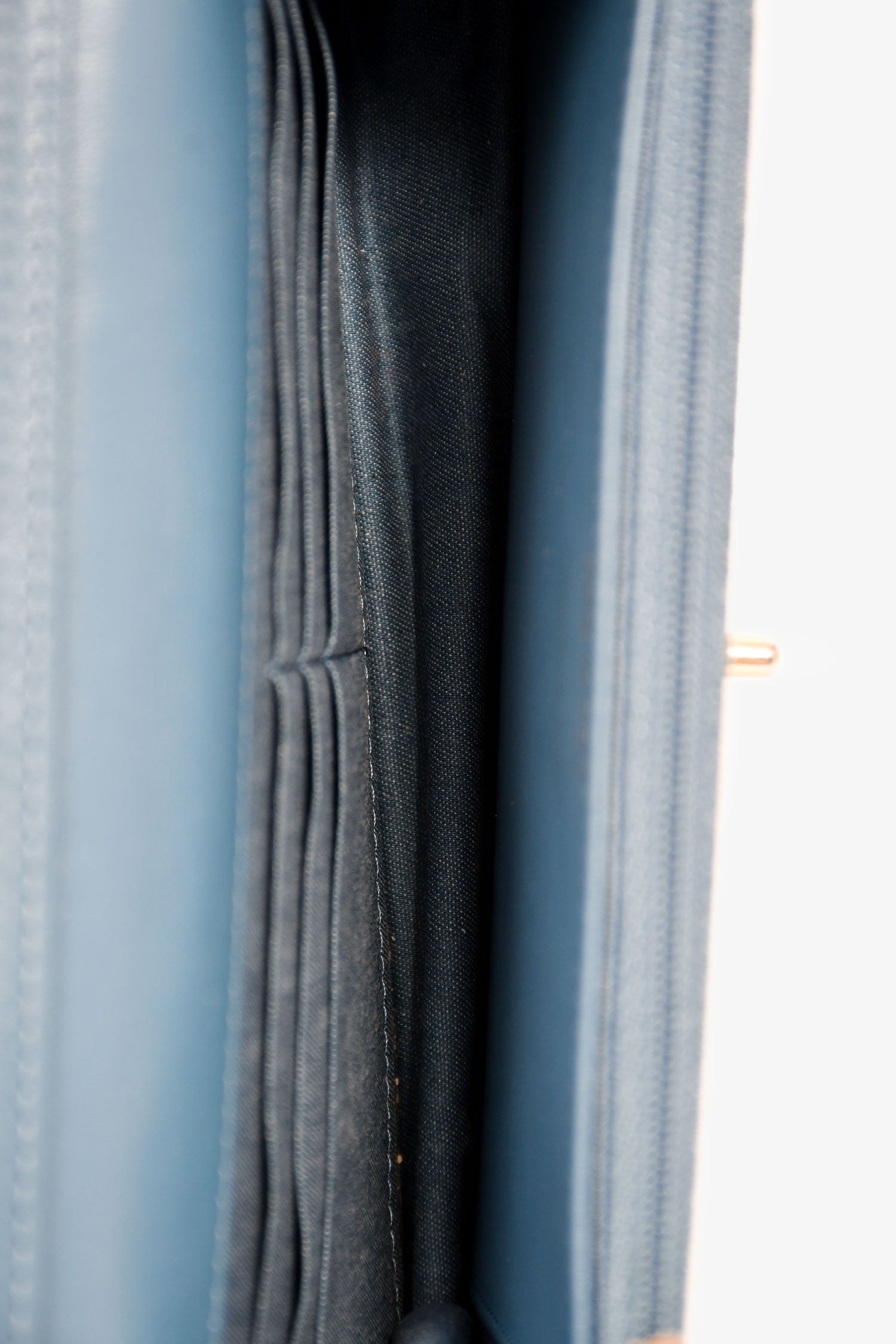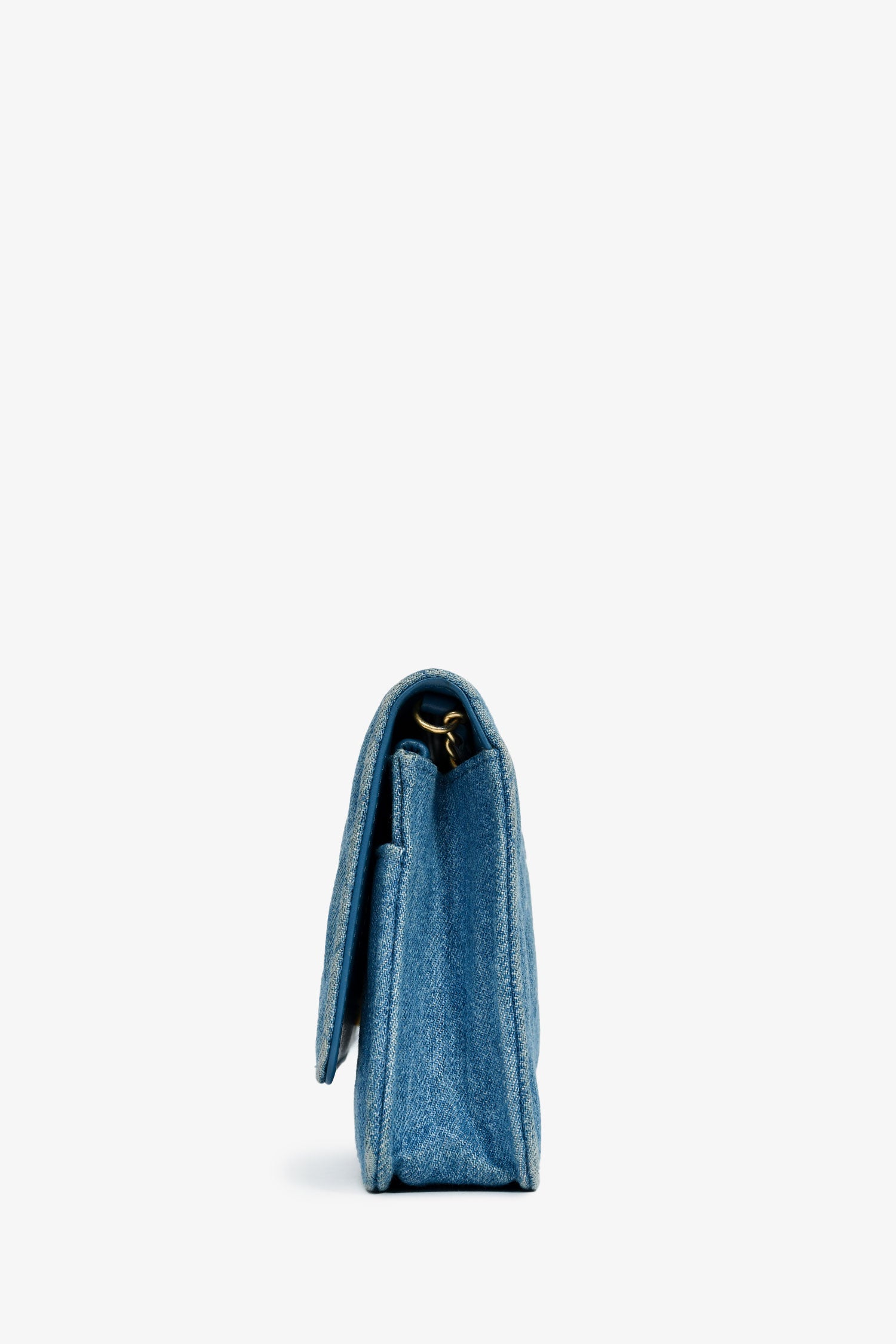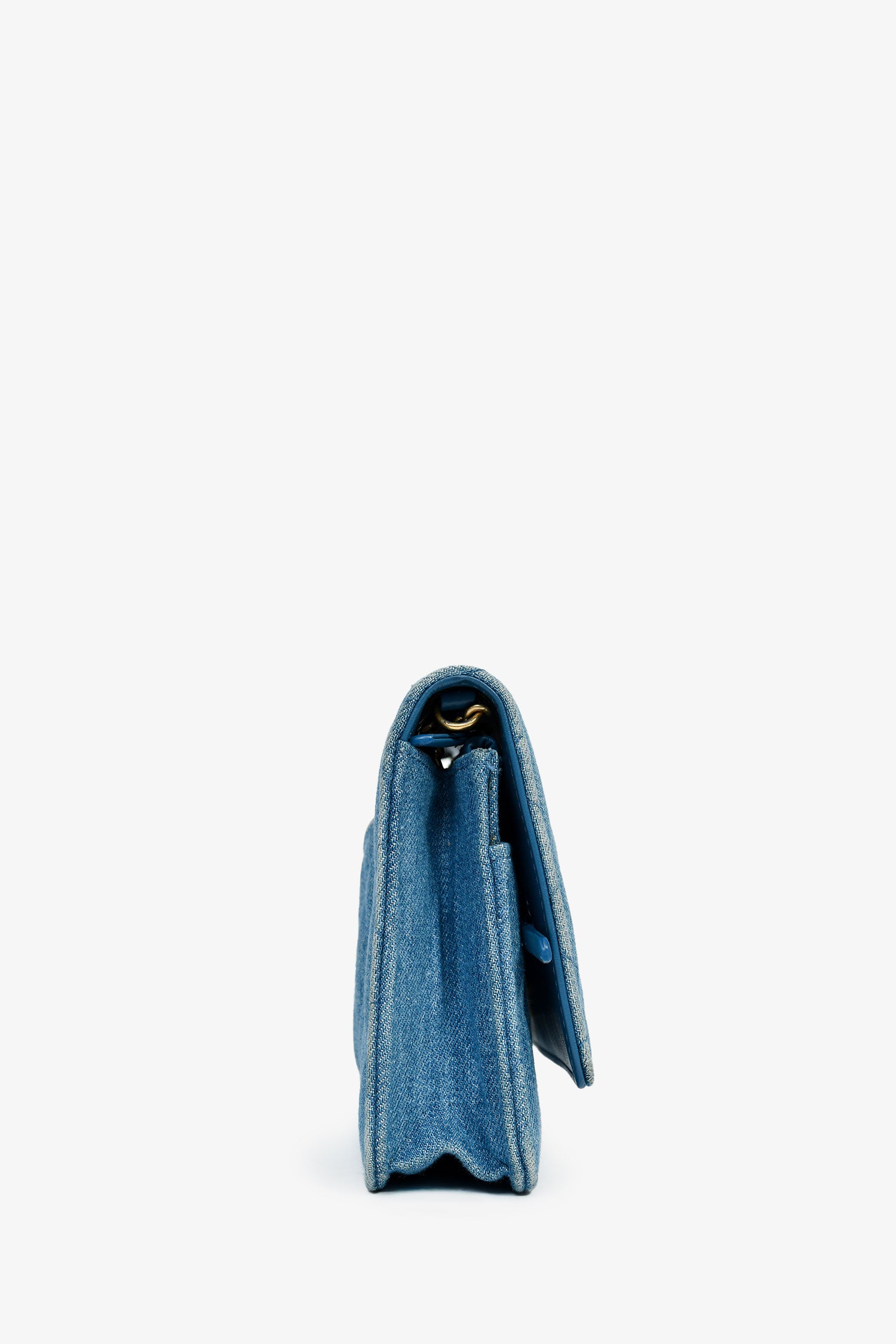 Pre-Loved Chanel™ 2022 Blue Denim Wallet On Chain. Front fold-over flap with turn-lock closure. Front and rear exterior slip pocket. Inner flap zip pocket. Single interior compartment with six card slots, a wall slip and zip pocket. Tonal leather lining. Gold-tone hardware. Tonal stitching.