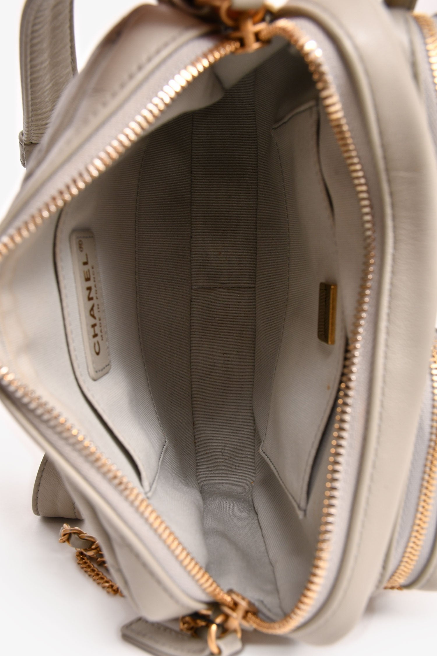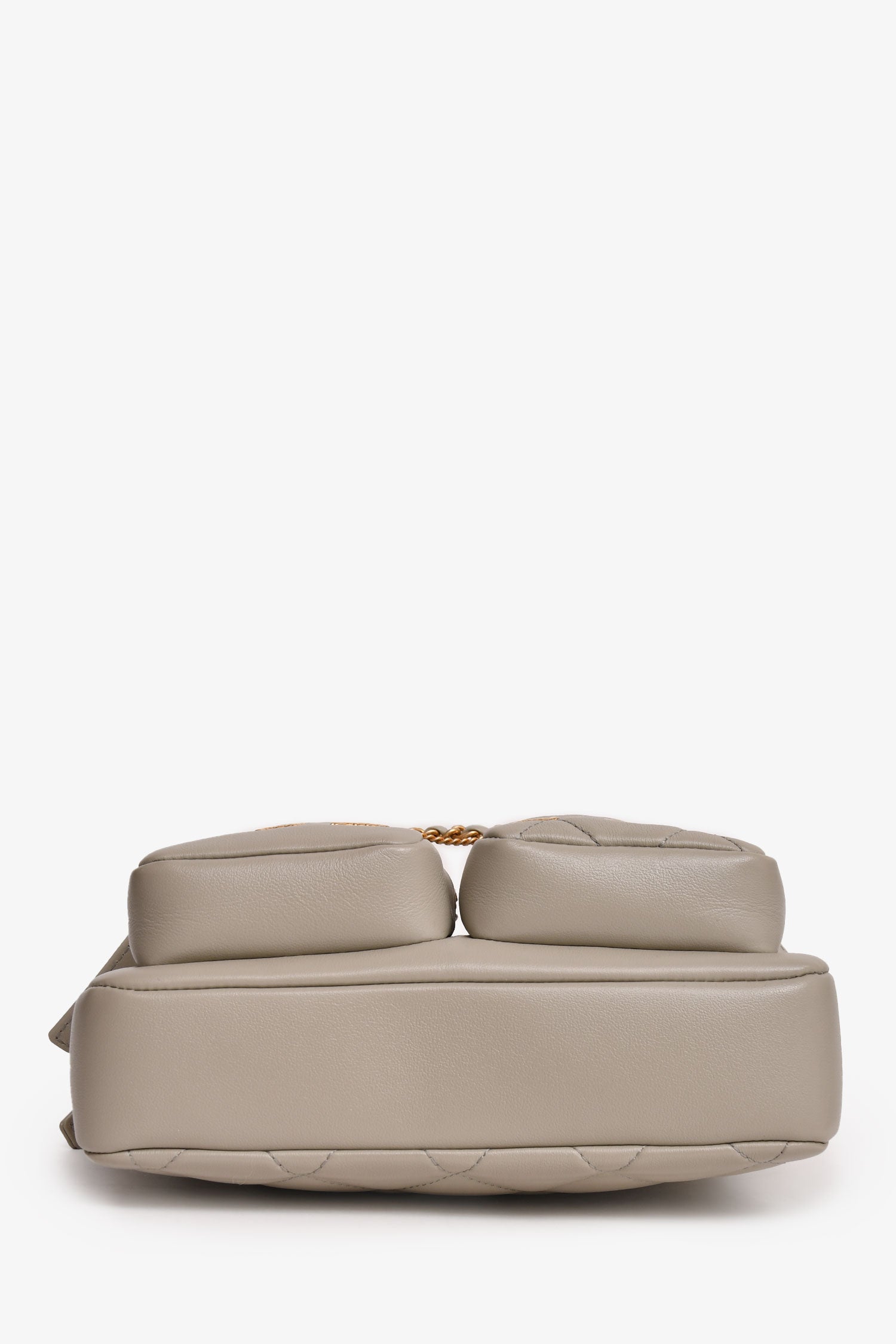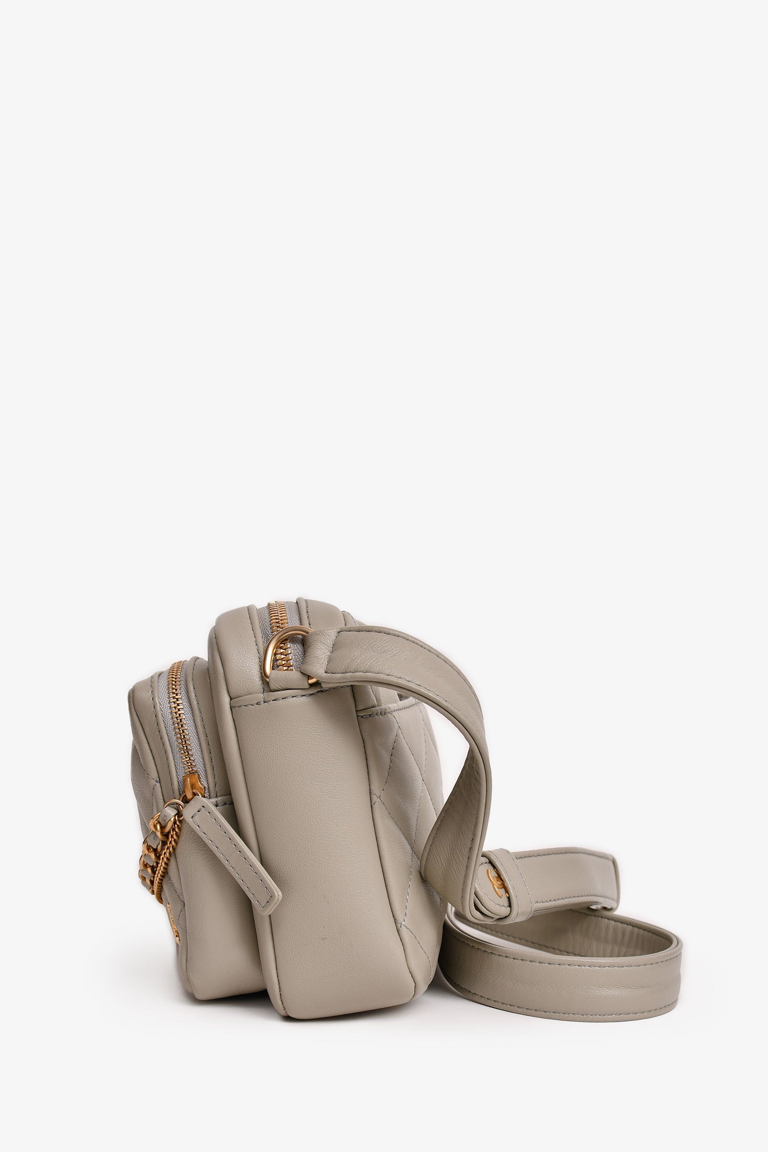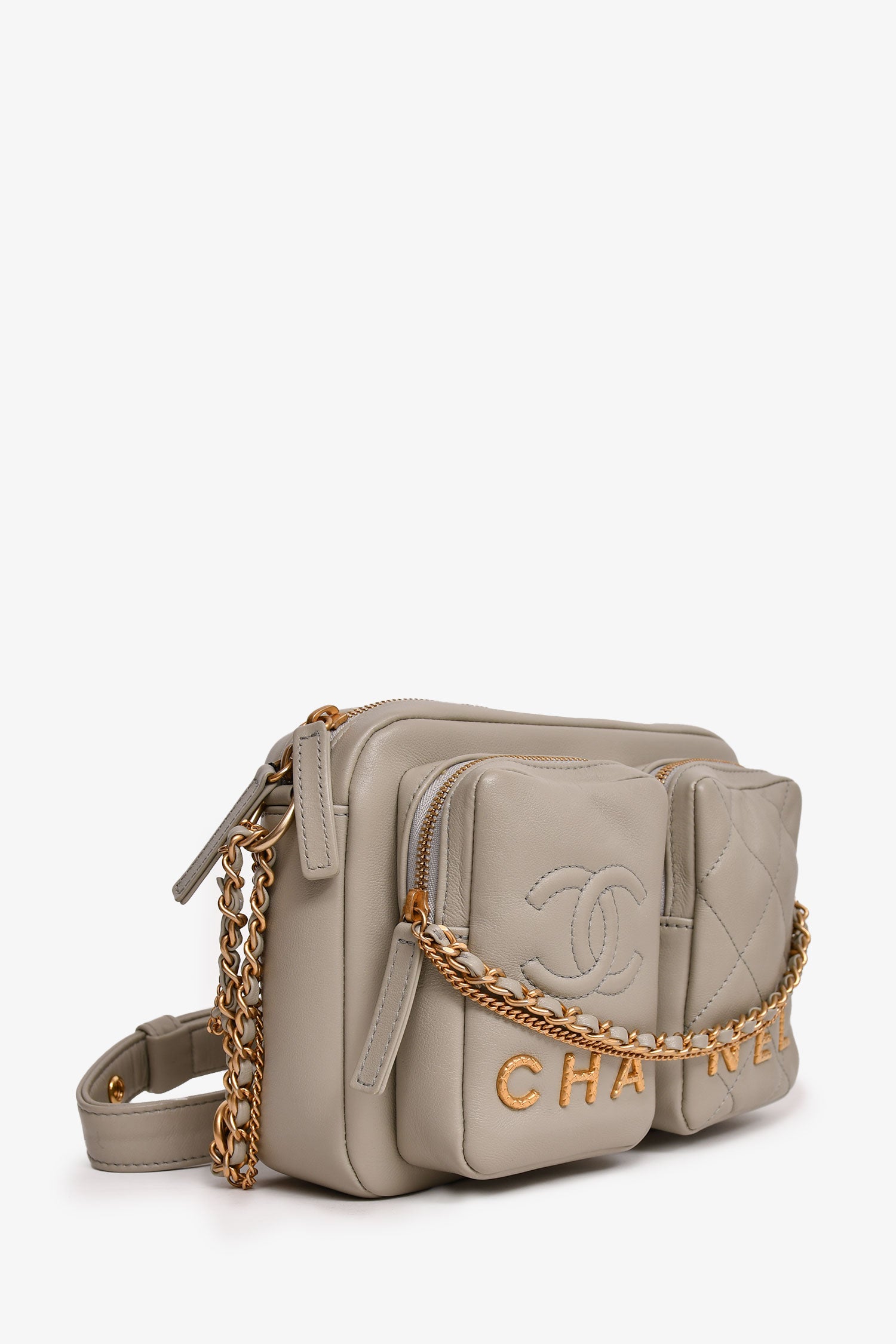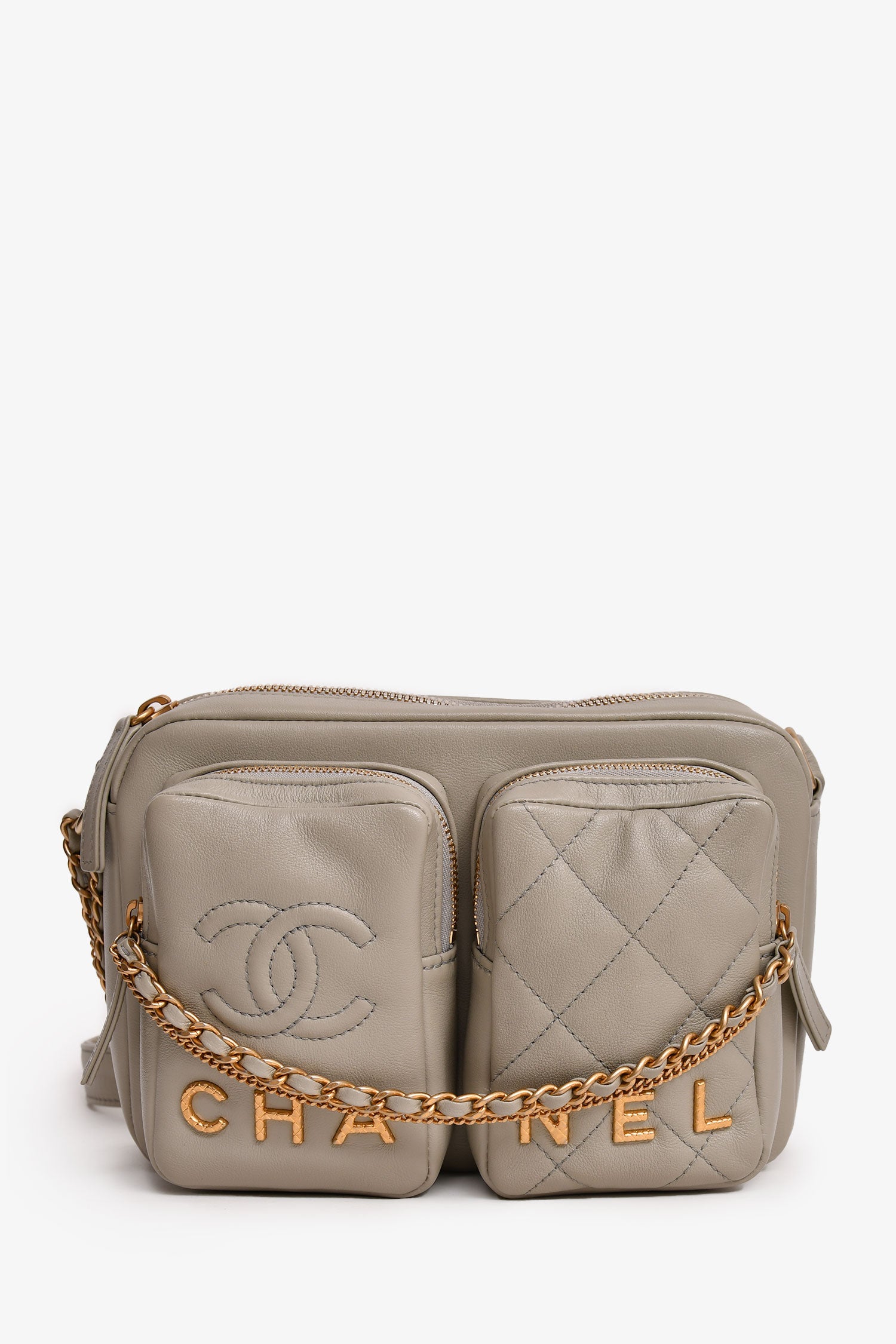 Refresh availabilityPre-Loved Chanel™ 2022 Grey Leather Chain Detail Camera Bag. Top zipper closure. Two exterior pockets with zipper closures. One back pocket with magnetic button closure. Two interior pockets. Adjustable strap. Quilted leather. Tonal stitching.