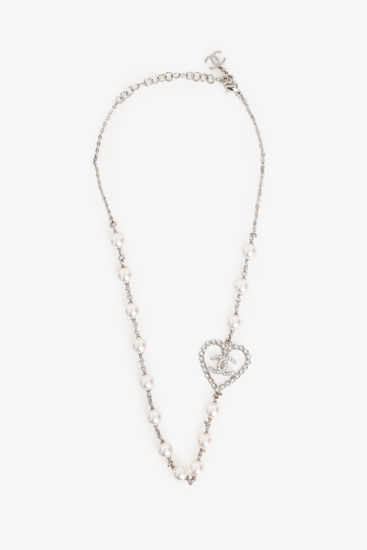 Pre-Loved Chanel™ 2025 Silver-Tone Metal/ Faux Pearl Heart Logo Necklace. Lobster clasp closure. Heart-shaped pendant featuring faux pearl detail and iconic CC logo. Engraved brand plaque near clasp.