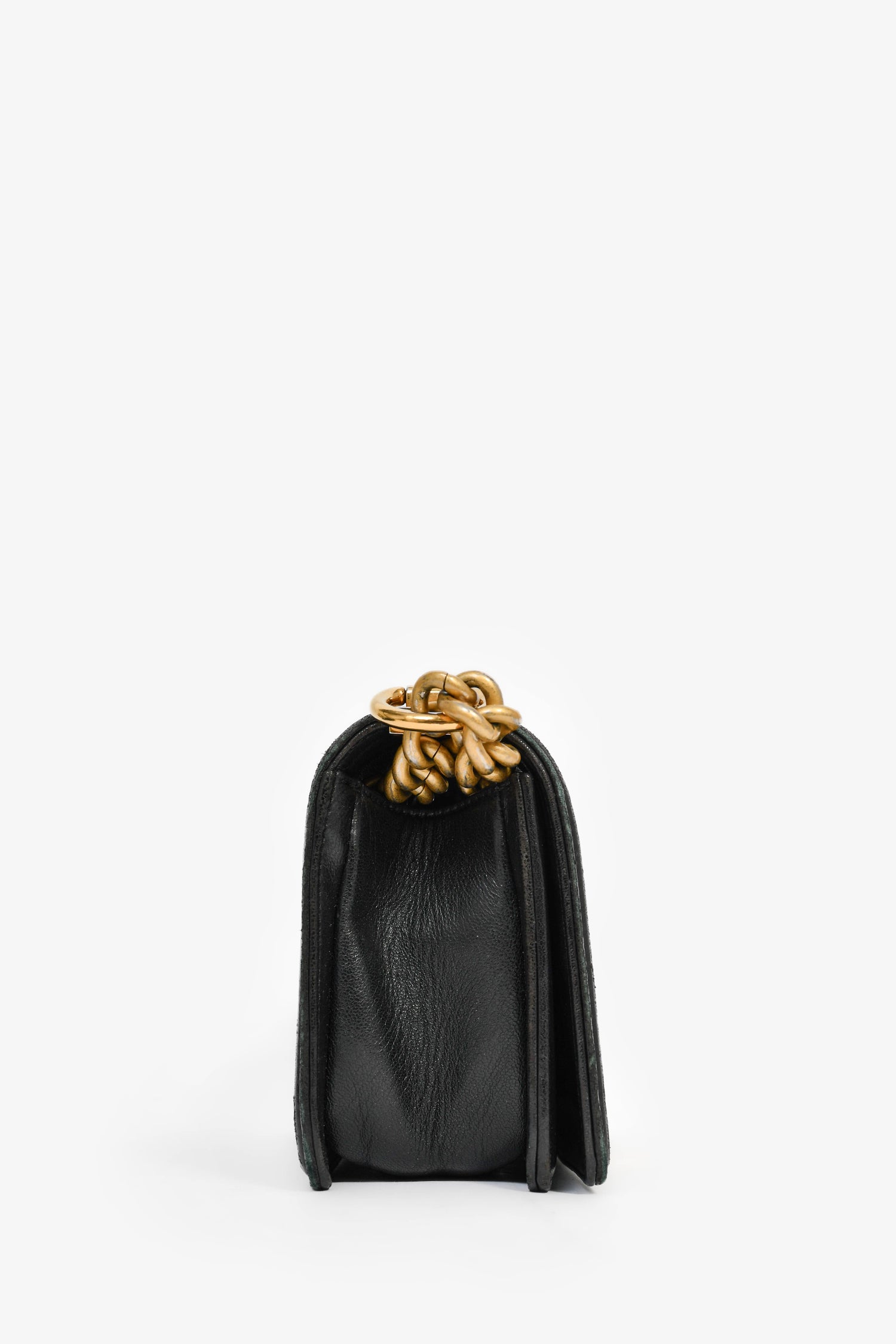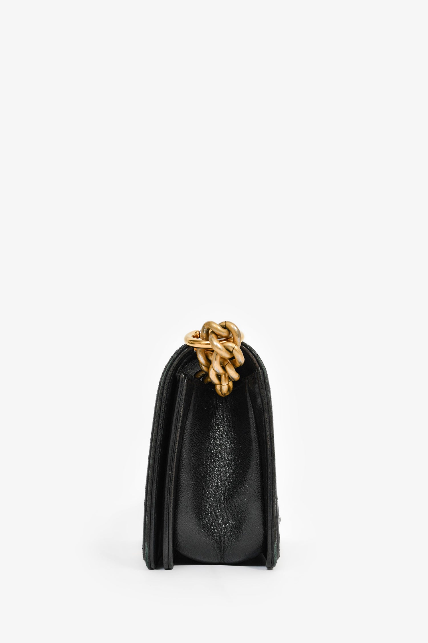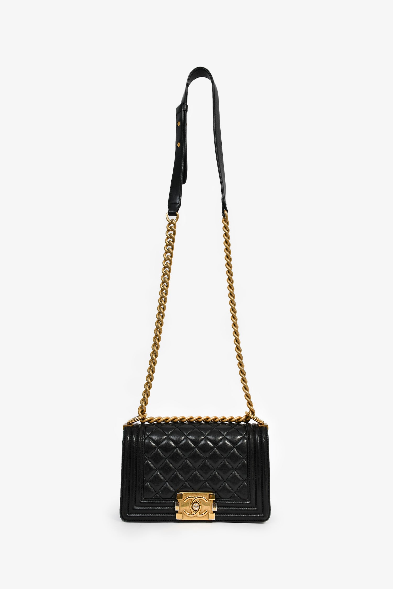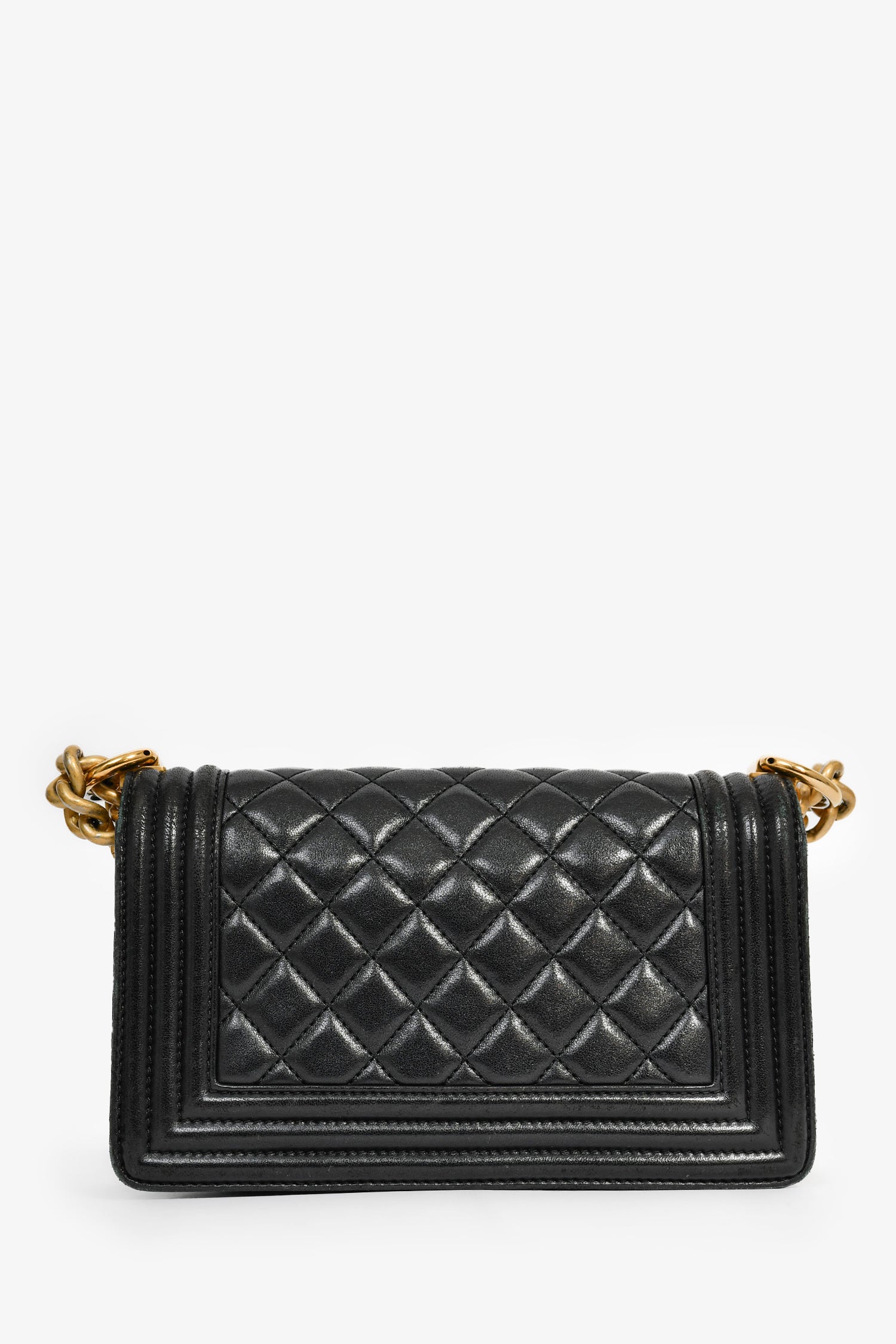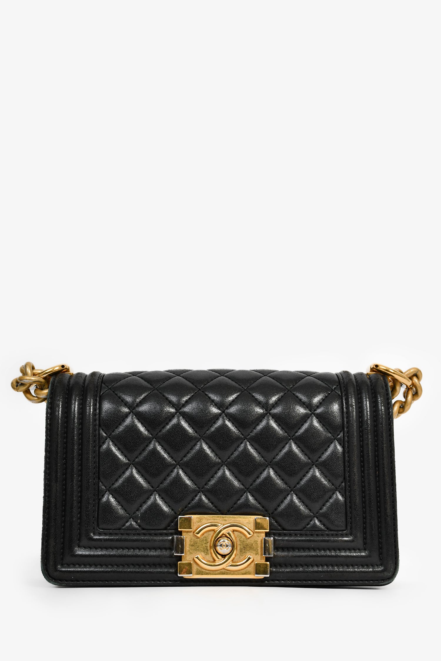 Pre-Loved Chanel™ Black 2017-18 Lambskin Small Boy Bag. Front fold-over flap with pinch-lock closure. Tonal textile interior lining. Single interior wall slip pocket. Slide-around chain strap. Gold-tone hardware.