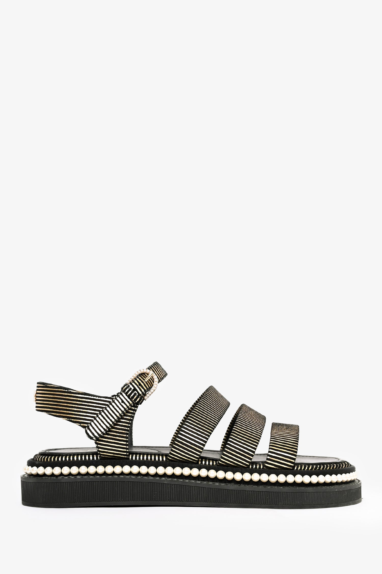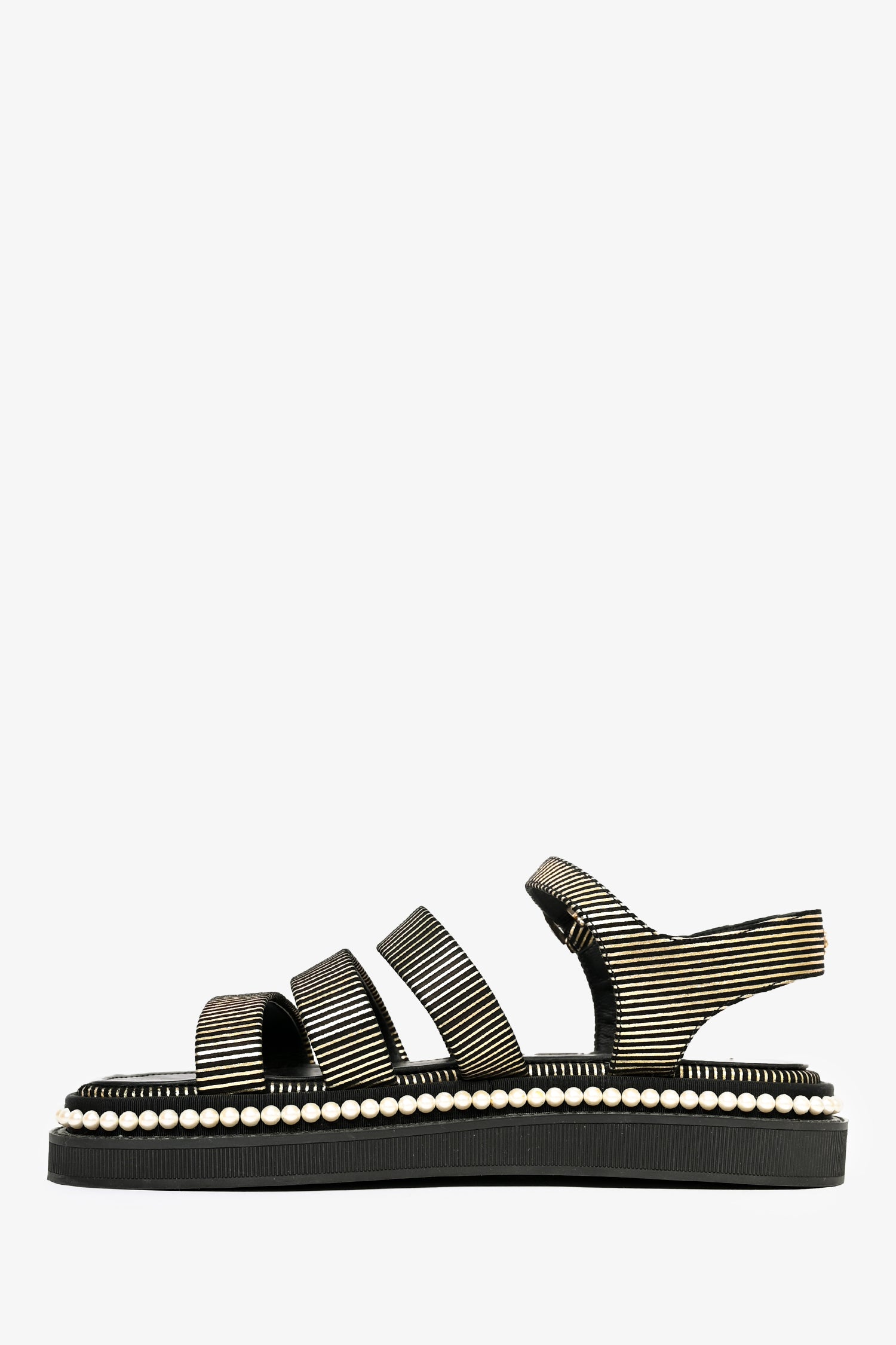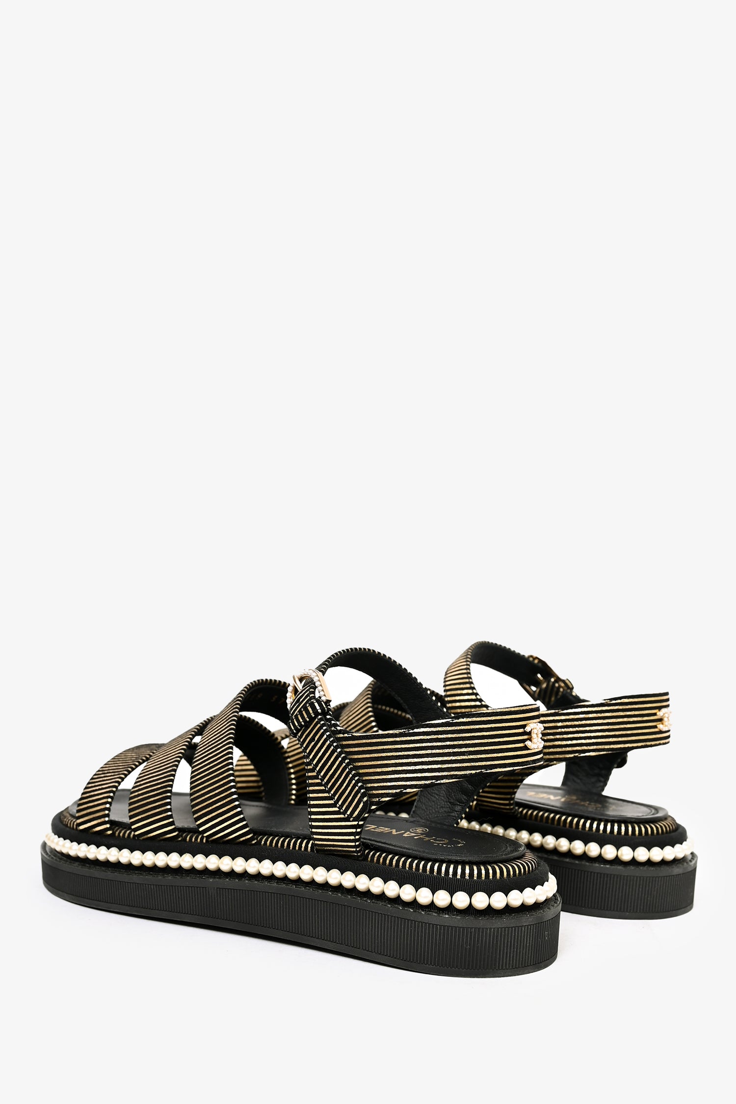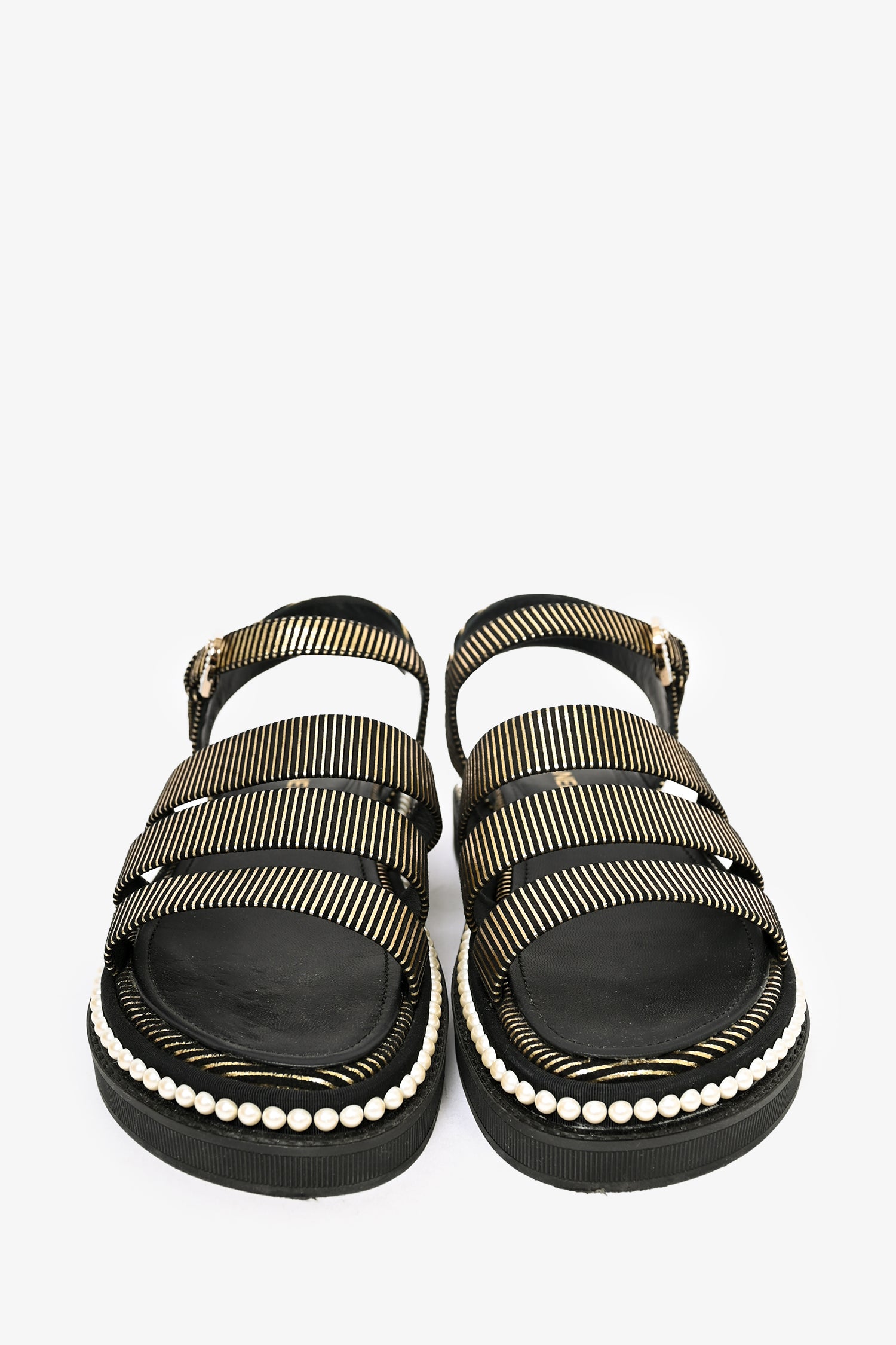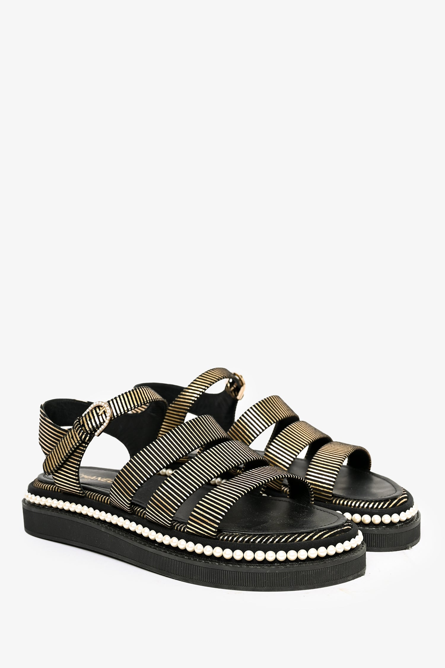Refresh availabilityPre-Loved Chanel™ Black/Gold Striped Faux Pearl Trimmed Sandals. Open toe. Ankle strap with buckle closure.