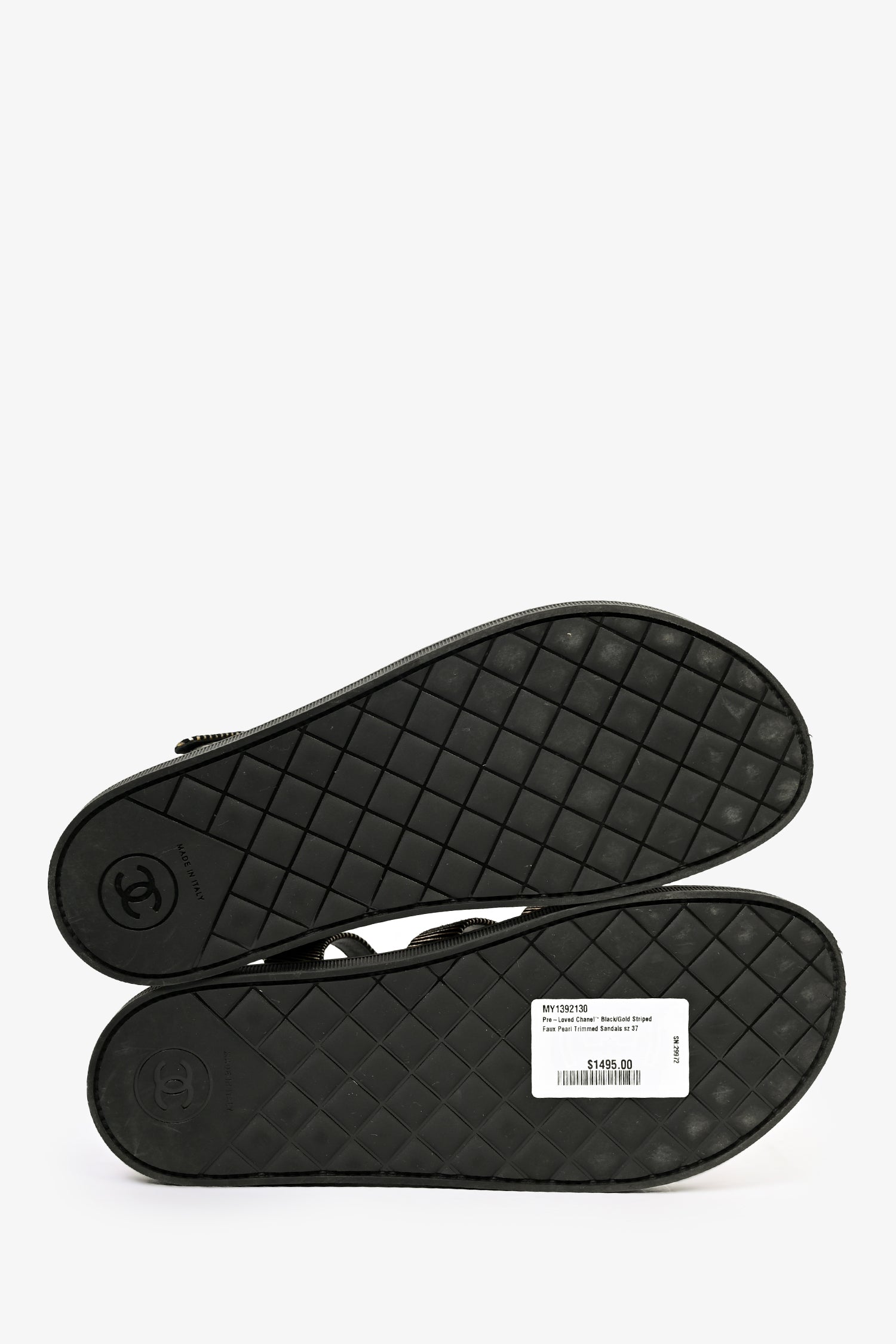 Pre-Loved Chanel™ Black/Gold Striped Faux Pearl Trimmed Sandals Size 37