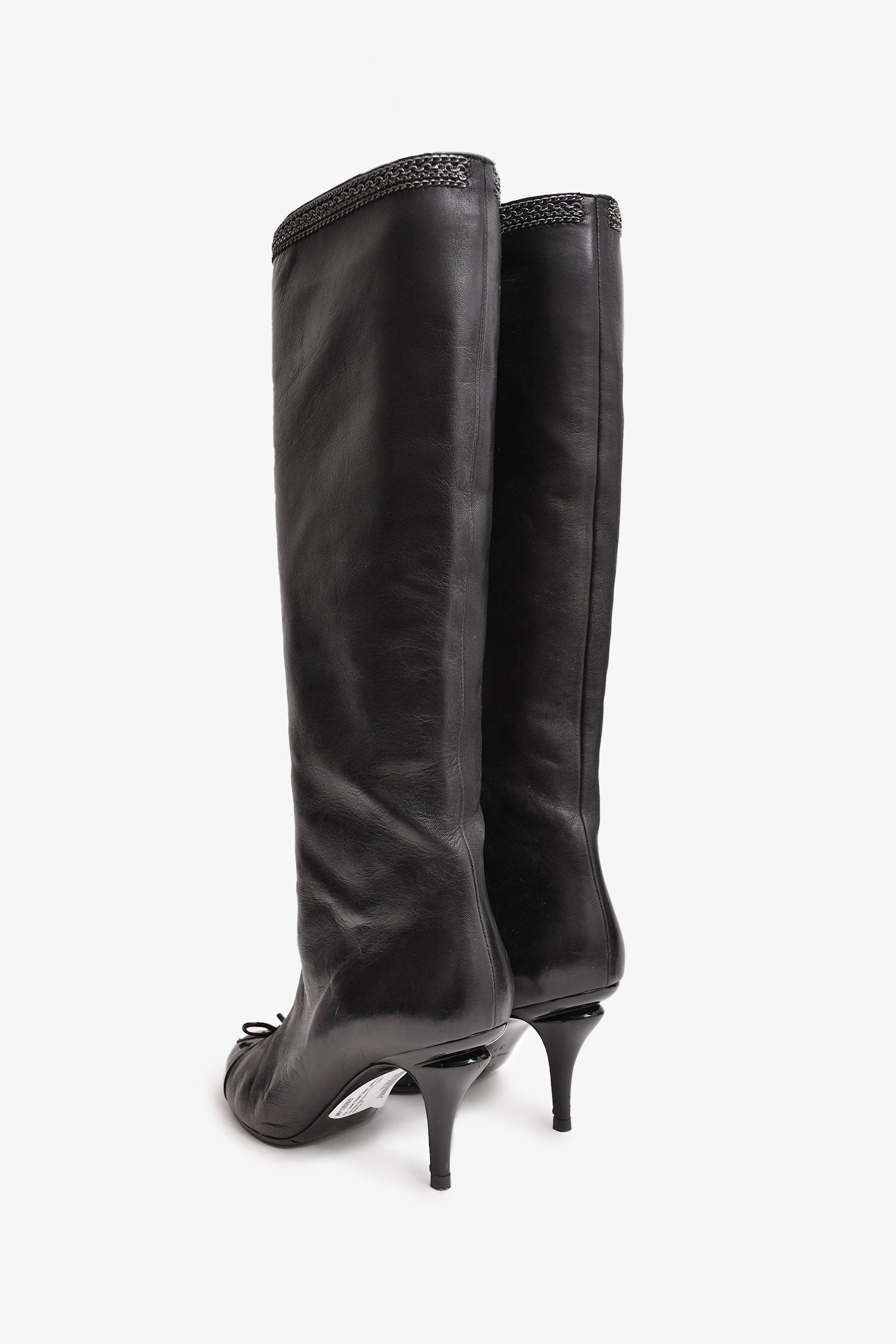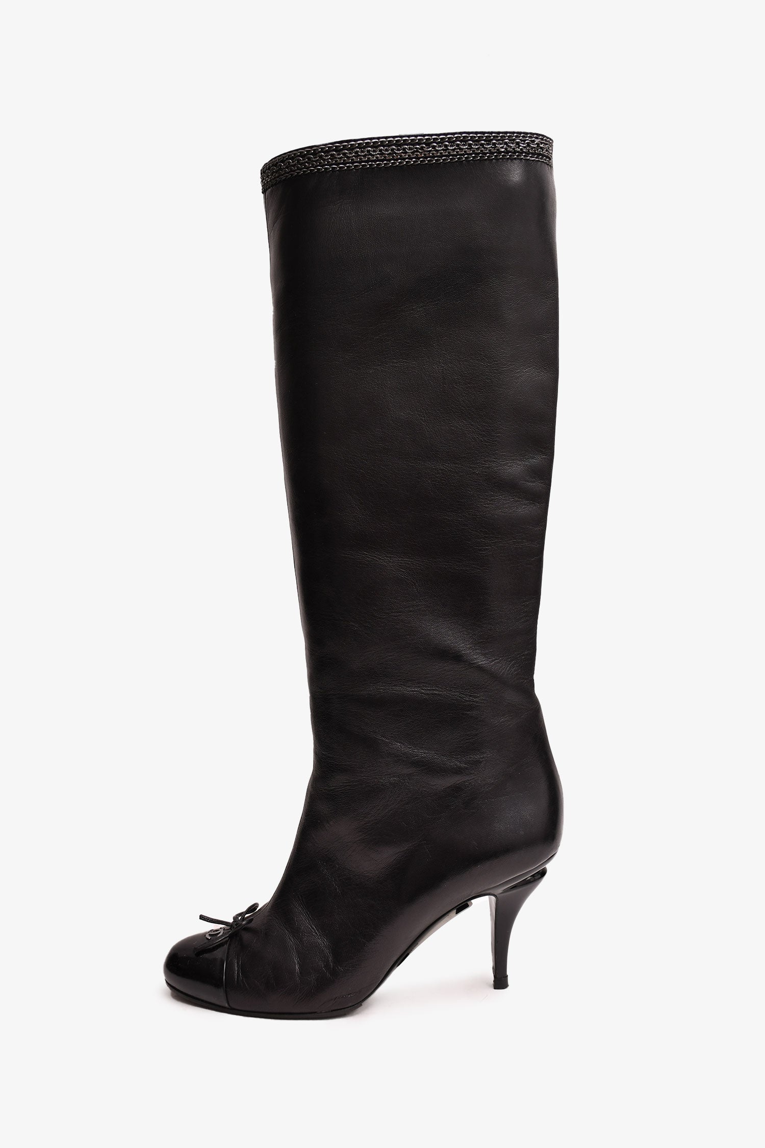 Refresh availabilityPre-Loved Chanel™ Black Leather CC Cap Toe Knee High Boots With Silver Chain Detail. Round toe. Slip on.