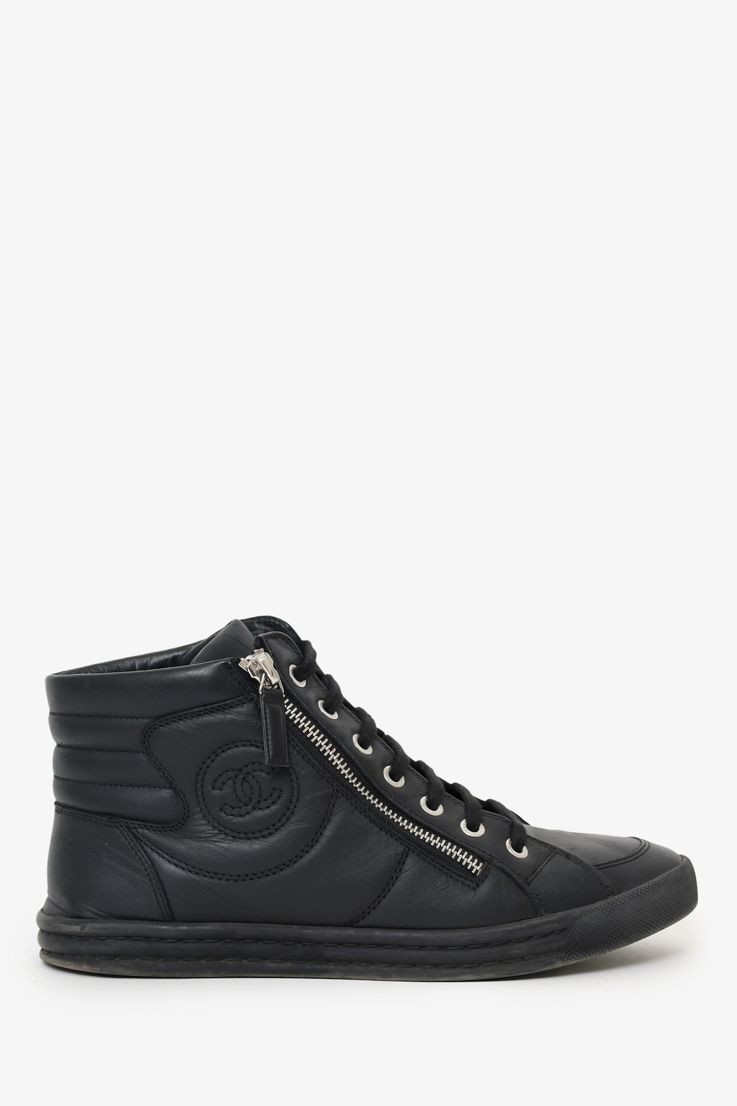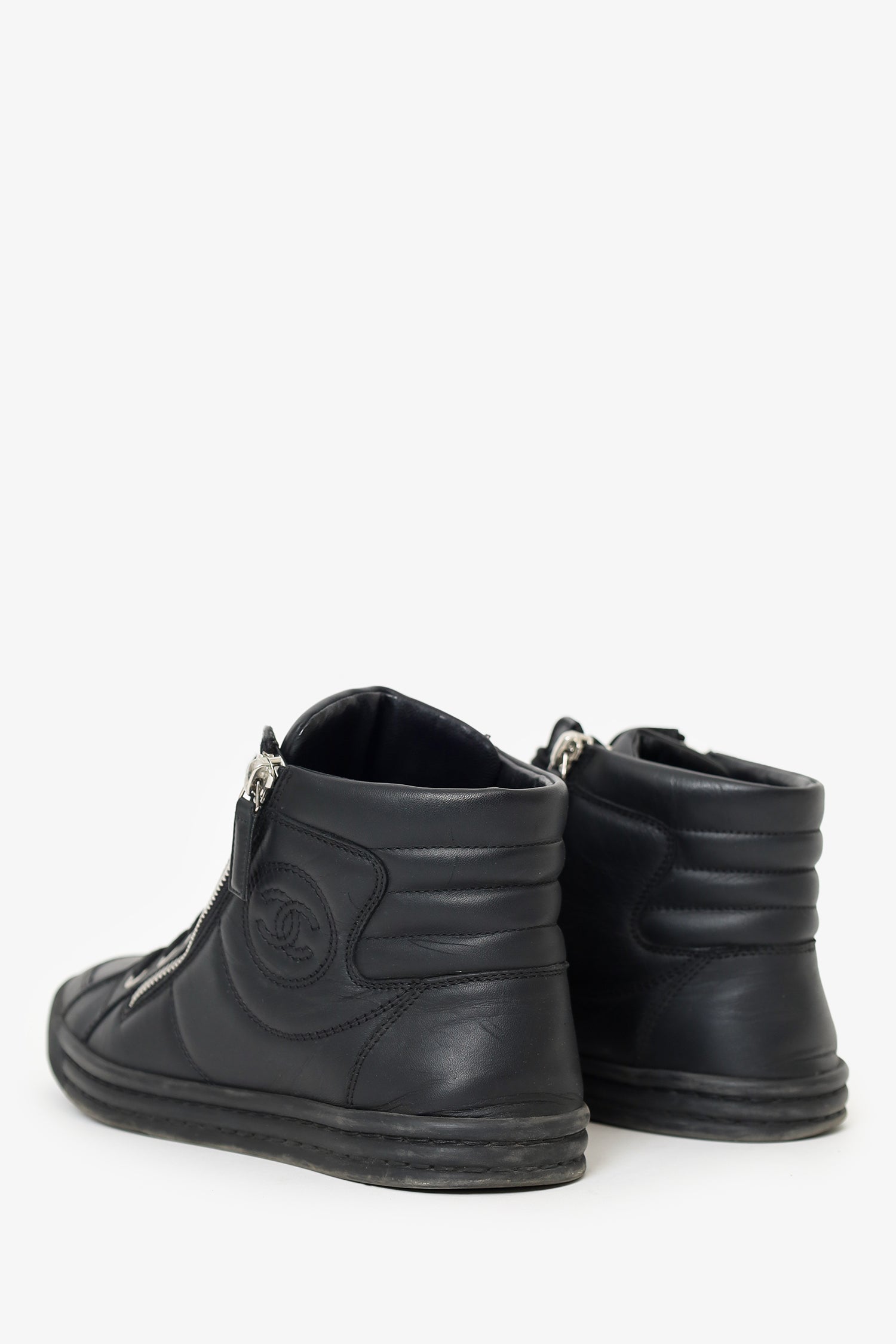 Pre-Loved Chanel™ Black Leather CC Double Zip High Top Sneakers Size 37.5