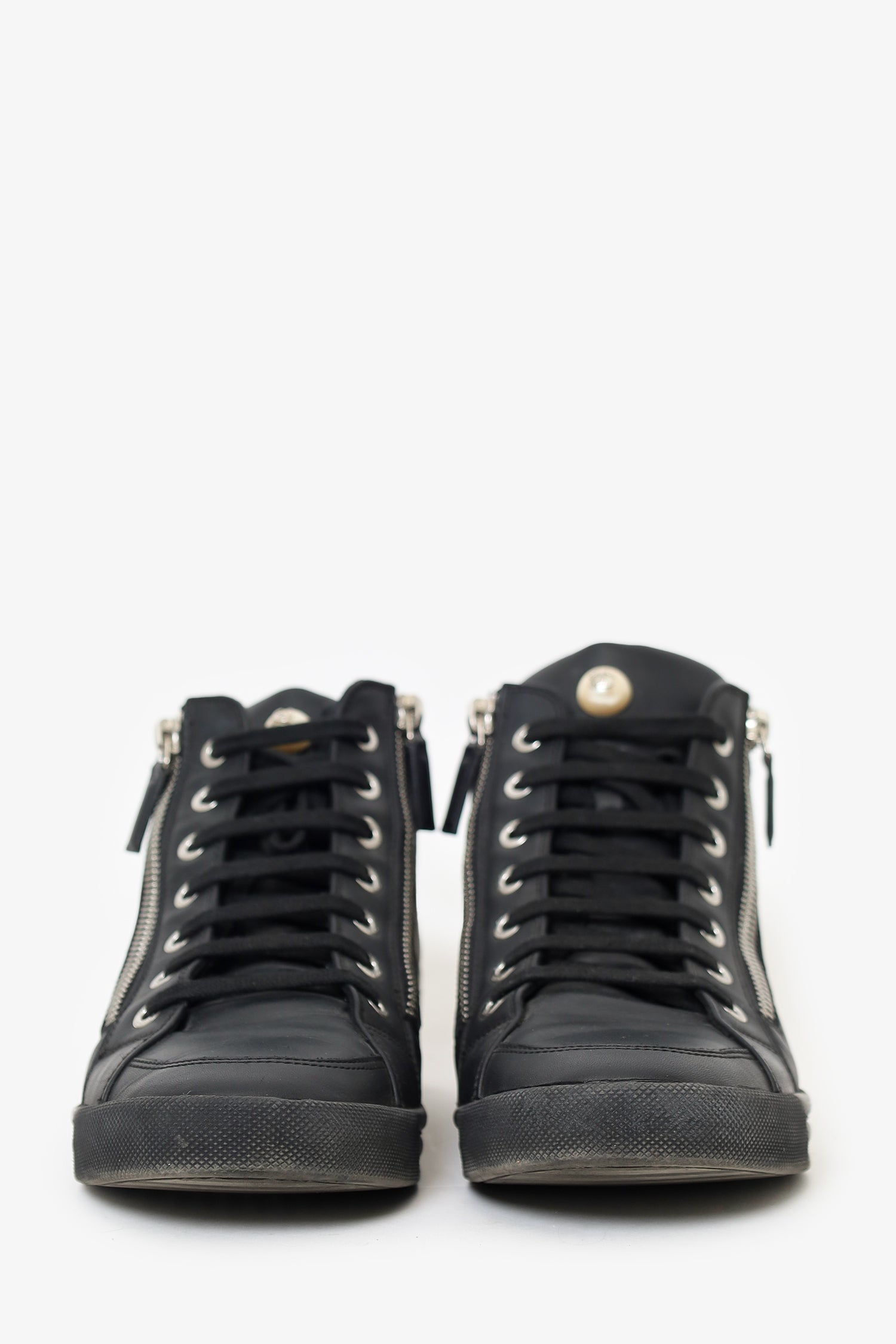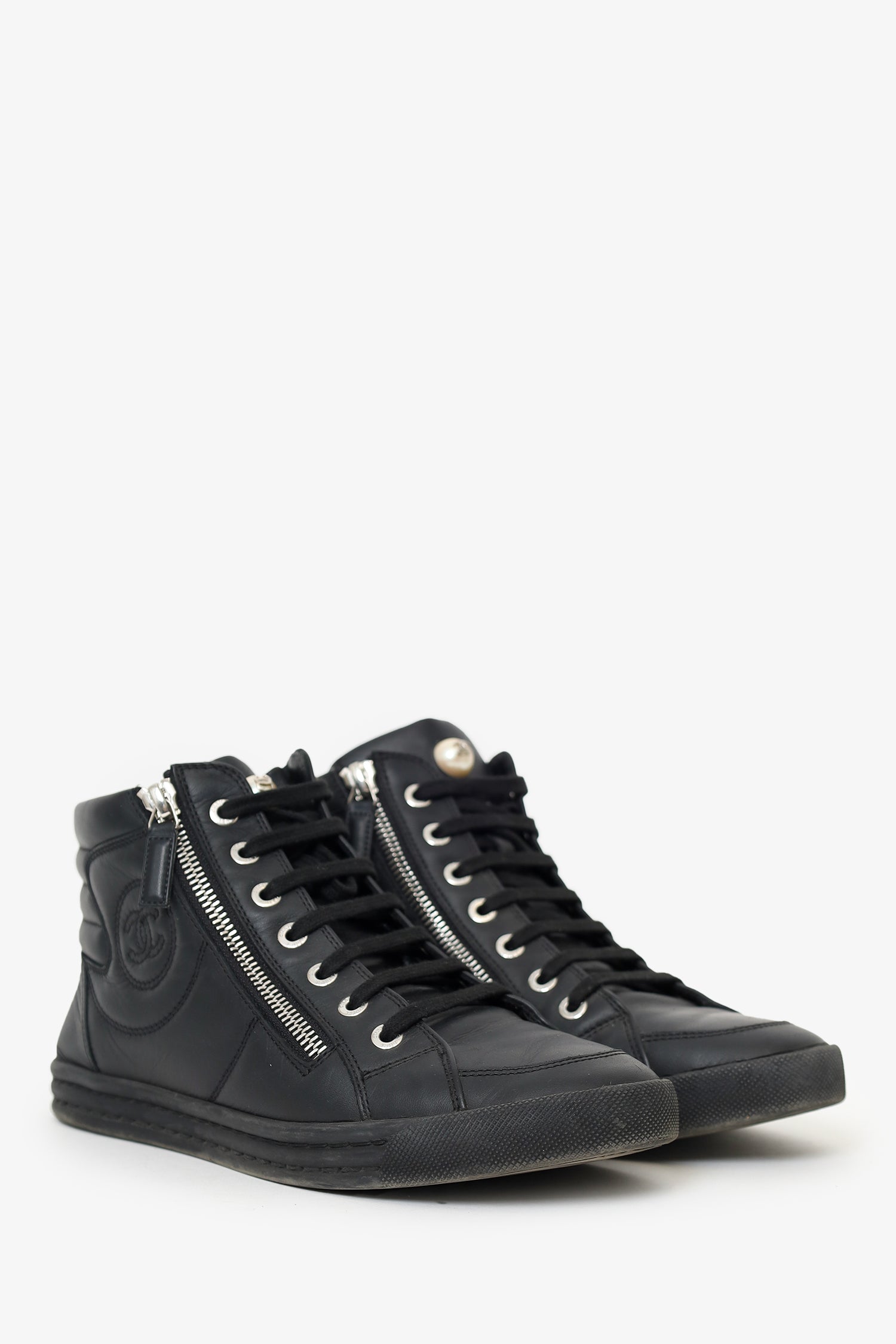 Pre-Loved Chanel™ Black Leather CC Double Zip High Top Sneakers. Pull-on. Round-toe. Side zip closure and front lace-up closure. Pearl-tone embellishment on tongue. Silver-tone hardware. Tonal stitching.