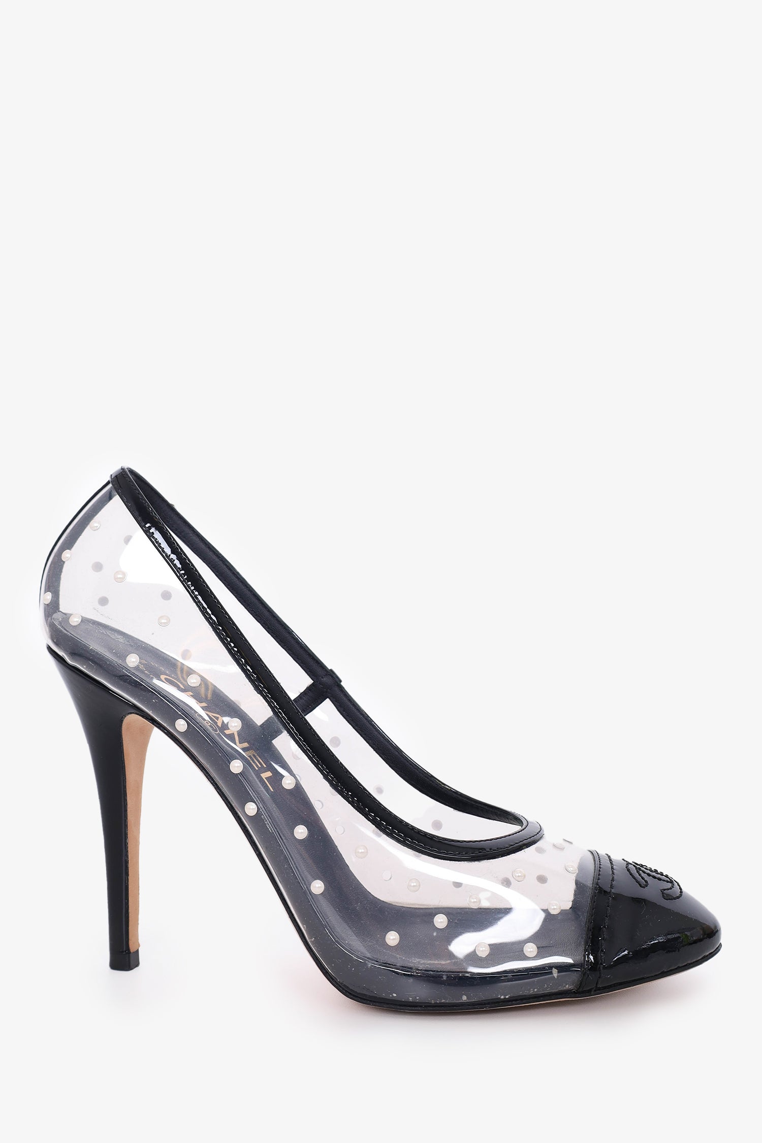 Refresh availabilityPre-Loved Chanel™ Black Patent/PVC Pearl Embellished Cap Toe Pumps. Slip-on. Closed round toe. PVC sides with faux pearl detail. Tonal stitching.