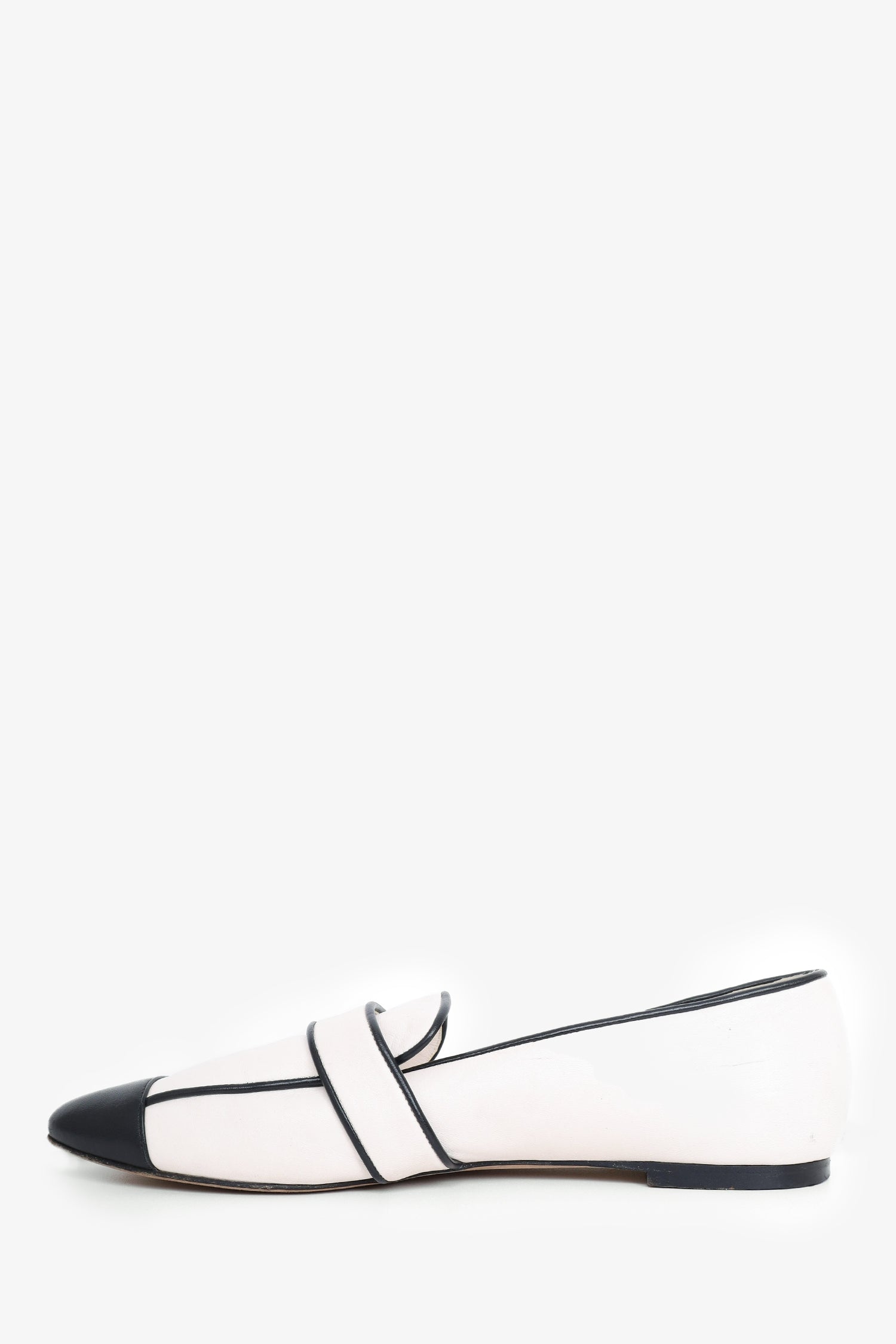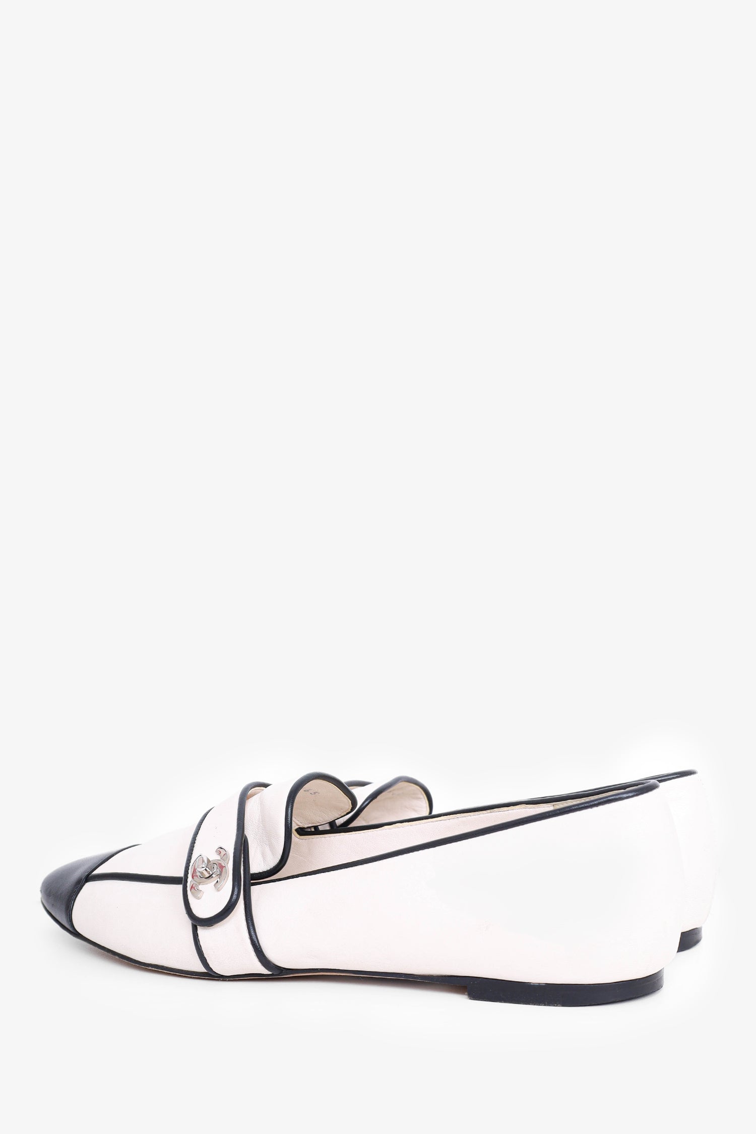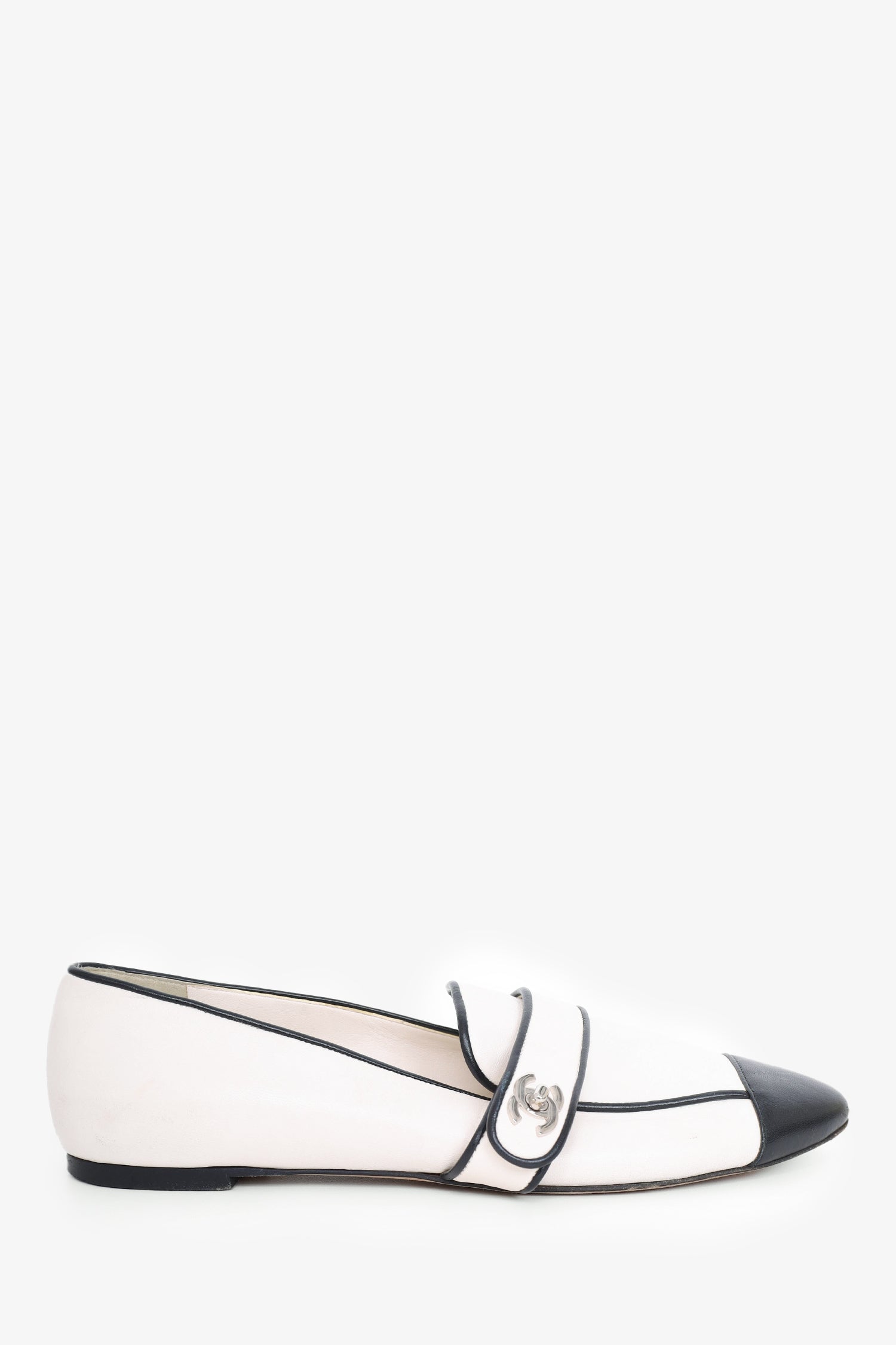 Refresh availabilityPre-Loved Chanel™ Black/White Leather CC Lock Flats. Contrasting trims and toe. Slip-on. Silver-tone hardware. Tonal stitching.