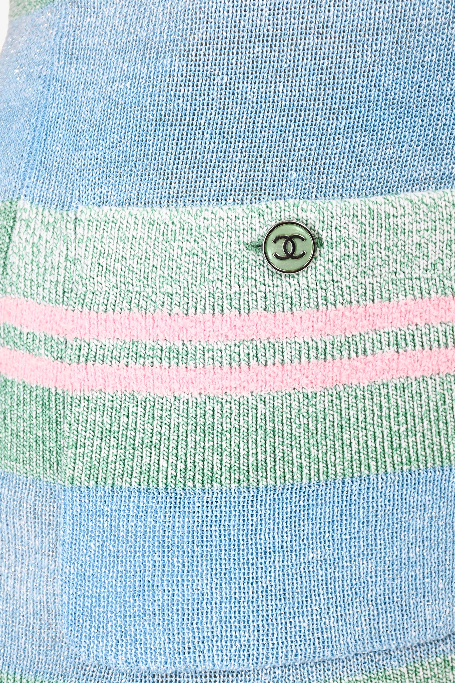 Pre-Loved Chanel™ Blue/Pink Striped Knit CC Button Polo Dress. Front button-up closure on the neckline. Front pockets. Unlined.