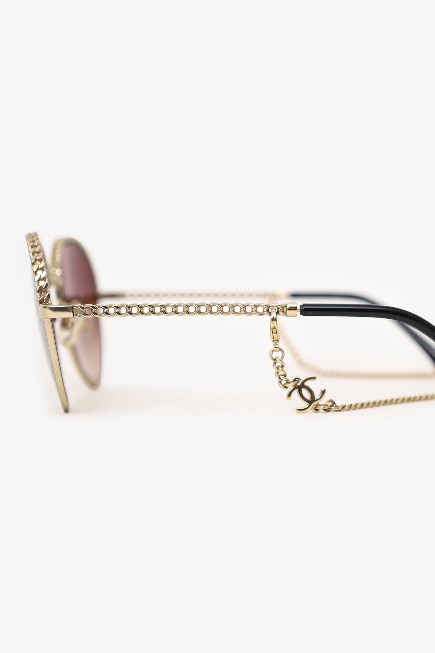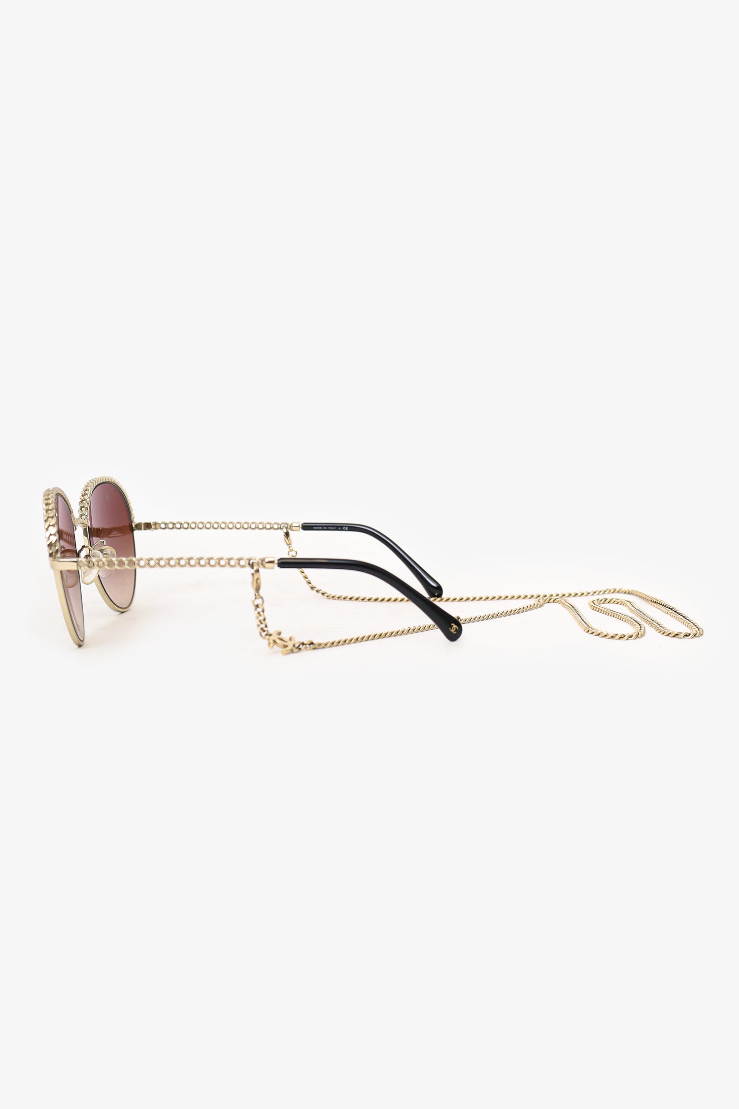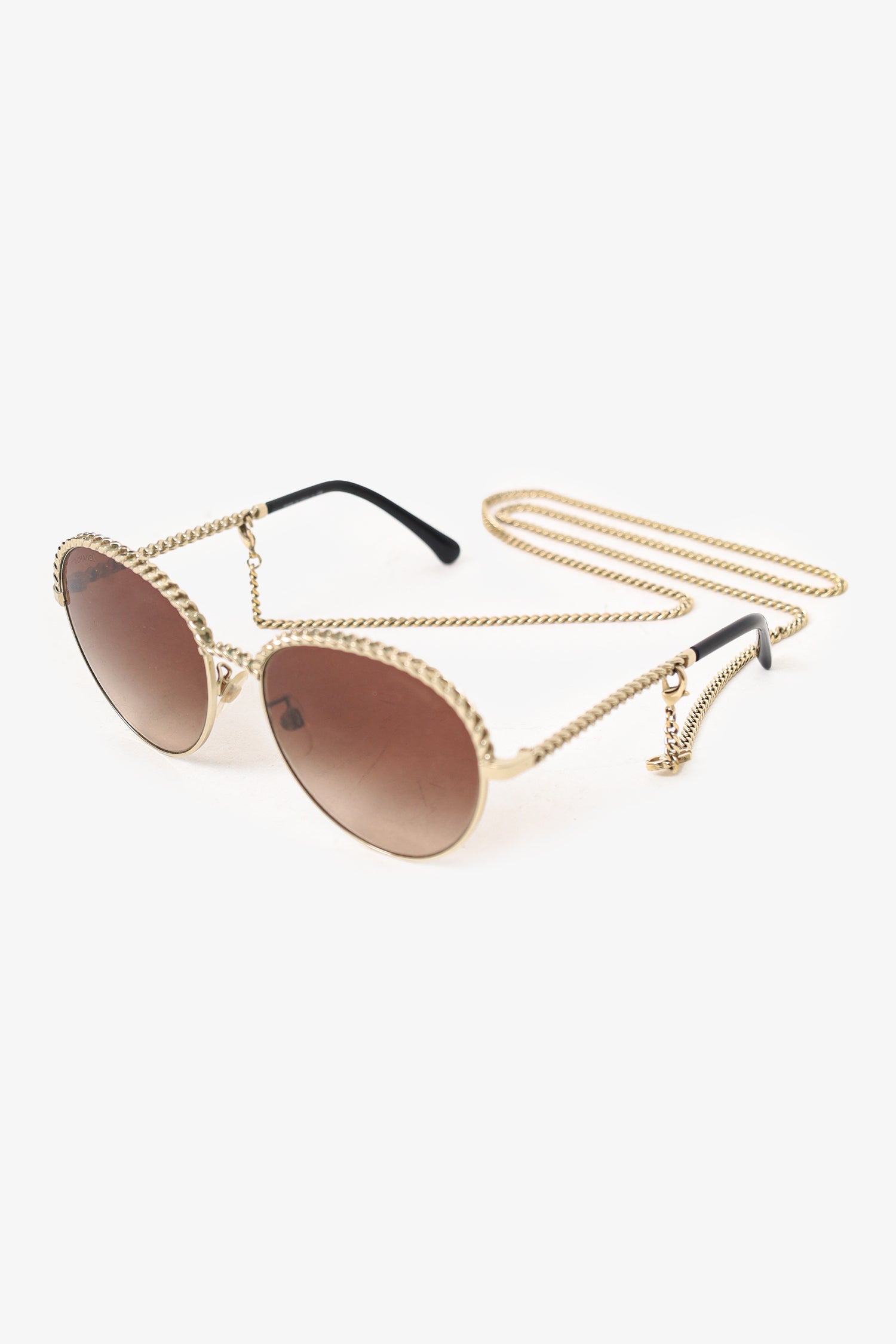 Refresh availabilityPre-Loved Chanel™ Chain Round Sunglasses with Chain. Adjustable nose pads. Light gold-tone hardware. Comes with a detachable chain with lobster clasp closure.