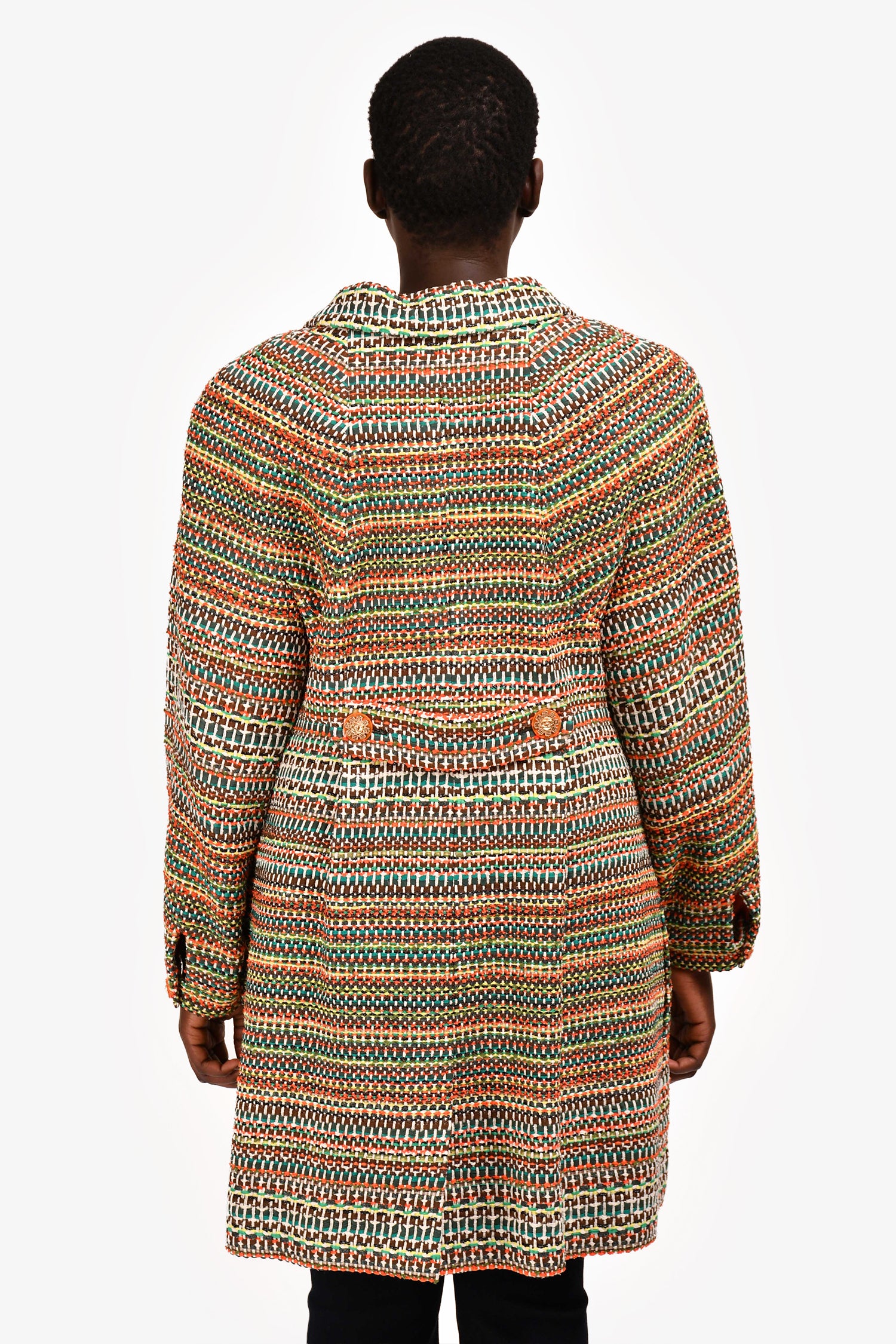 Refresh availabilityPre-Loved Chanel™ 2016 Orange/Green Tweed Mid Length Coat with CC Buttons. Classic collar. Front button closure with gold-tone CC logo buttons. Long sleeves. Slit pockets at sides. Fully lined. Tonal stitching.