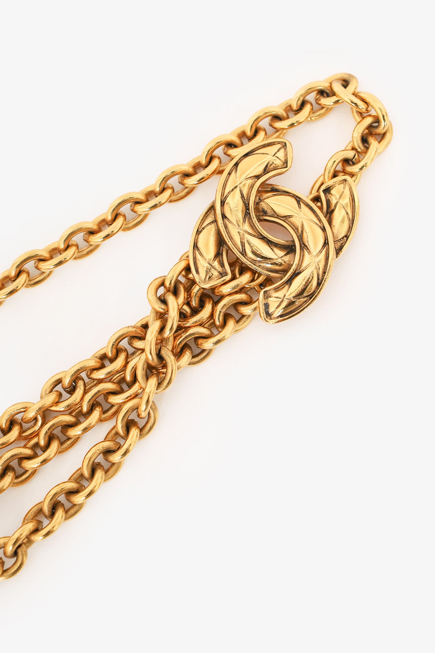 Refresh availabilityPre-Loved Chanel™ Gold Tone CC Chain Belt. 3 chains on side. Single wrap around chain with hook closure.