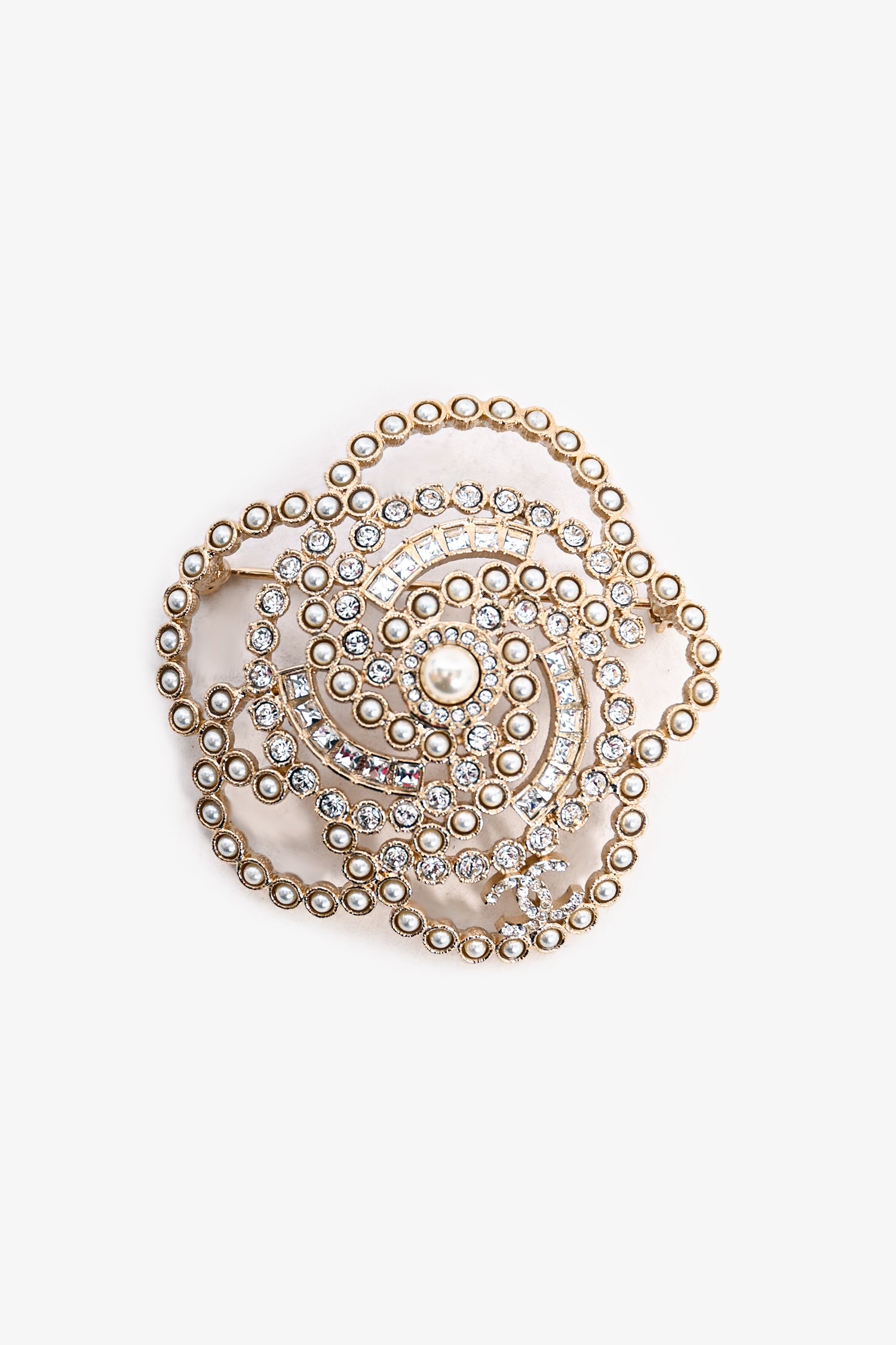 Refresh availabilityPre-Loved Chanel™ Gold Tone Pearl Crystal Lace Camellia Brooch. Comes with box and dustbag.