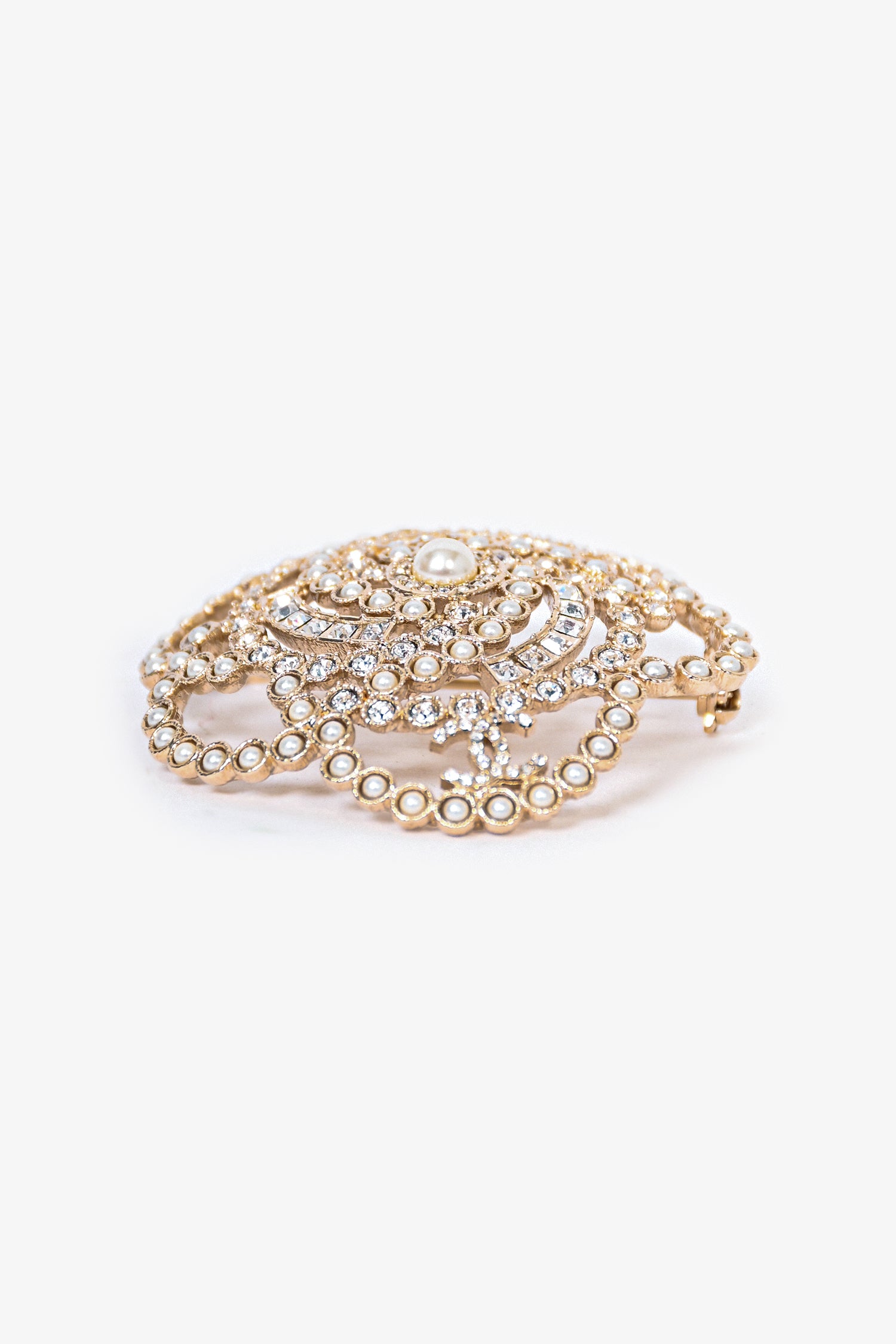 Pre-Loved Chanel™ Gold Tone Pearl Crystal Lace Camellia Brooch