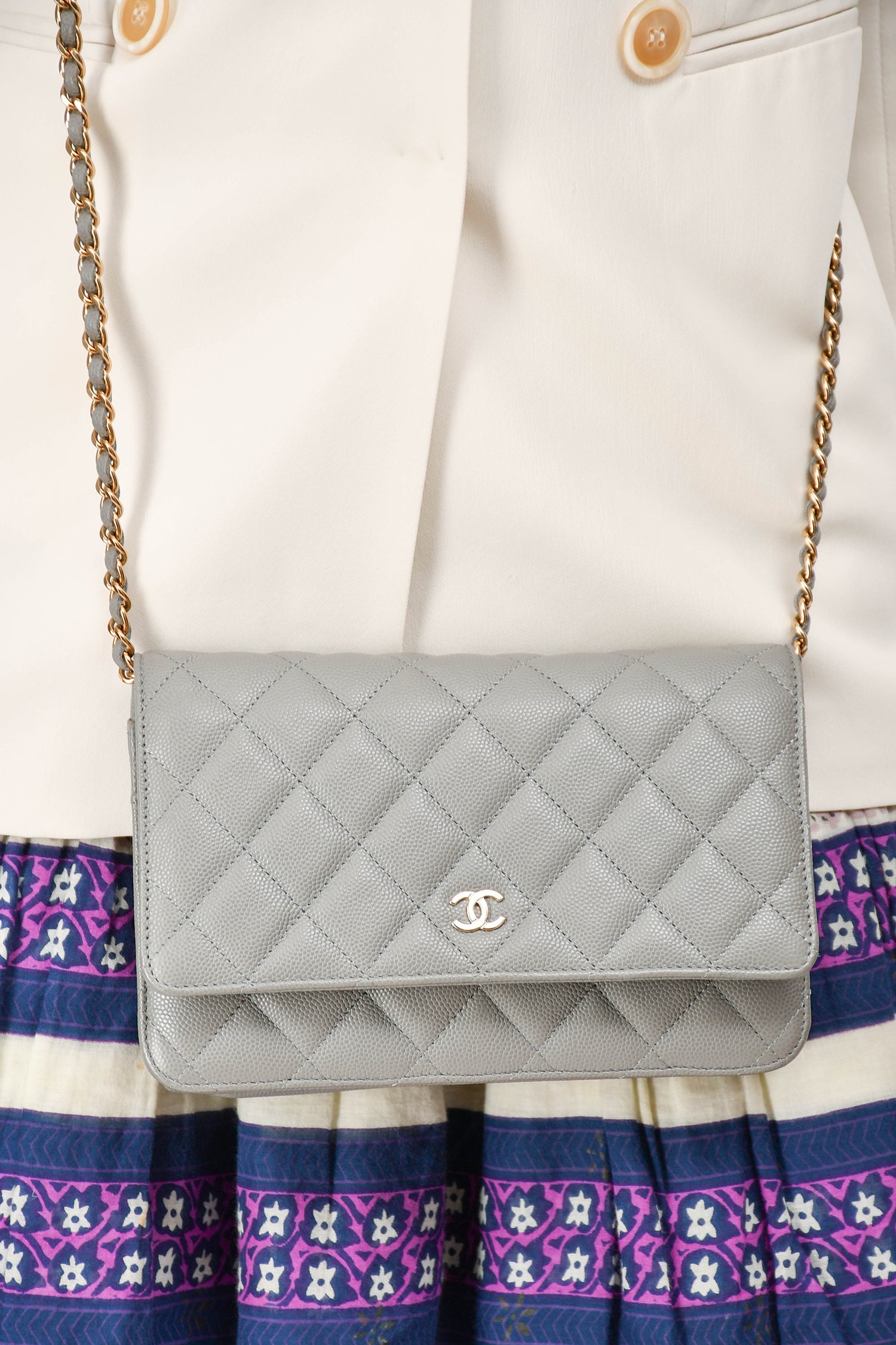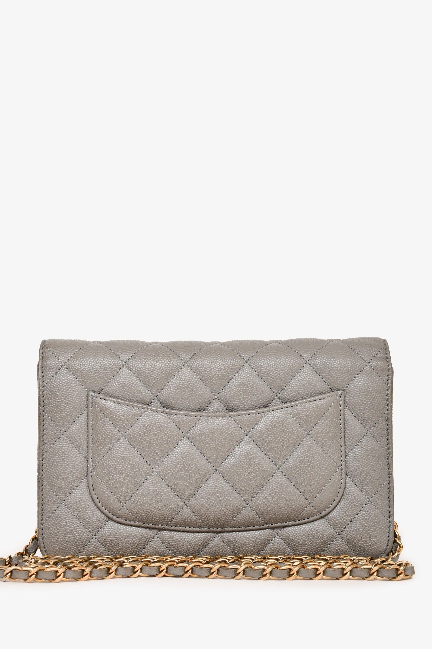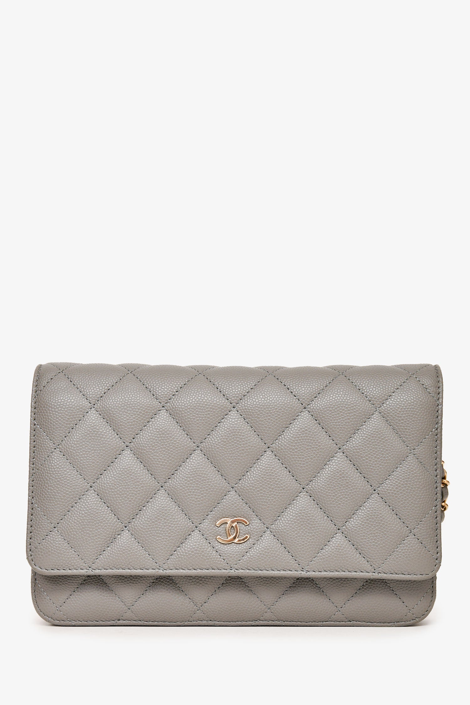 Pre-Loved Chanel™ Grey Caviar Leather Wallet On Chain. Front fold-over flap with magnetic button closure. Single exterior slip pocket. Eight interior wall card slip pockets. Two interior zip pockets. Tonal textile lining. Gold-toned hardware. Tonal stitching. Comes with dust bag and box.