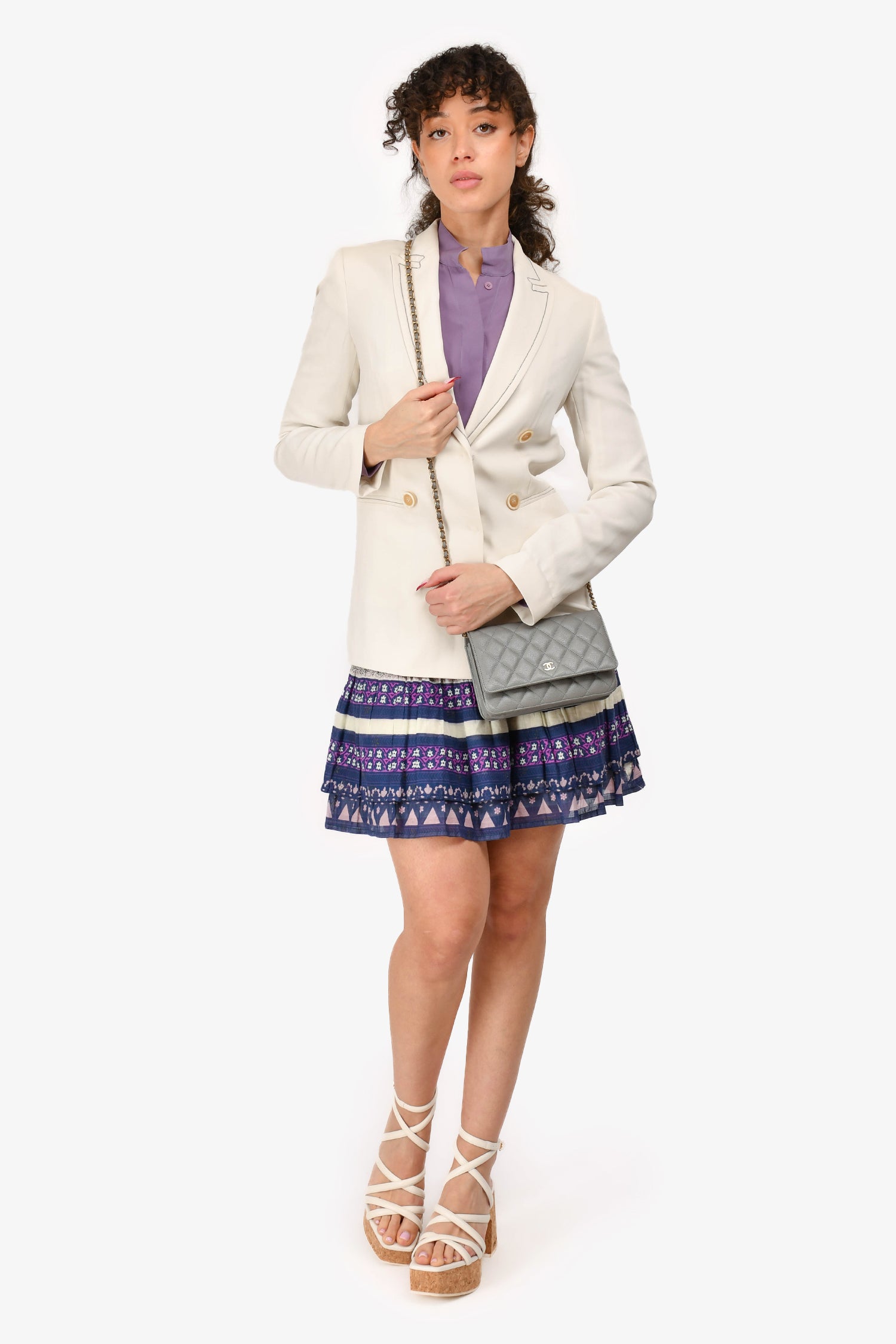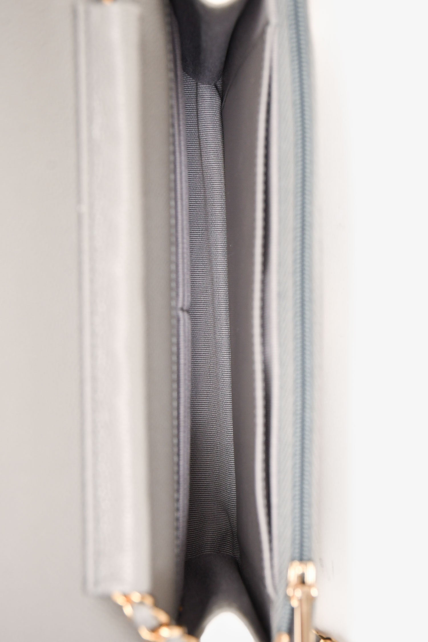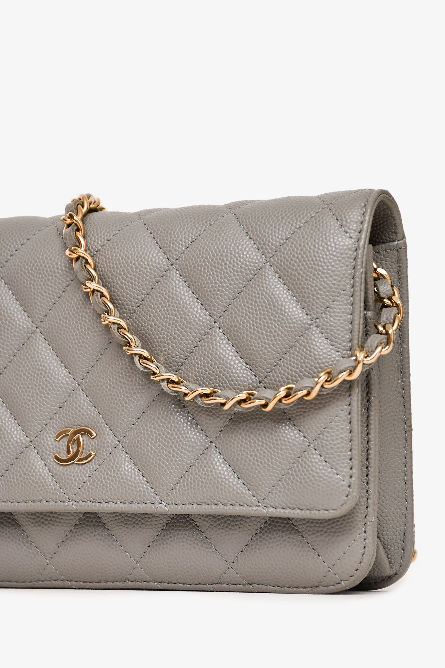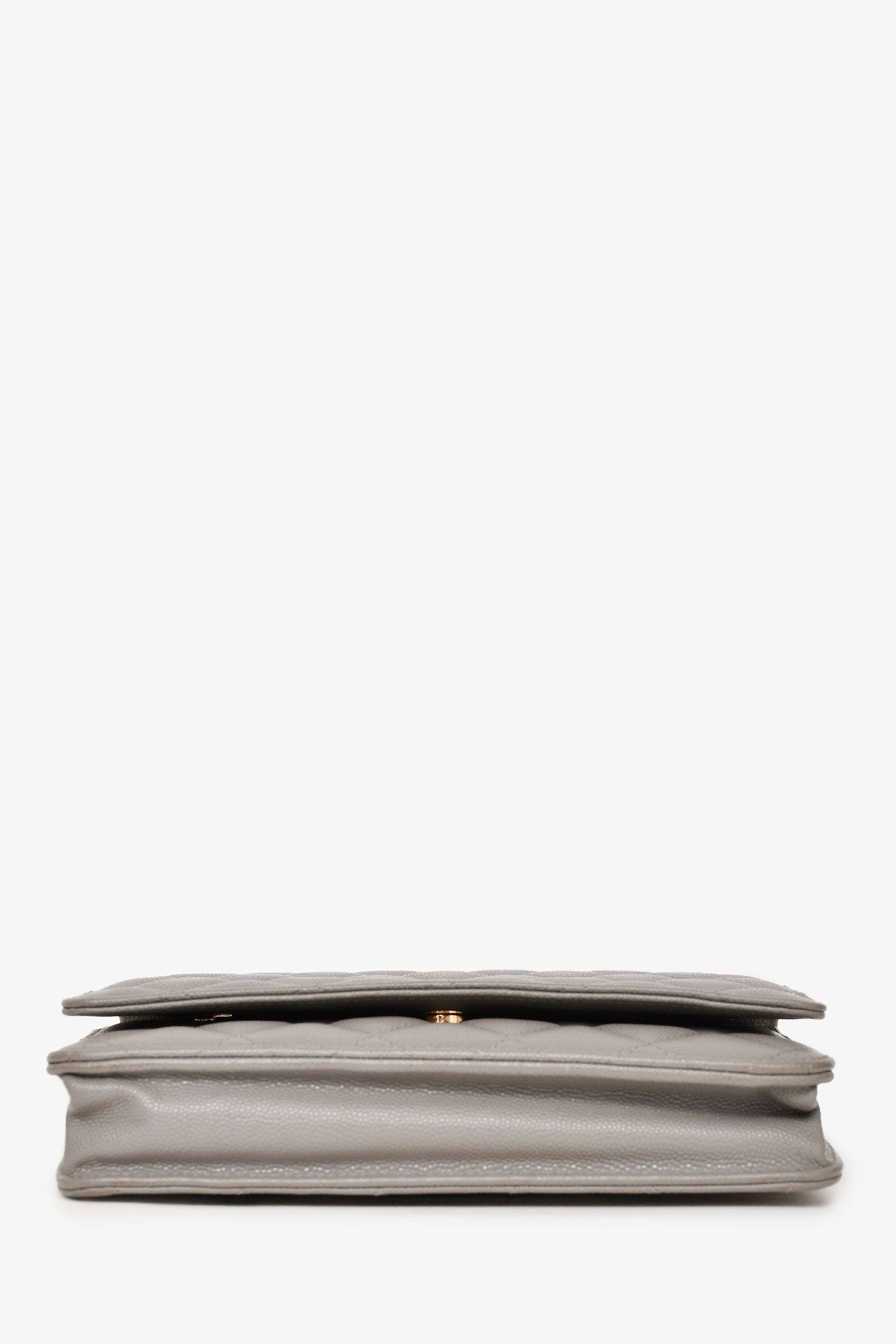 Pre-Loved Chanel™ Grey Caviar Leather Wallet On Chain. Front fold-over flap with magnetic button closure. Single exterior slip pocket. Eight interior wall card slip pockets. Two interior zip pockets. Tonal textile lining. Gold-toned hardware. Tonal stitching. Comes with dust bag and box.