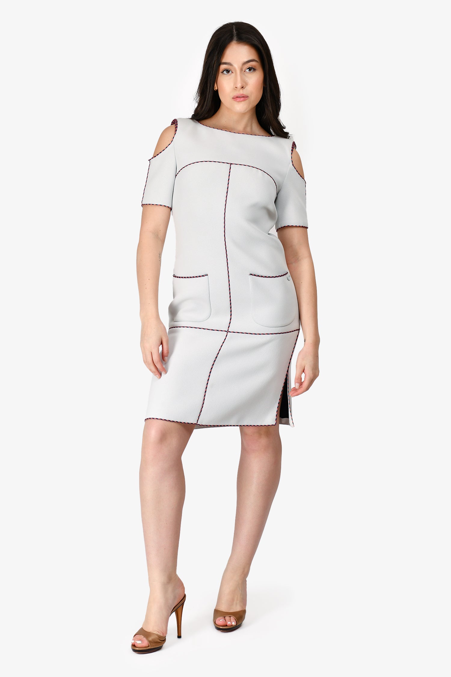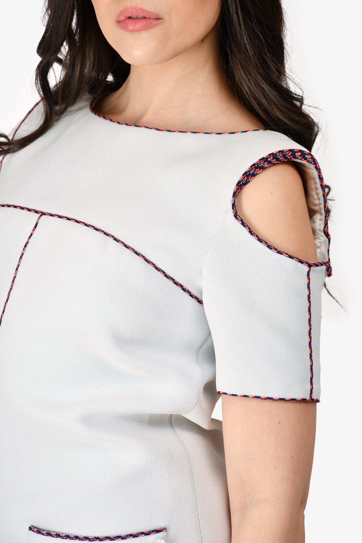 Pre-loved Chanel™ Light Grey/Multi Coloured Braided Trim Cold Shoulder Shift Dress. Rear zip closure. 2 front slip pockets. Side slits at hemline. Lined. Tonal stitching.