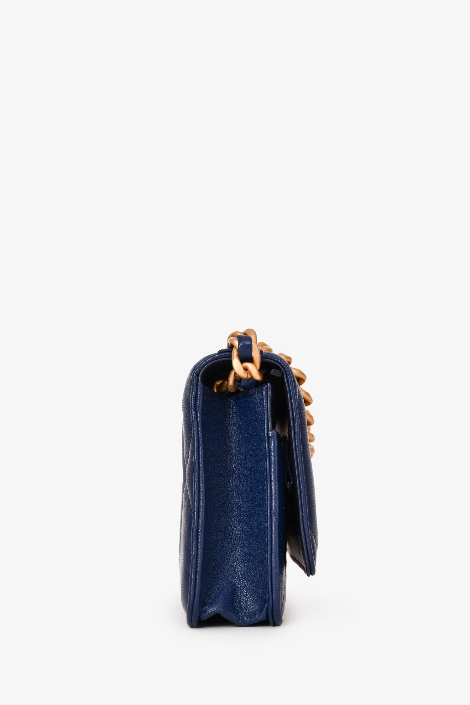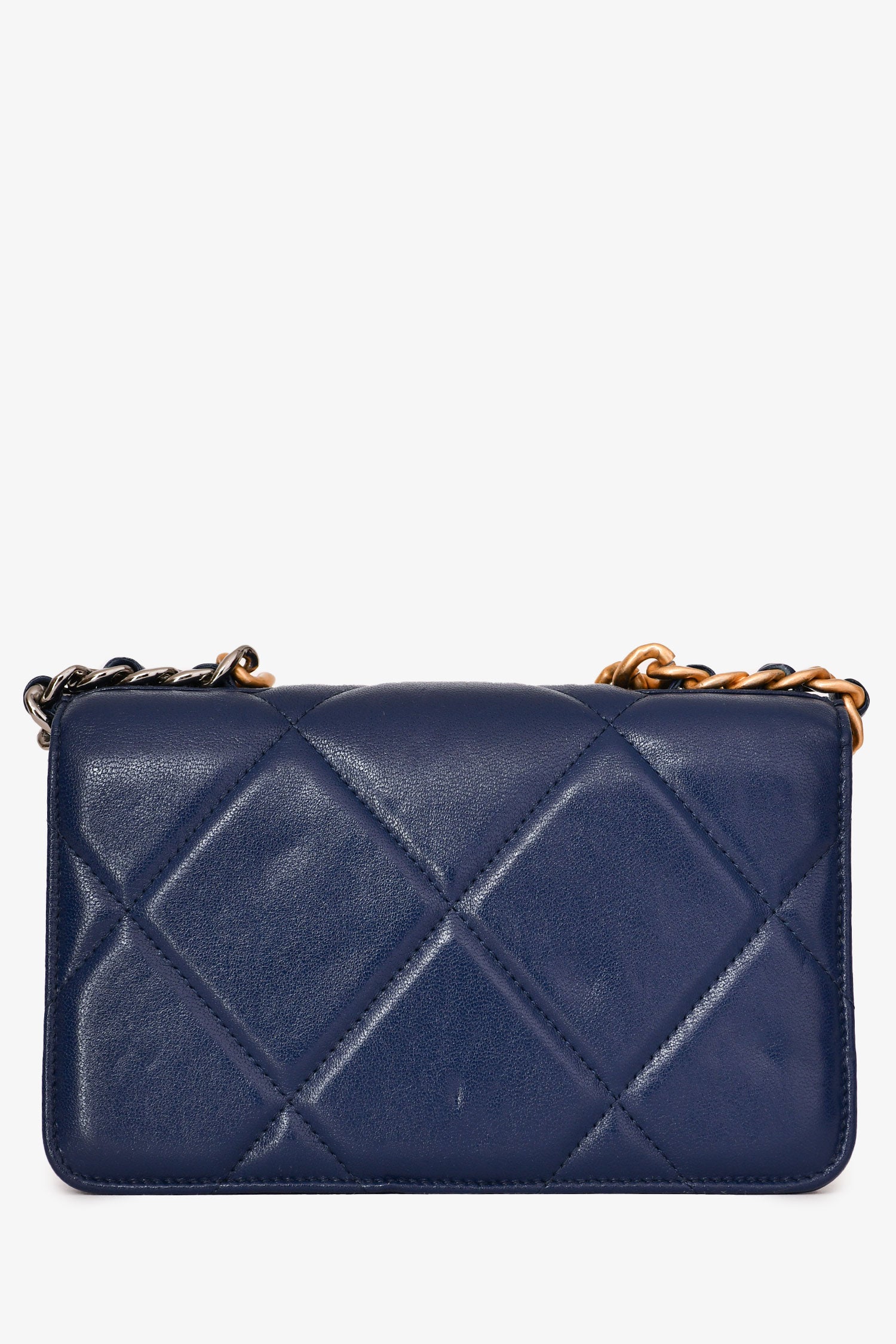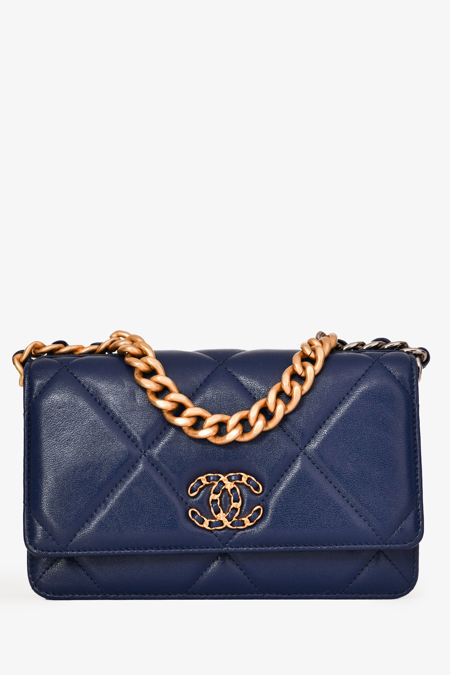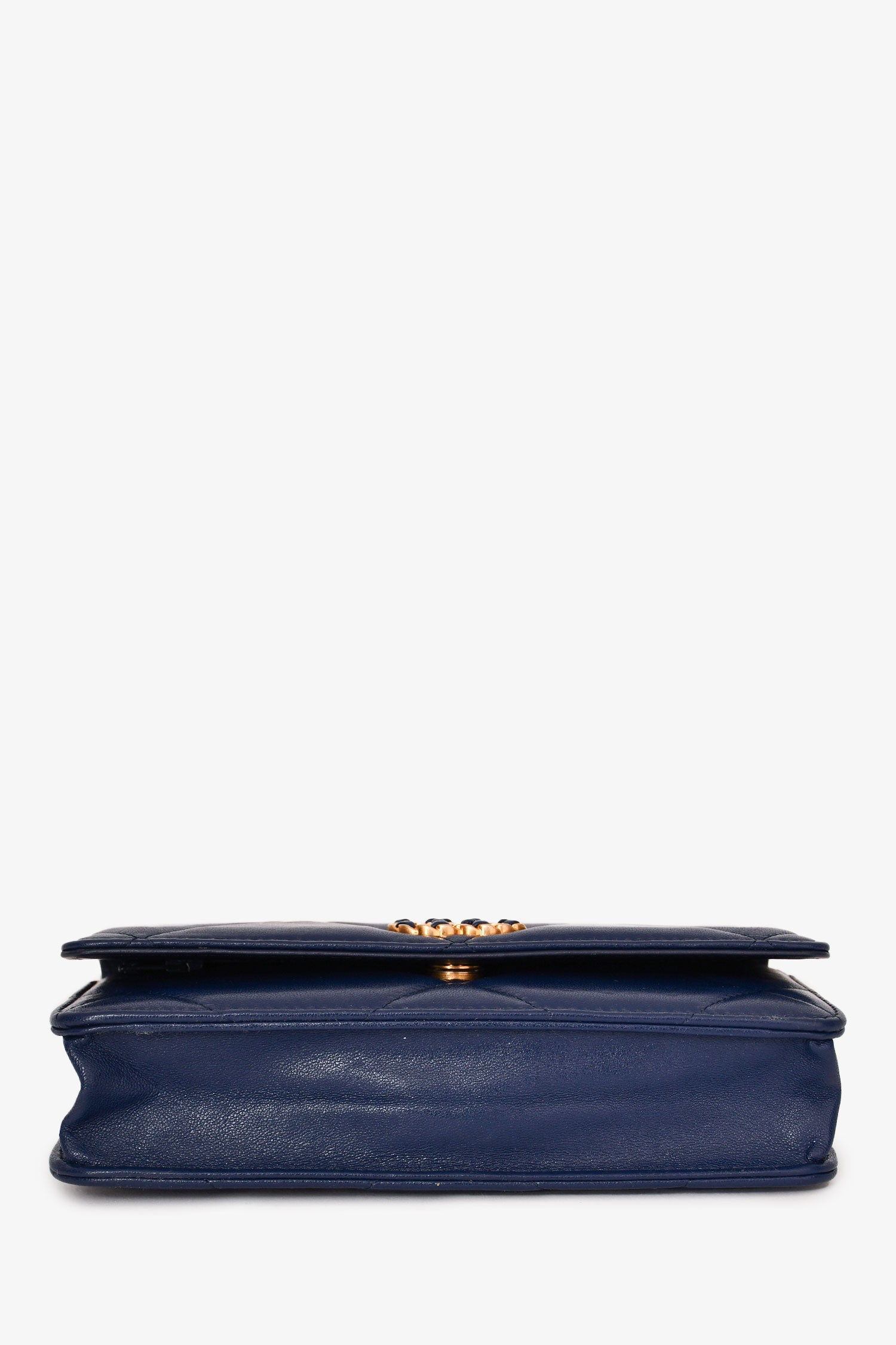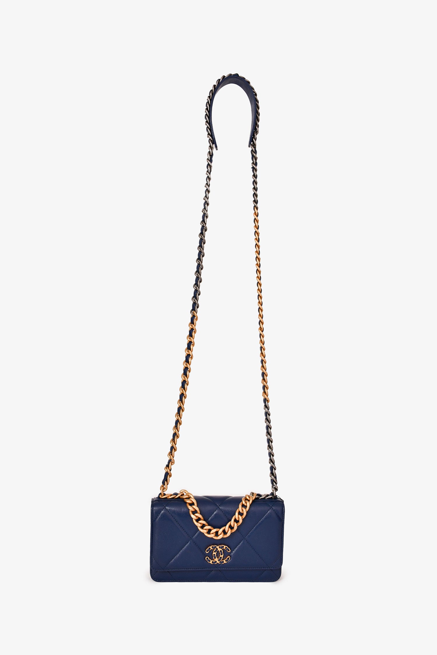 Refresh availabilityPre-Loved Chanel™ Navy Lambskin 'Chanel 19' Wallet on Chain. Gold, silver, and antiqued silver-tone hardware. Fold-over flap with a snap closure. Chain-link and leather shoulder strap. 3 interior compartments. Zipper on the underside of the flap. Zipped compartment. 6 card slots. Tonal stitching.