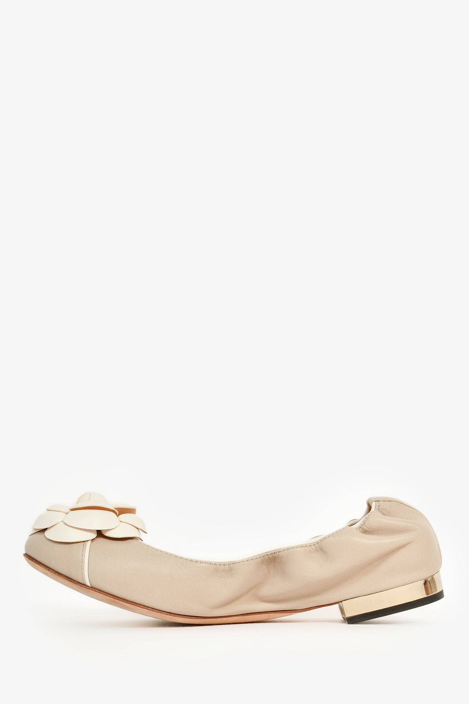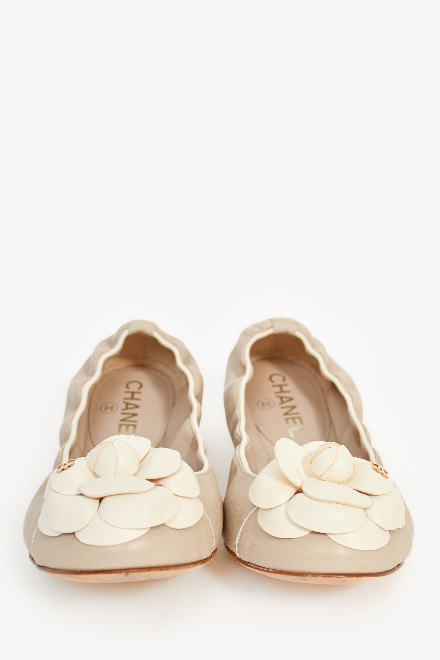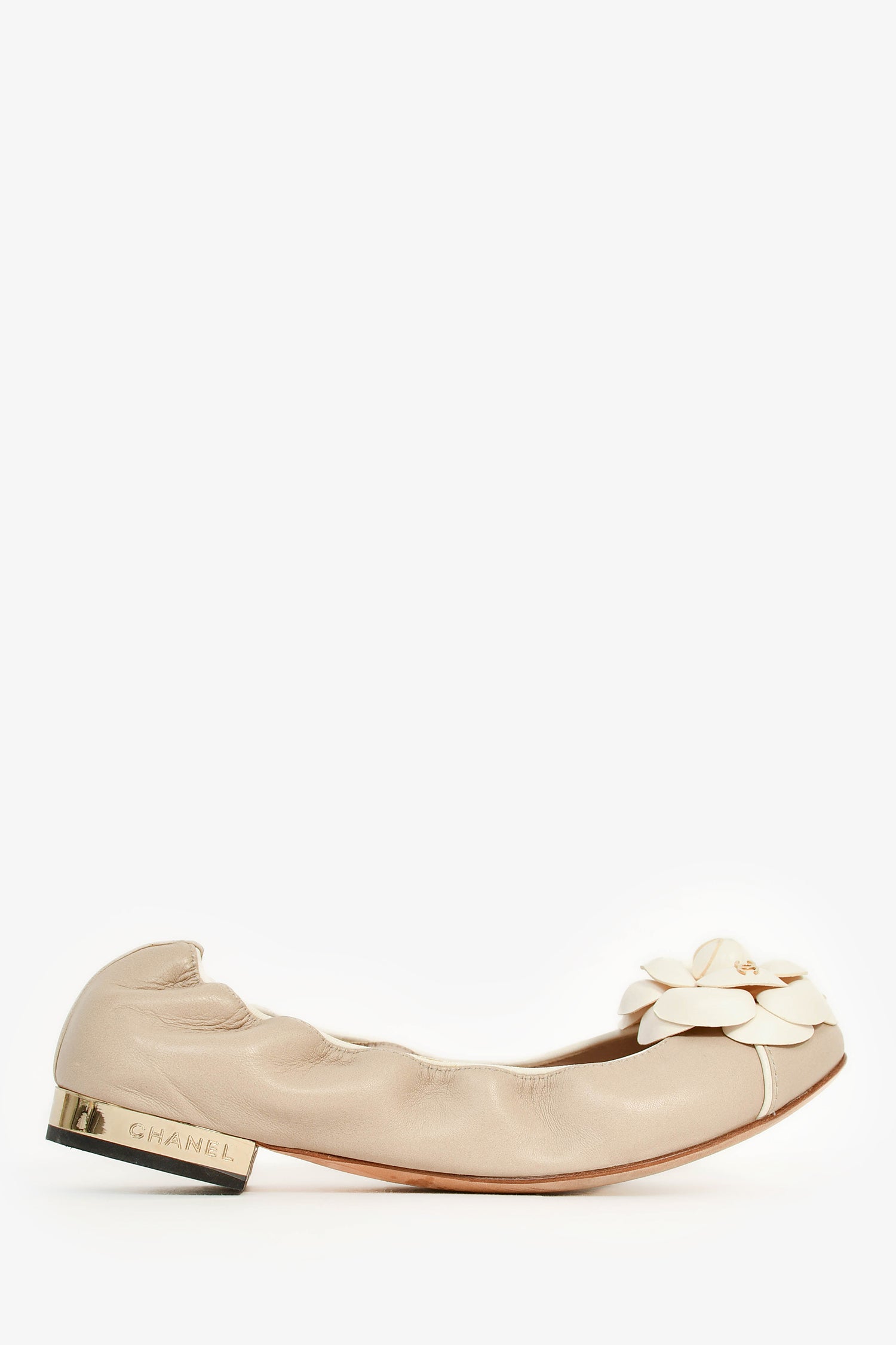 Pre-Loved Chanel™ Nude/White Leather Camellia Ballet Flats Size 37.5