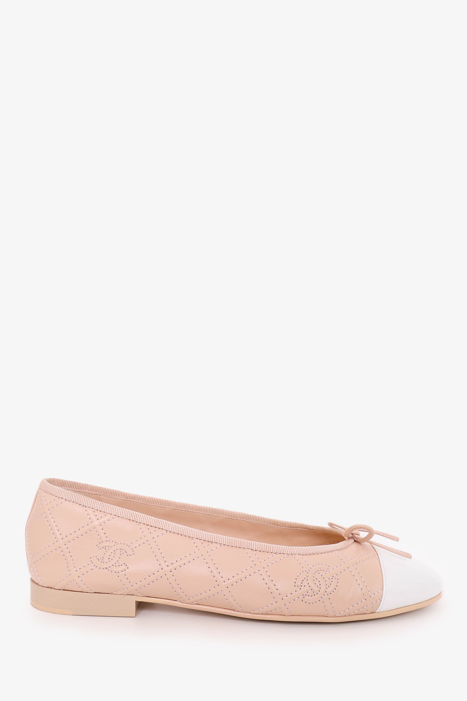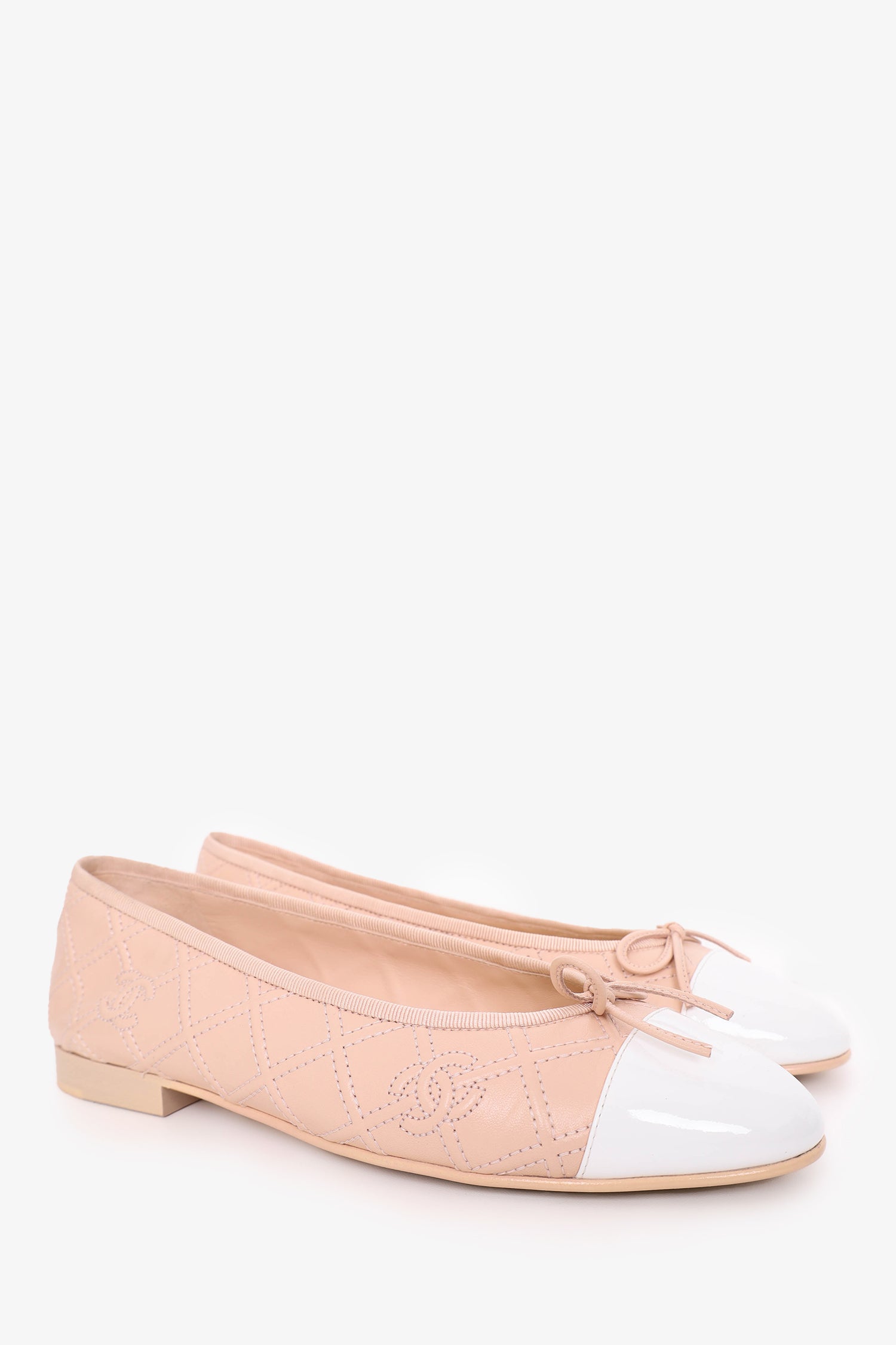 Pre-Loved Chanel™ Peach/White Quilted Leather and Patent Cap Toe Ballet Flats Size 39