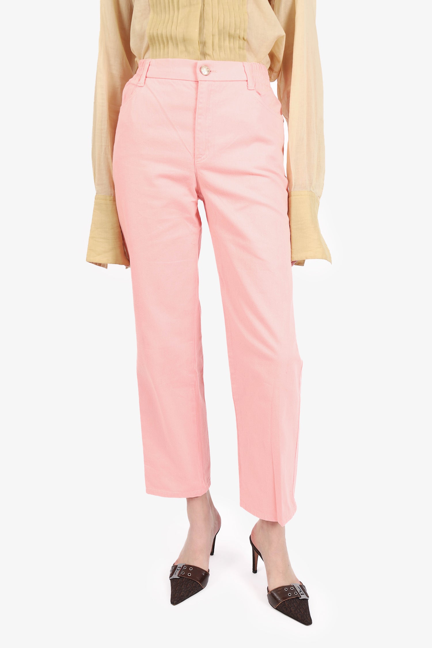Refresh availabilityPre-Loved Chanel™ Pink Denim Elasticated High-waist Pants. Front zip with button-up closure. 2 front and 2 rear slip pockets. Elasticated waist. Silver-tone hardware. Unlined. Tonal stitching.