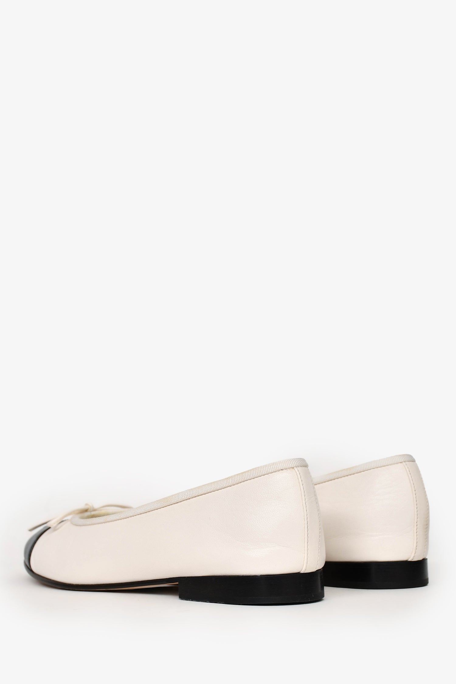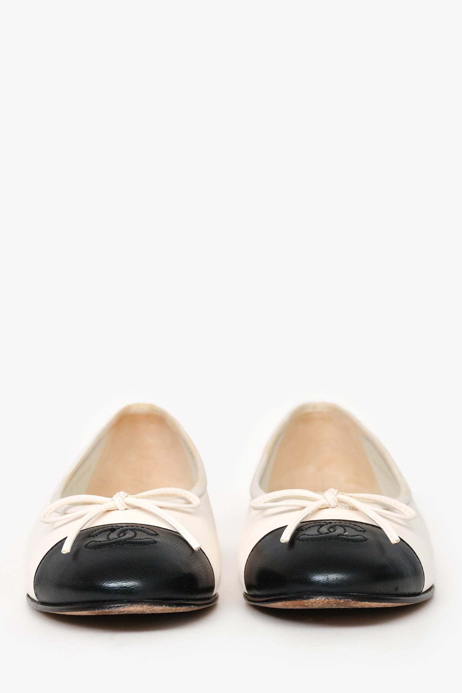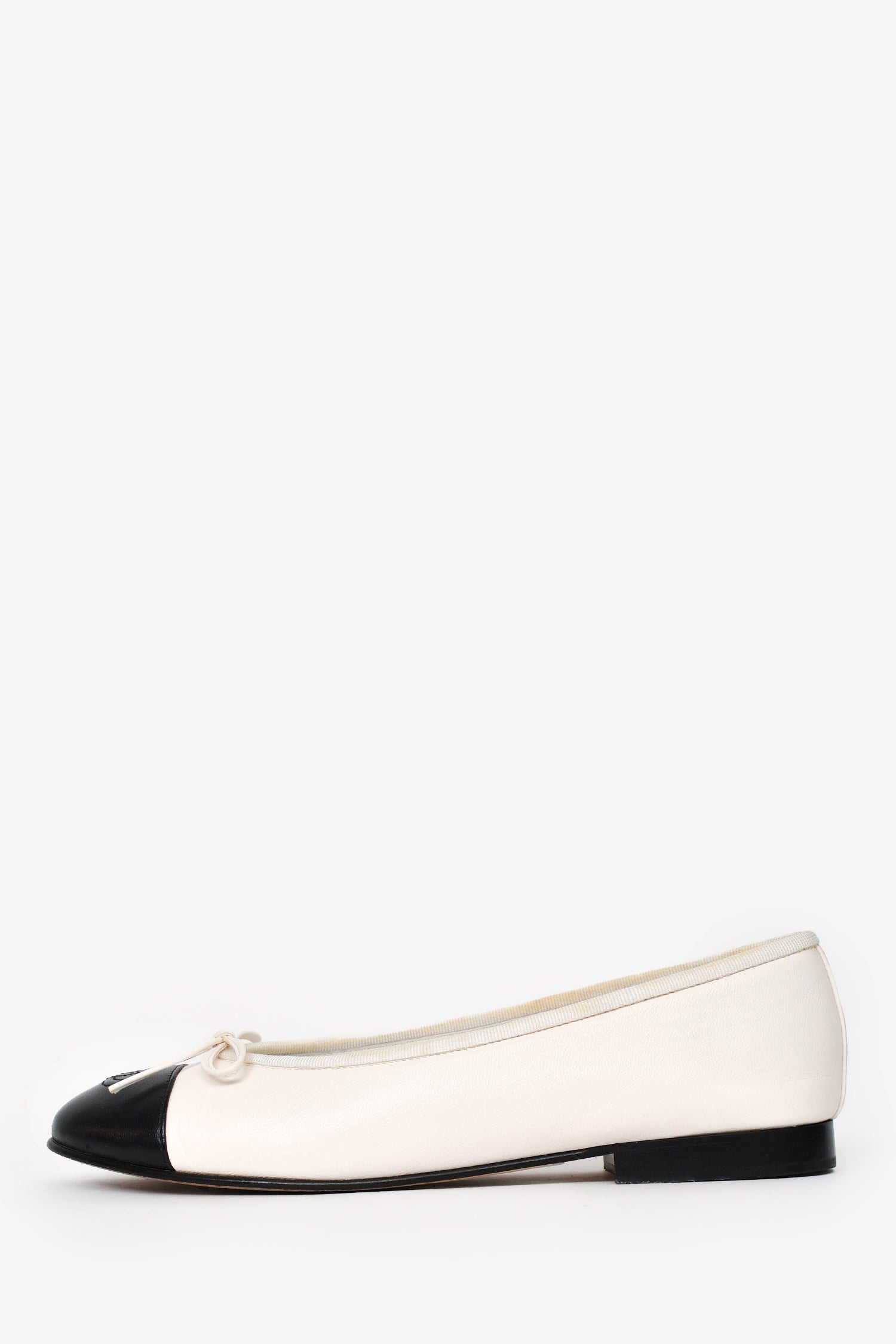 Refresh availabilityPre-Loved Chanel™ White/Black Leather CC Ballet Flats. Round-toe. Tonal stitching.