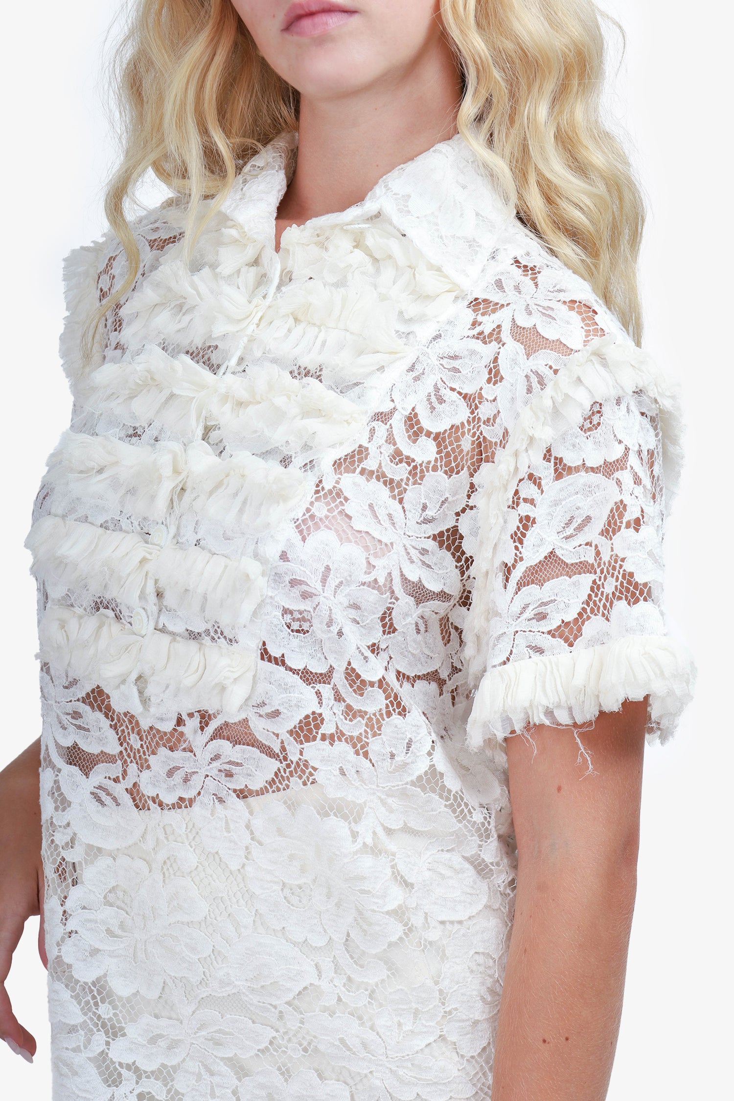 Refresh availabilityPre-Loved Chanel™ White Lace Ruffle Short-Sleeve Top. Front button up closure. Pull-on. Unlined. Tonal stitching.