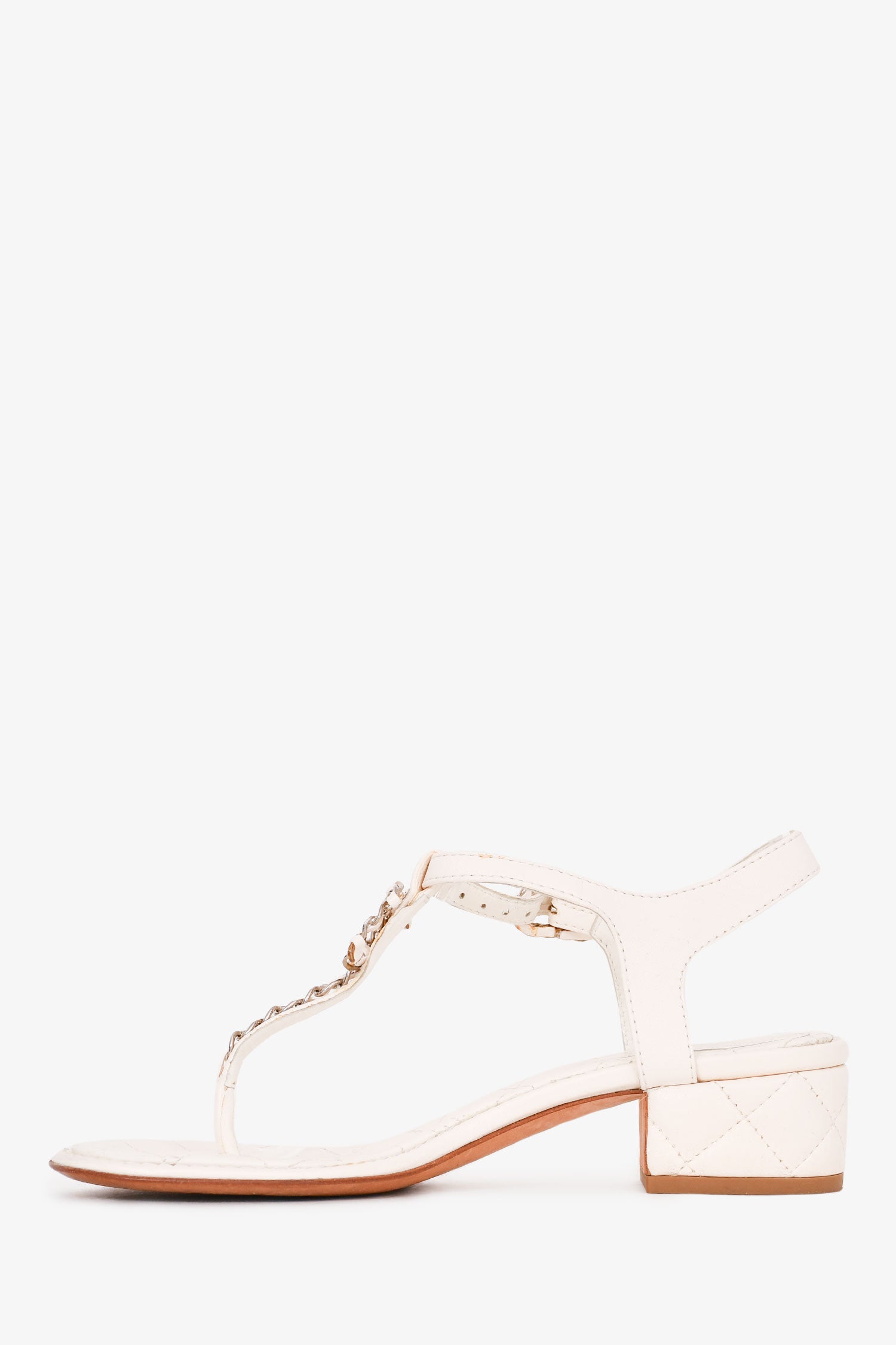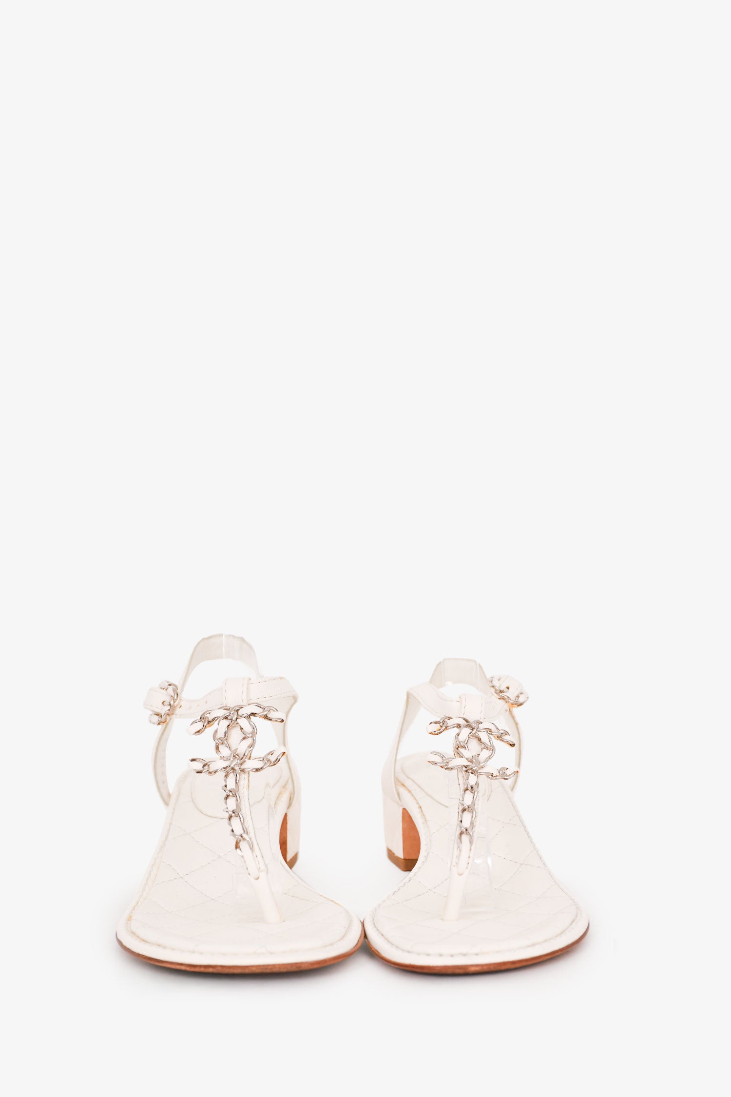 Pre-Loved Chanel™ White Lambskin Interlocking CC Chain T-Strap Sandals Size 5
